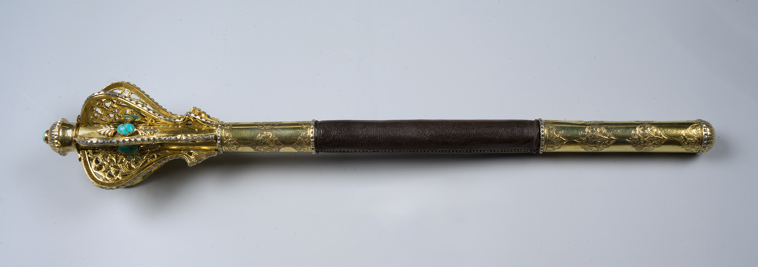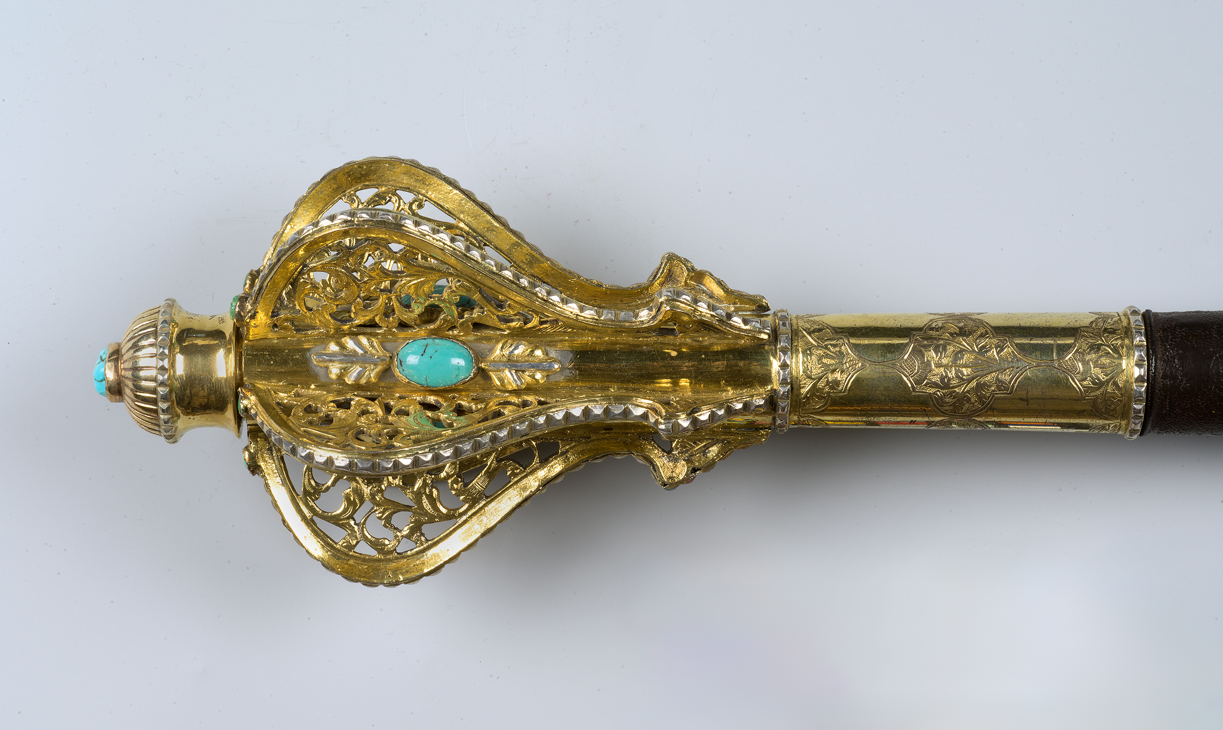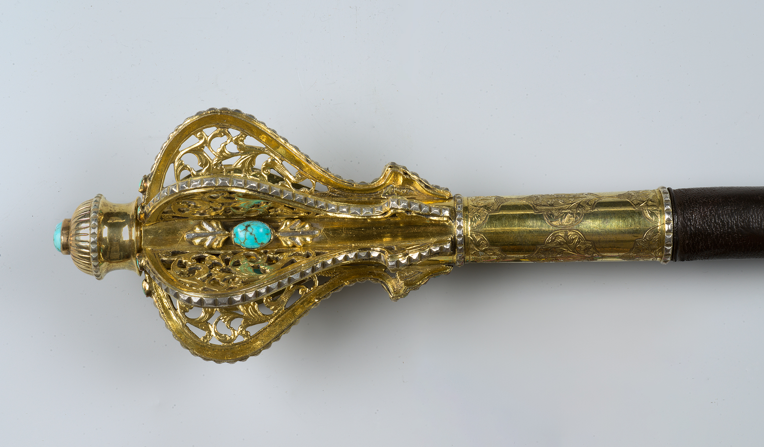 Buzdygan oficerski, nr inw. Wil.509, pochodzi z pierwszej połowy XVIII wieku. Rękojeść buzdyganu składa się z dwóch srebrnych i pozłacanych tulei osadzonych w górnej i dolnej partii drewnianego trzona. Środkowa część rękojeści obciągnięta jest czarną skórą. Każdą część trzona oddziela karbowany pierścień z metalu. Metalowe powierzchnie tulei zdobione są kartuszami, zawierają dekoracje ze stylizowanych motywów roślinnych. Takie zdobienia są charakterystyczne dla ornamentyki perskiej oraz tureckiej. Zakończenie trzonka stanowi głowica złożona z sześciu ażurowych piór o esowatym wykroju. Profile piór pokrywają bogate dekoracje roślinne: stylizowane, lancetowate, strzępiaste i mocno wygięte liście. Między piórami – na trzonie, na wierzchołkach piór oraz na szczycie głowicy widocznych jest sześć eliptycznych kaszt, w których osadzono turkusy.