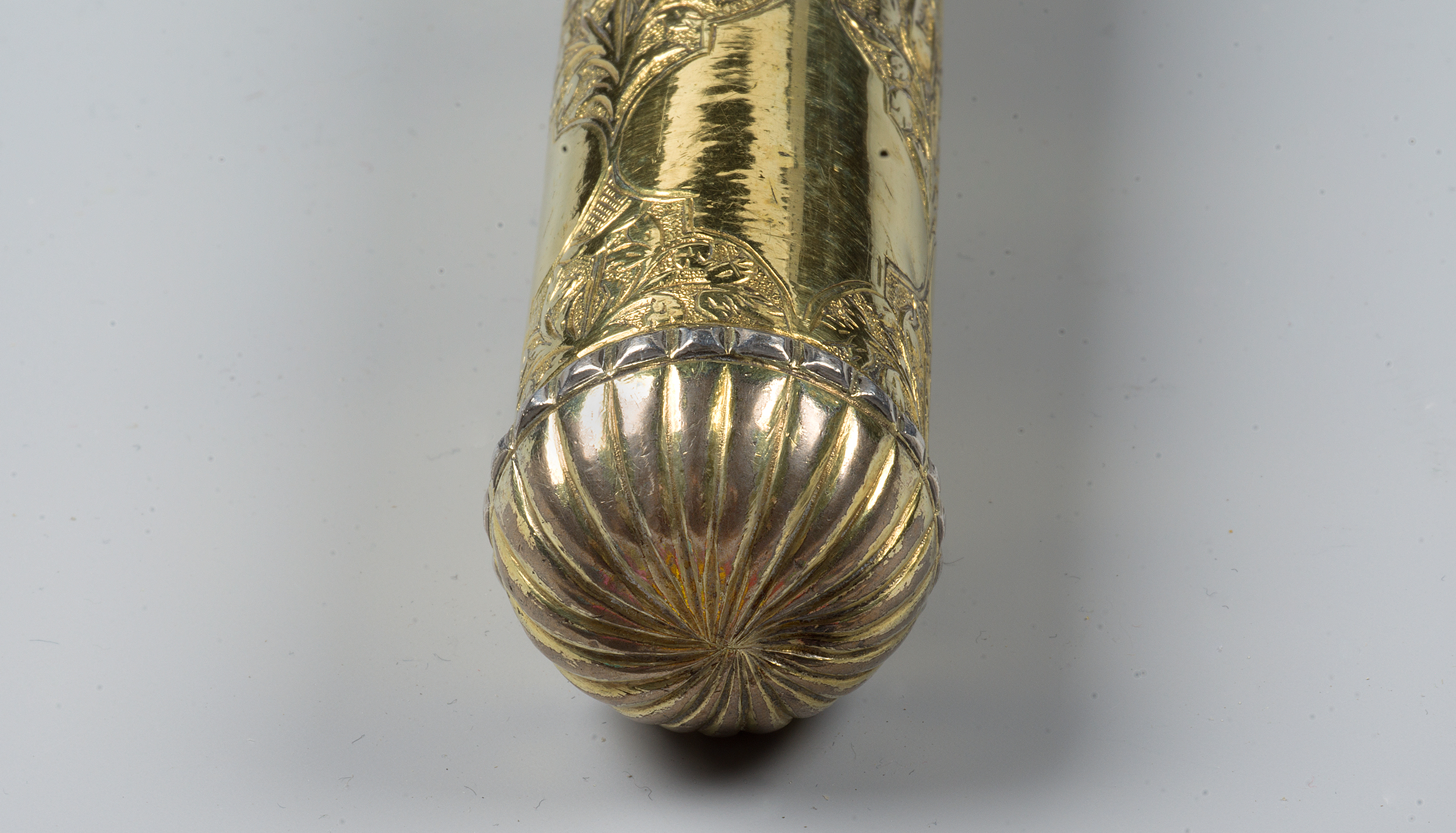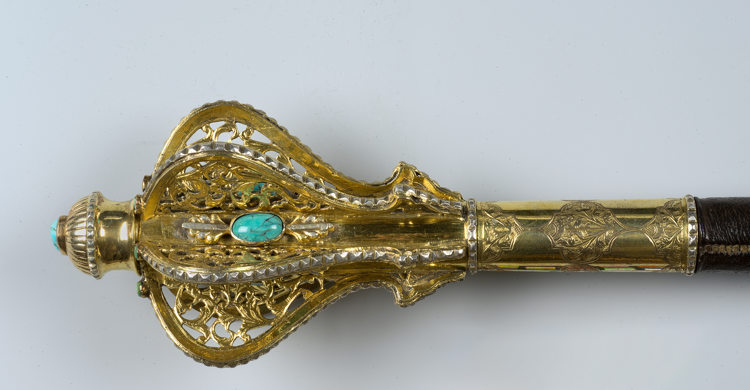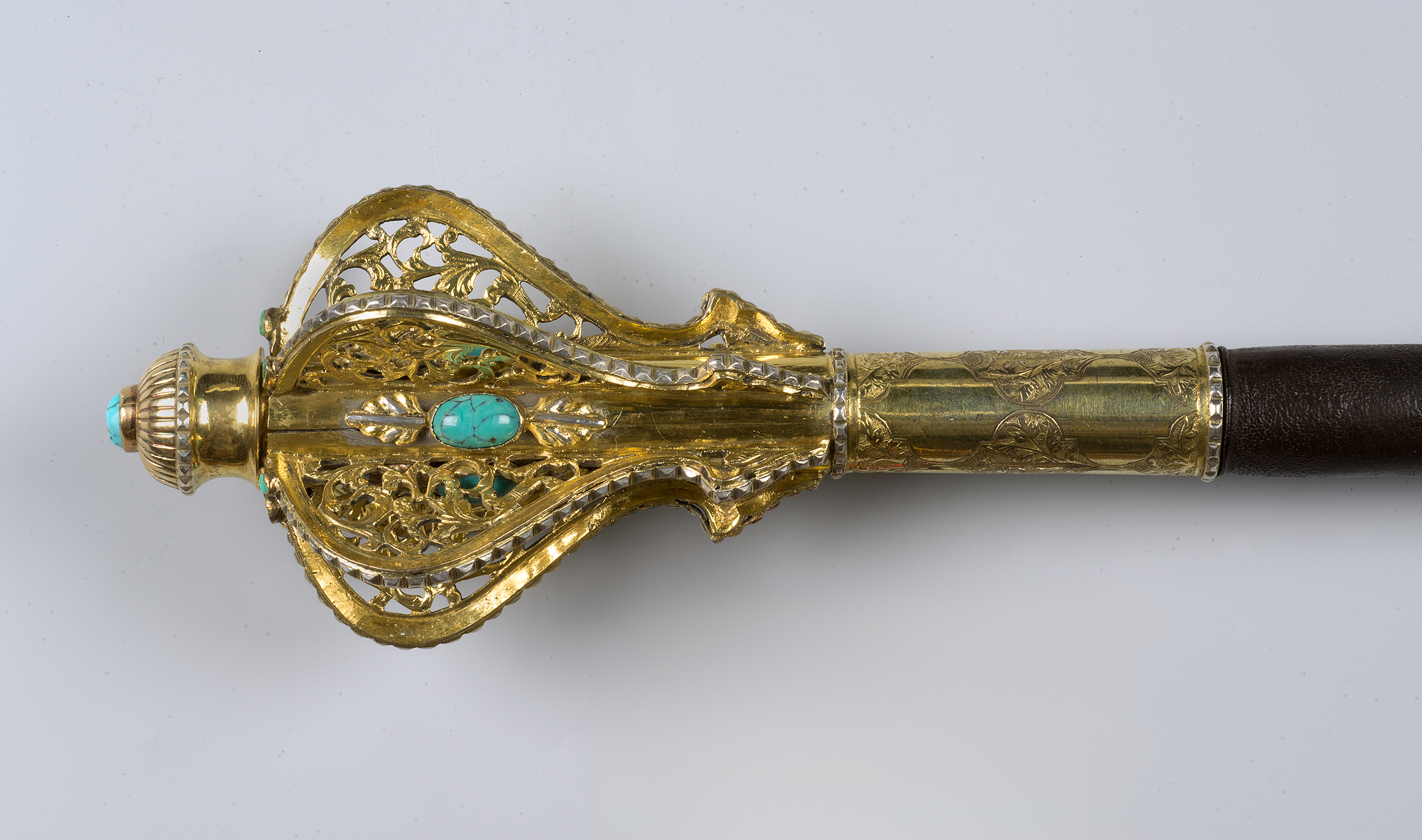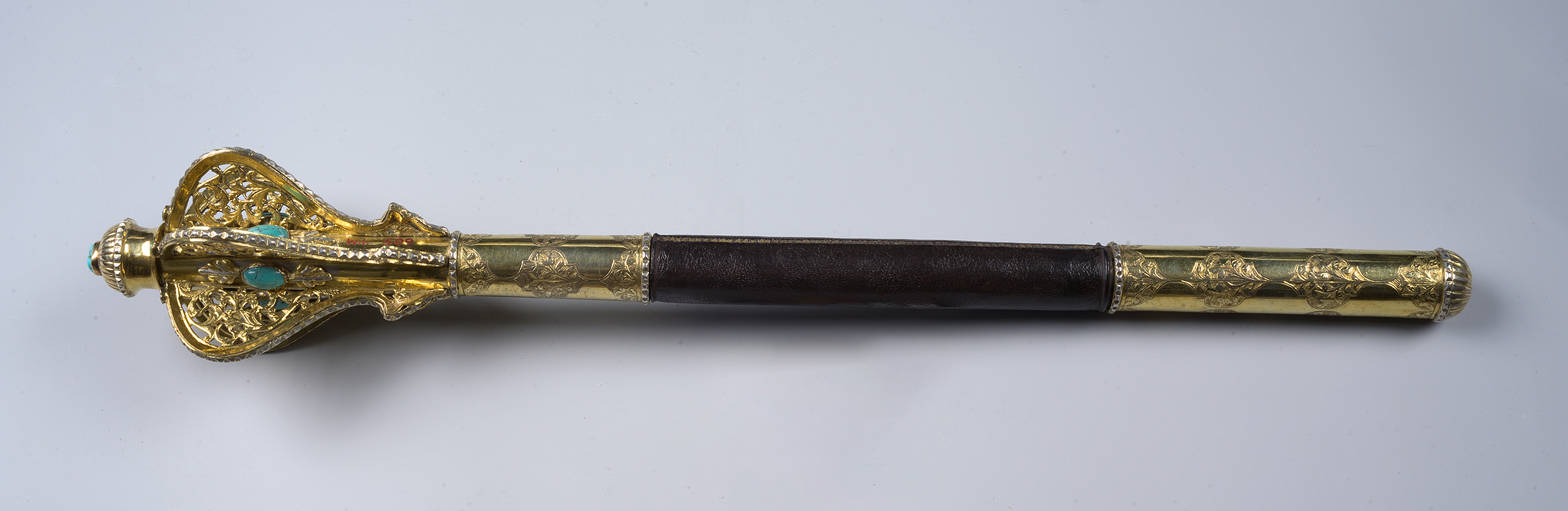 Buzdygan oficerski, nr inw. Wil.509, pochodzi z pierwszej połowy XVIII wieku. Rękojeść buzdyganu składa się z dwóch srebrnych i pozłacanych tulei osadzonych w górnej i dolnej partii drewnianego trzona. Środkowa część rękojeści obciągnięta jest czarną skórą. Każdą część trzona oddziela karbowany pierścień z metalu. Metalowe powierzchnie tulei zdobione są kartuszami, zawierają dekoracje ze stylizowanych motywów roślinnych. Takie zdobienia są charakterystyczne dla ornamentyki perskiej oraz tureckiej. Zakończenie trzonka stanowi głowica złożona z sześciu ażurowych piór o esowatym wykroju. Profile piór pokrywają bogate dekoracje roślinne: stylizowane, lancetowate, strzępiaste i mocno wygięte liście. Między piórami – na trzonie, na wierzchołkach piór oraz na szczycie głowicy widocznych jest sześć eliptycznych kaszt, w których osadzono turkusy.