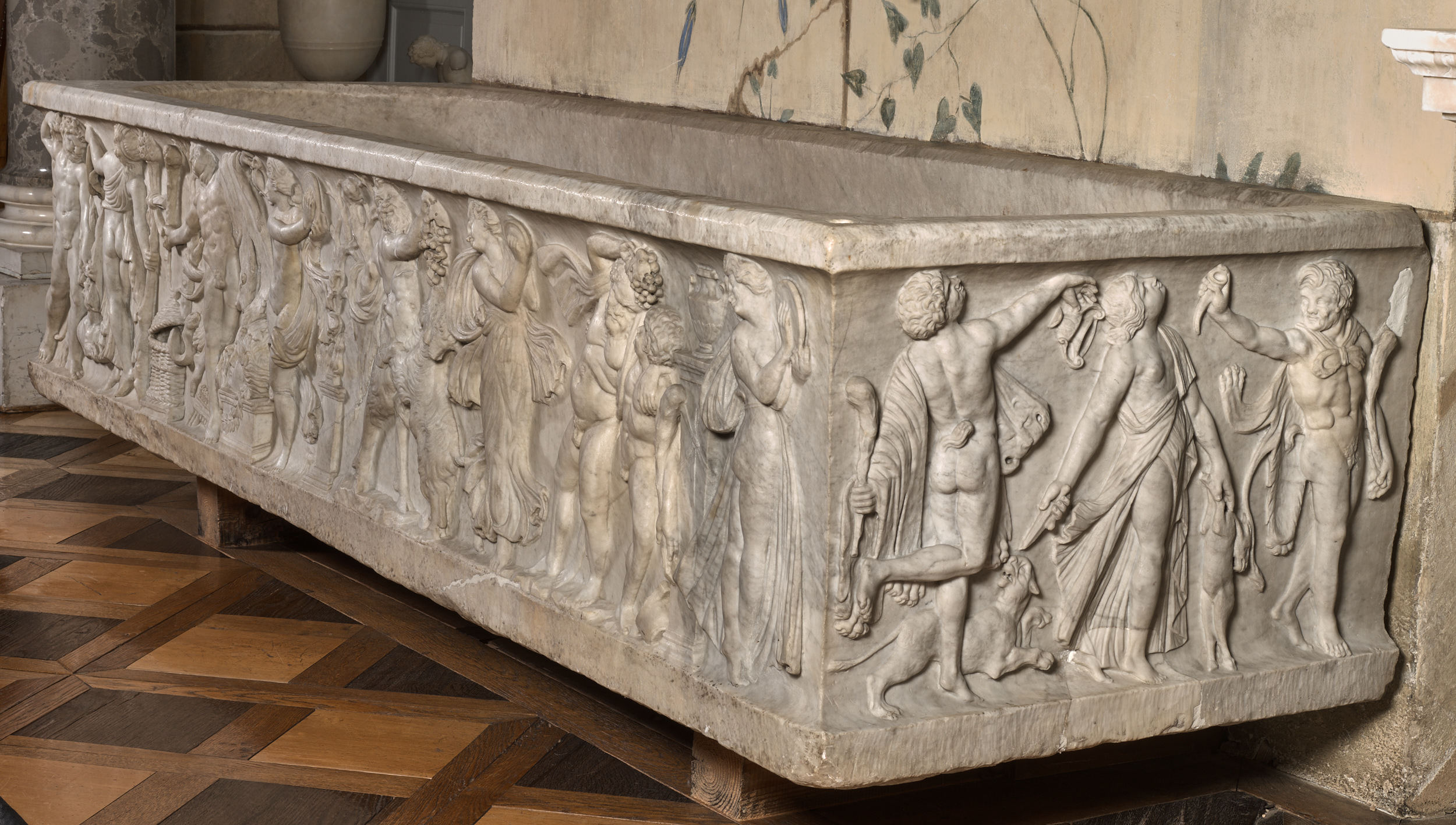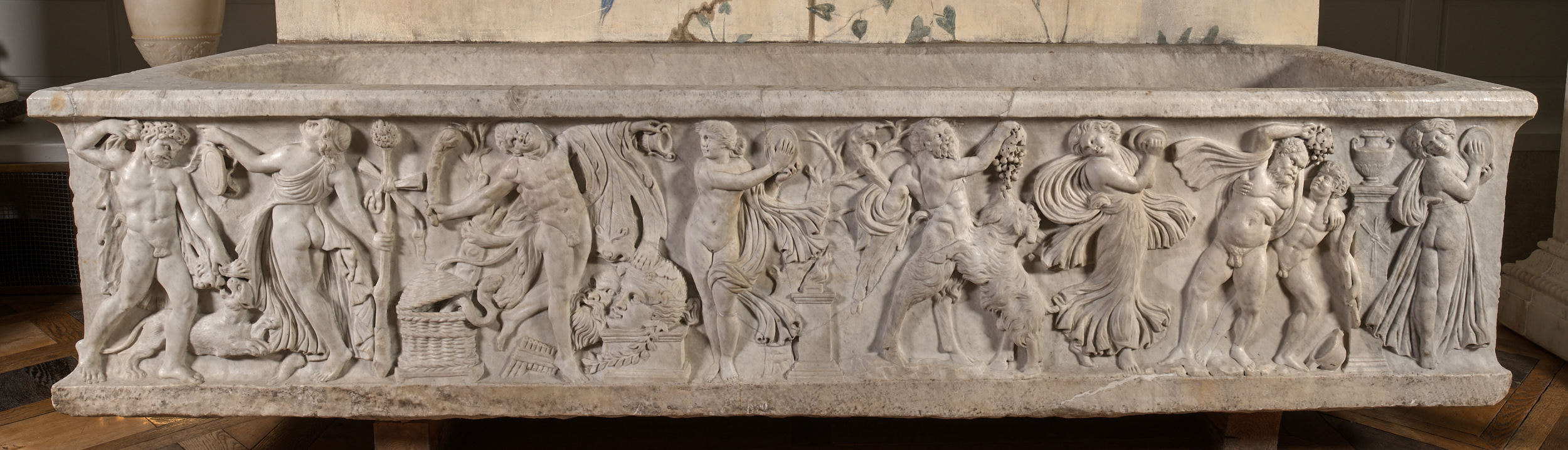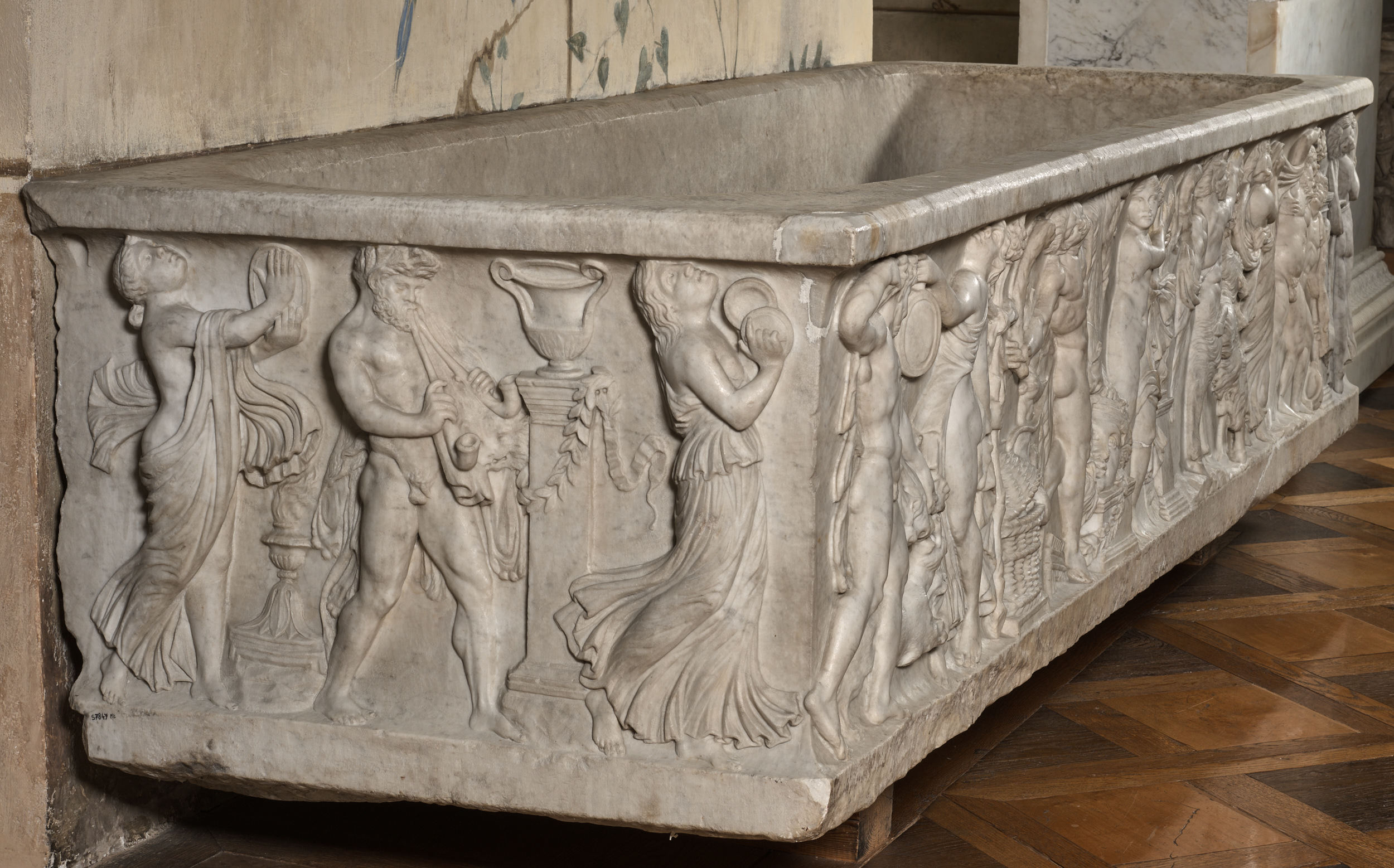 Sarkofag z przedstawieniem orszaku dionizyjskiego . Marmurowy sarkofag jest kopią marmurowego sarkofagu rzymskiego z II w. znajdującego się w zbiorach Museo Nazionale Romano w Rzymie. Oryginalny sarkofag znaleziono w 1885 r. podczas prac budowlanych na terenie należącym niegdyś do willi Bonaparte (przy Via Salaria, Piazza Fiume). Znajdował się w dwukomorowym grobowcu Pisonów, gdzie w tym samym roku odkryto łącznie dziewięć sarkofagów antycznych. Produkcja sarkofagów w Rzymie rozpowszechniła się w okresie panowania cesarza Hadriana (117 – 138 r.), na co wpłynęła zmiana w praktykach sepulkralnych: stosowanie inhumacji zamiast powszechnej dotąd kremacji. Odkryty w 1885r. sarkofag należy do typu tzw. sarkofagów rzymskich, przystosowanych do ustawienia przy ścianie grobowca, miały one kształt skrzyni i były zdobione z trzech stron. Sarkofagi rzymskie dekorowano reliefami figuralnymi, często o tematyce mitologicznej, popularny był repertuar bachiczny w postaci orszaku tańczących postaci. Łańcucki sarkofag wykonany został w końcu XIX w. w Rzymie, przez nieznanego rzeźbiarza. Jest w kształcie prostokątnej skrzyni, ma profilowany gzyms i wyodrębnioną u dołu gładką listwę. Ścianki od wewnątrz są zaokrąglone w narożach. Lewa ma kształt półkolistej niszy, w podwyższonym przy niej dnie skrzyni wydrążone jest miejsce na głowę. Na trzech ściankach zewnętrznych, na wgłębionym tle wyrzeźbiona jest kompozycja figuralna w reliefie wypukłym przedstawiająca orszak dionizyjski. Rozpoczynają go przedstawieni na lewej ściance bocznej kroczące i grające na instrumentach muzycznych dwie menady i satyr. Na ściance frontowej ukazane są cztery menady grające na instrumentach muzycznych, w tanecznych pozach, w parach z biegnącym satyrem z panterą u jego nogi, tancerzem trzymającym puchar Dionizosa, bożkiem Panem i pijanym sylenem podtrzymywanym przez satyra. Pośrodku tych postaci znajduje się mały czworoboczny ołtarz z płonącym kadzidłem. Orszak kontynuują trzy postacie na prawej ściance bocznej: tańczący mężczyzna trzymający w ręce naczynie do picia wina, menada z martwym kozłem w ręku, satyr z naczyniem do picia wina w kształcie rogu. Sarkofag nabyty został zapewne przez Romana Potockiego (1851r.-1915r.), dawnego właściciela zamku, we Włoszech. Wpierw wystawiony był w urządzonym przy zamku w 1899 r. Ogrodzie Włoskim, później przestawiono go do Ogrodu Różanego. W muzeum eksponowany jest w Galerii Rzeźb.