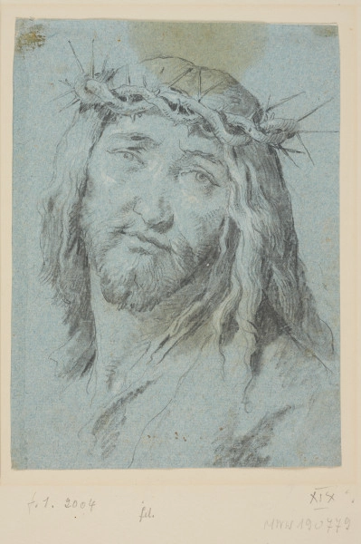 Rysunek Giandomenica Tiepola przedstawia zwrócone w lewo popiersie męczonego Chrystusa, którego głowa skłania się w bok. Spojrzenie Chrystusa, skierowane do widza, przepełnione jest bólem cierpienia zadawanego przez kolce korony cierniowej, wbijające się w jego czoło. Georg Knox, badacz twórczości artystów z weneckiej rodziny Tiepolów uważa, że studium powstało w okresie pracy Giandomenica w Würzburgu w latach 1751–1753. Niejednokrotnie podejmował tematy Pasji. Był autorem czternastu obrazów olejnych z cyklu „Droga Krzyżowa” przeznaczonych do Oratorio del Crocifisso, kościoła San Polo w Wenecji. Według tego cyklu w latach 1747–1749 wykonano akwaforty. Pracując w Madrycie Giandomenico namalował do kościoła św. Filipa Nereusza cykl obrazów „Męka Chrystusa” ukończony w 1771 roku. Z tym cyklem może być związany również obraz Ecce Homo przechowywany w Fine Arts Gallery w San Diego. Możliwe, że szkic znajdujący się w szczecińskim muzeum powstał w trakcie pracy nad tym tematem, o czym świadczy sposób przedstawienia głowy Chrystusa i jego wyrazista twarz odzwierciedlająca nie tylko boleść, ale i pragnienie współczucia. Takie pełne ekspresji spojrzenie znane jest tylko z tego jednego rysunku Giandomenica i nie ma odpowiednika w innych jego pracach o tematyce pasyjnej.