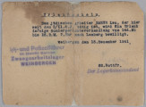 Przepustka urlopowa (Urlaubschein) - dla Leona Habera jako żydowskiego więźnia Zwangsarbeitslager Wienbergen, wystawiona przez komendanta obozu. 1 karta zapisana jednostronnie na maszynie. Podpis bardzo wyblakły, ale dość czytelny: Lissau [?], poniżej pieczątka: Der Lagerkommandant