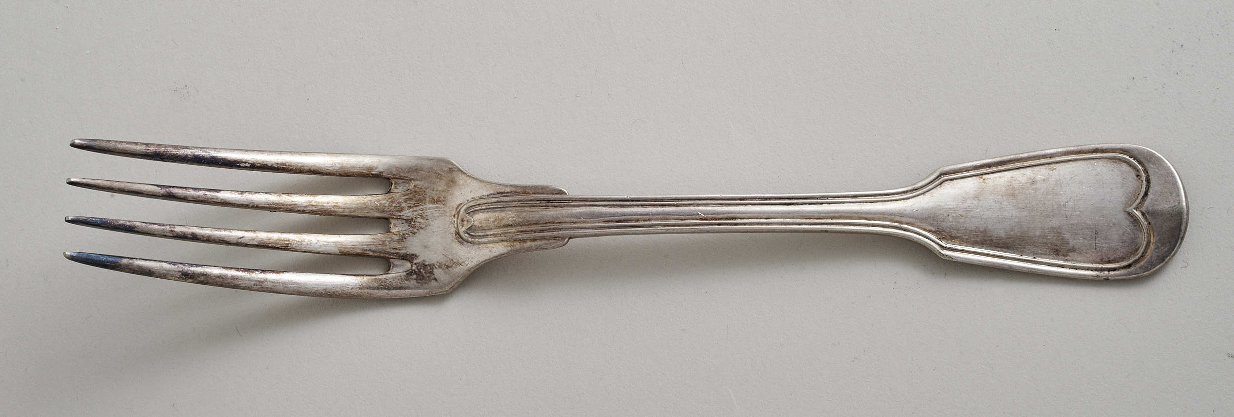 Czterozębny widelec stołowy posiada płaski trzonek z rozszerzonym zakończeniem ozdobiony podwójnym profilowaniem. Na rewersie w dolnej części trzonka widoczna jest korona hrabiowska a pod nią herb Potockich - Pilawa. Po bokach symetrycznie rozmieszczone litery R i P a pod herbem widoczna szarfa z napisem „Julin”. Ponadto na przewężeniu trzonka, od spodu wybito punce i stempel producenta „Christofle”.