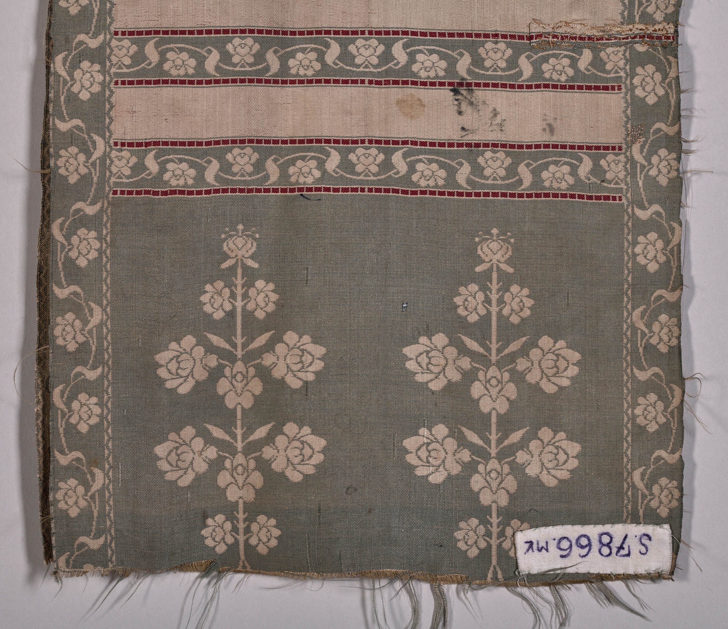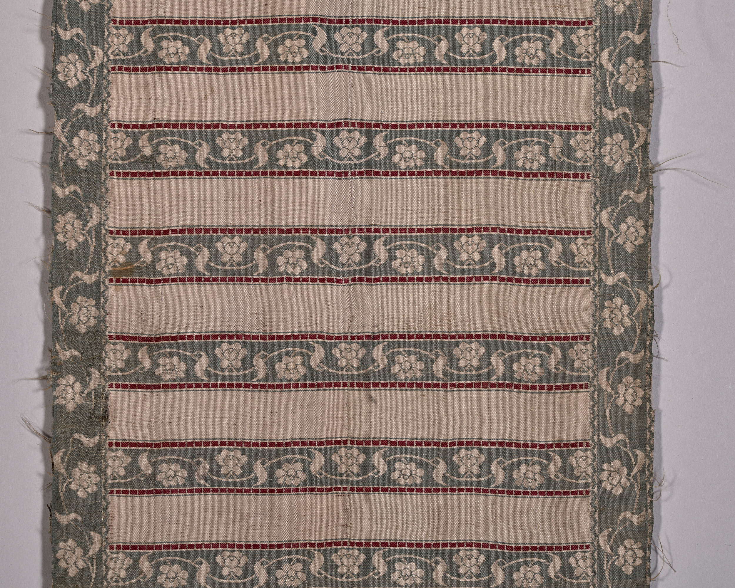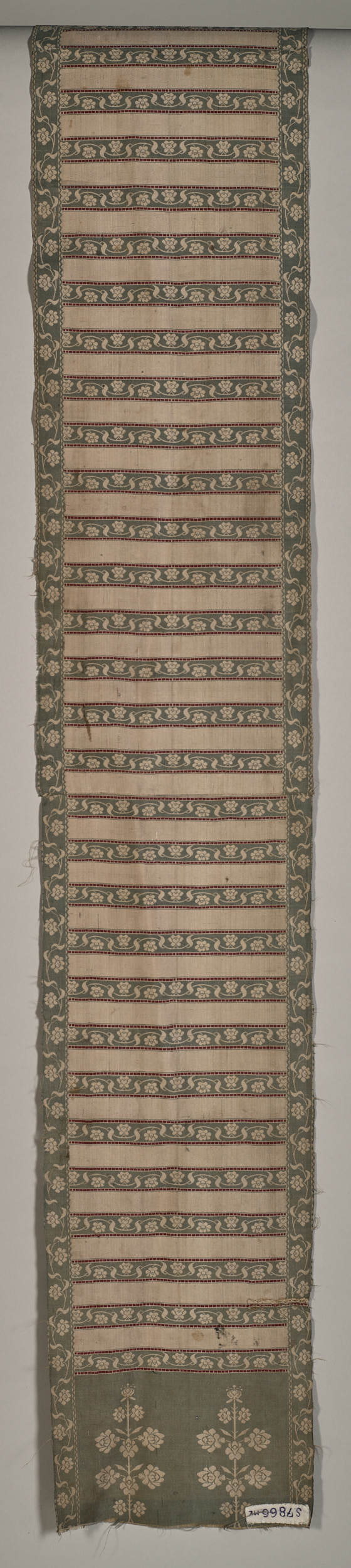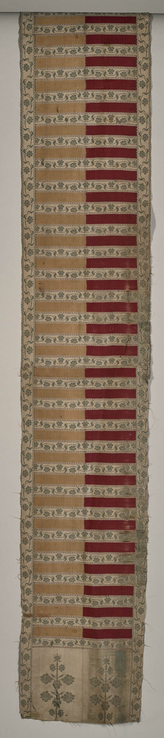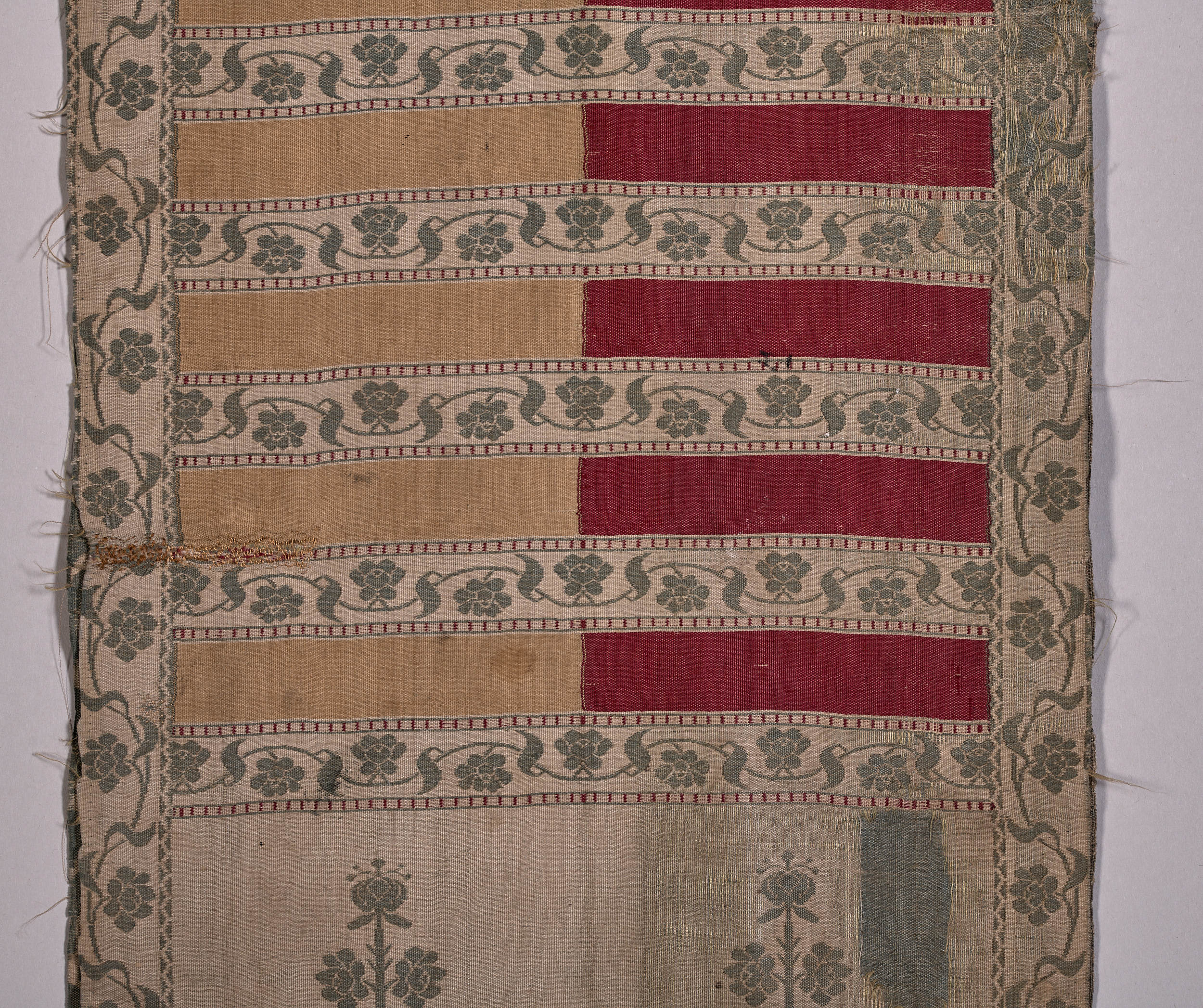Pas kontuszowy jedwabny dwustronny, utrzymany w pastelowych kolorach – seledynowym, żółtym, bordowym, seledynowo – beżowym. Tak zwany „wciąż pasa” czyli jego najdłuższa część zdobiona poprzecznymi pasami – „pólkami”. Pólka dekorowane na przemian raz ornamentem wiciowo – kwiatowym pochodzenia perskiego w kolorze seledynowym na beżowo – seledynowym tle, raz gładkim pasem w kolorze do połowy żółtym, dalej bordowym. Wszystkie pólka od siebie oddzielają wąskie pasy beżowo – bordowe. Dekoracja obwodu w kwiaty i drobne liście. Końce, czyli „głowy” pasa zdobione dekoracją przedstawiającą wysuszony kwiat – inspiracja z ornamentem ormiańskiego tetraewangeliarza z 1707 roku (oryginał przechowywany w Berlinie). Druga strona pasa w kolorach odwróconych (tzw. contre partie), o tym samym ornamencie. Pas gęsto tkany, jedwab. Polska, Kresy, część południowo-wschodnia. Datowany na koniec XVIII wieku.