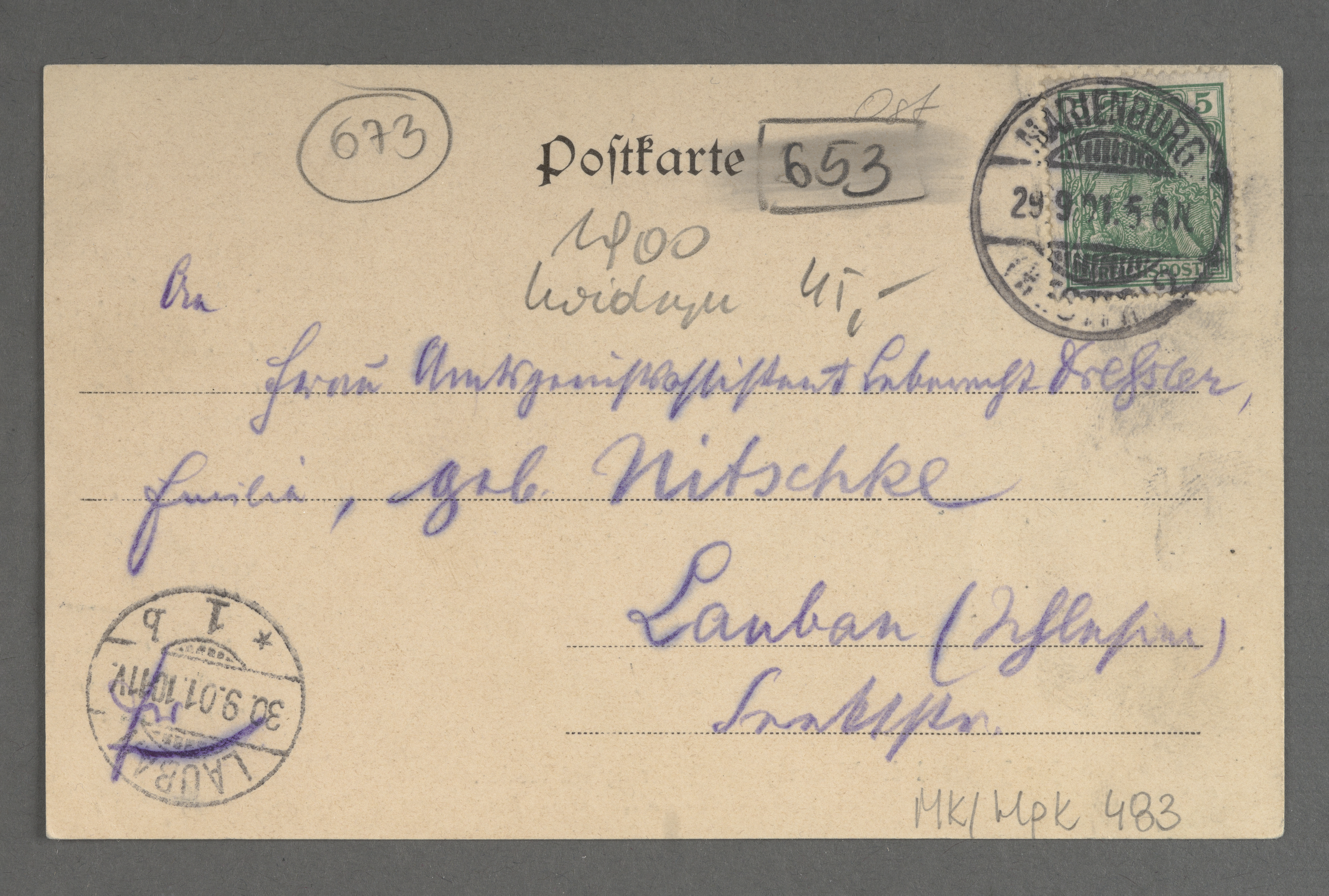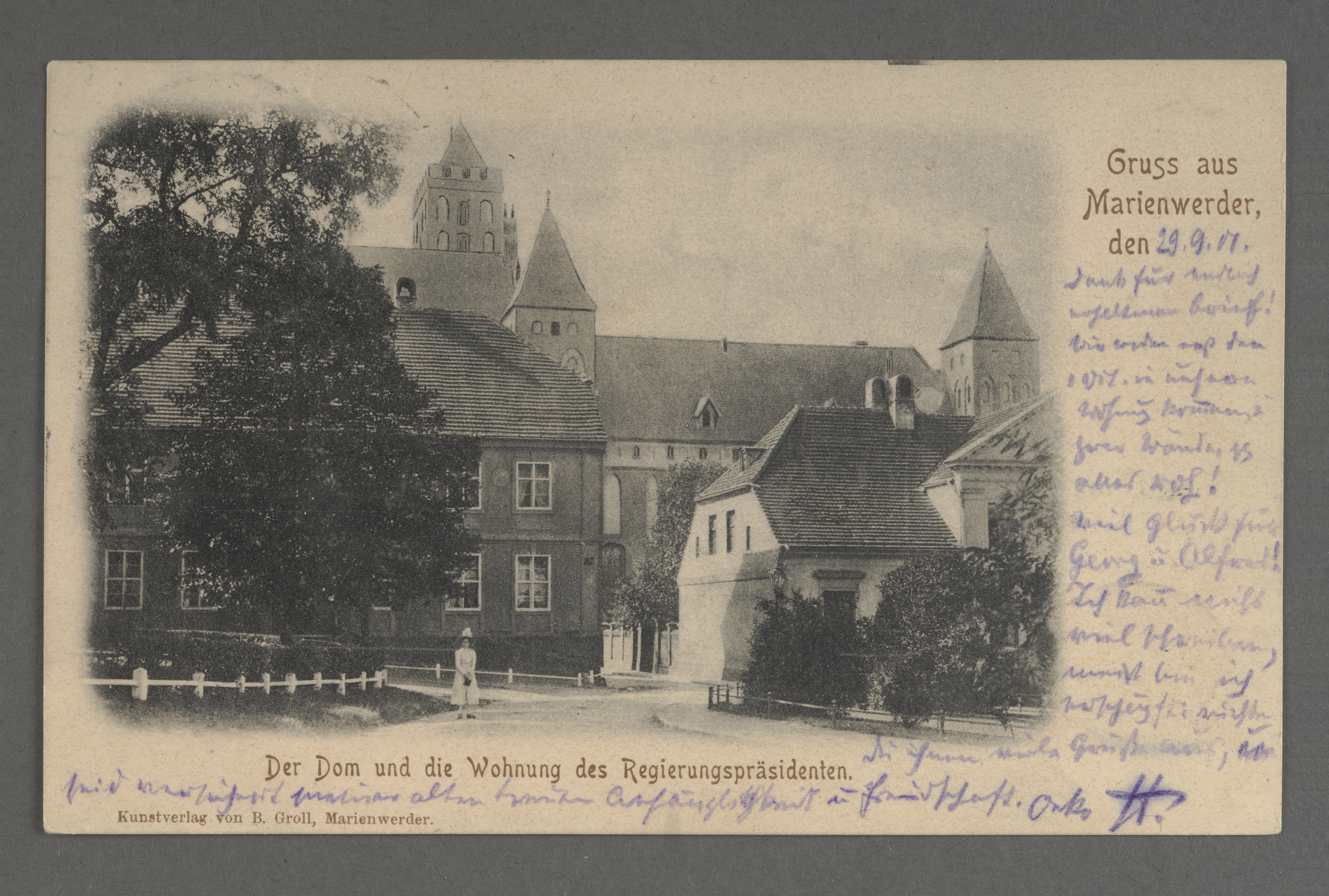 Widokówka „Gruss aus Marienwerder. Der Dom und die Wohnung des Regierungspräsidenten” („Pozdrowienia z Kwidzyna. Katedra i mieszkanie prezydentów rejencji”) ukazuje krajobraz Placu Rejencyjnego (dawniej Plac Zamkowy) z budynkami na tle ujętego fragmentarycznie zespołu katedralno-zamkowego. Kartka została wysłana z Malborka do Lubania (Lauban) na Dolnym Śląsku w dniu 29 września 1901 roku. Należy ona do odrębnej grupy pocztówek, tzw. „Gruss aus…” („Pozdrawiania z…”), które popularne były pod koniec XIX i na początku XX wieku. Produkowało je lokalne wydawnictwo i drukarnia Kunstverlag B. Groll, Marienwerder, Wpr. Korzenie tego kilkupokoleniowego, wielobranżowego przedsiębiorstwa, które swoją główną siedzibę miało przy Marienburger Strasse 43 (ob. ul. Braterstwa Narodów), sięgają 1838 roku.