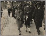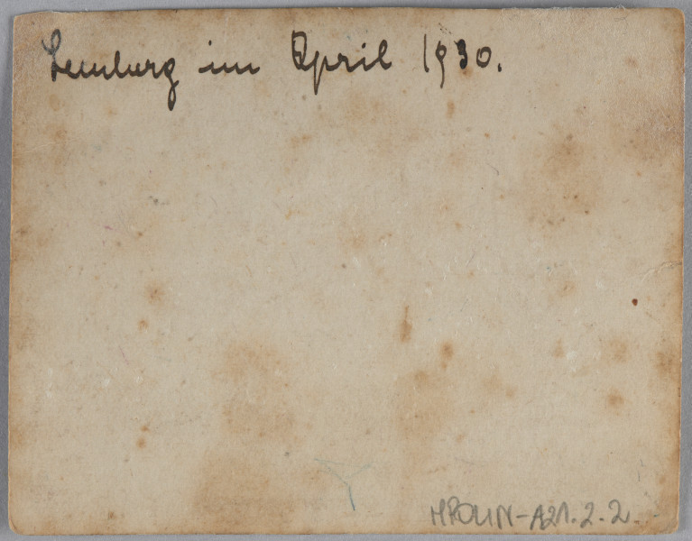 Fotografia Haberów – Grety po lewej, córki Krystyny trzymanej za rękę oraz Leona po lewej – na chodniku we Lwowie, jak wynika z podpisu na odwrocie, w ulicznym tłumie. Wszyscy troje mają nakrycia głowy. Widoczny u góry fragment białego napisu – z zakładu fotograficznego?