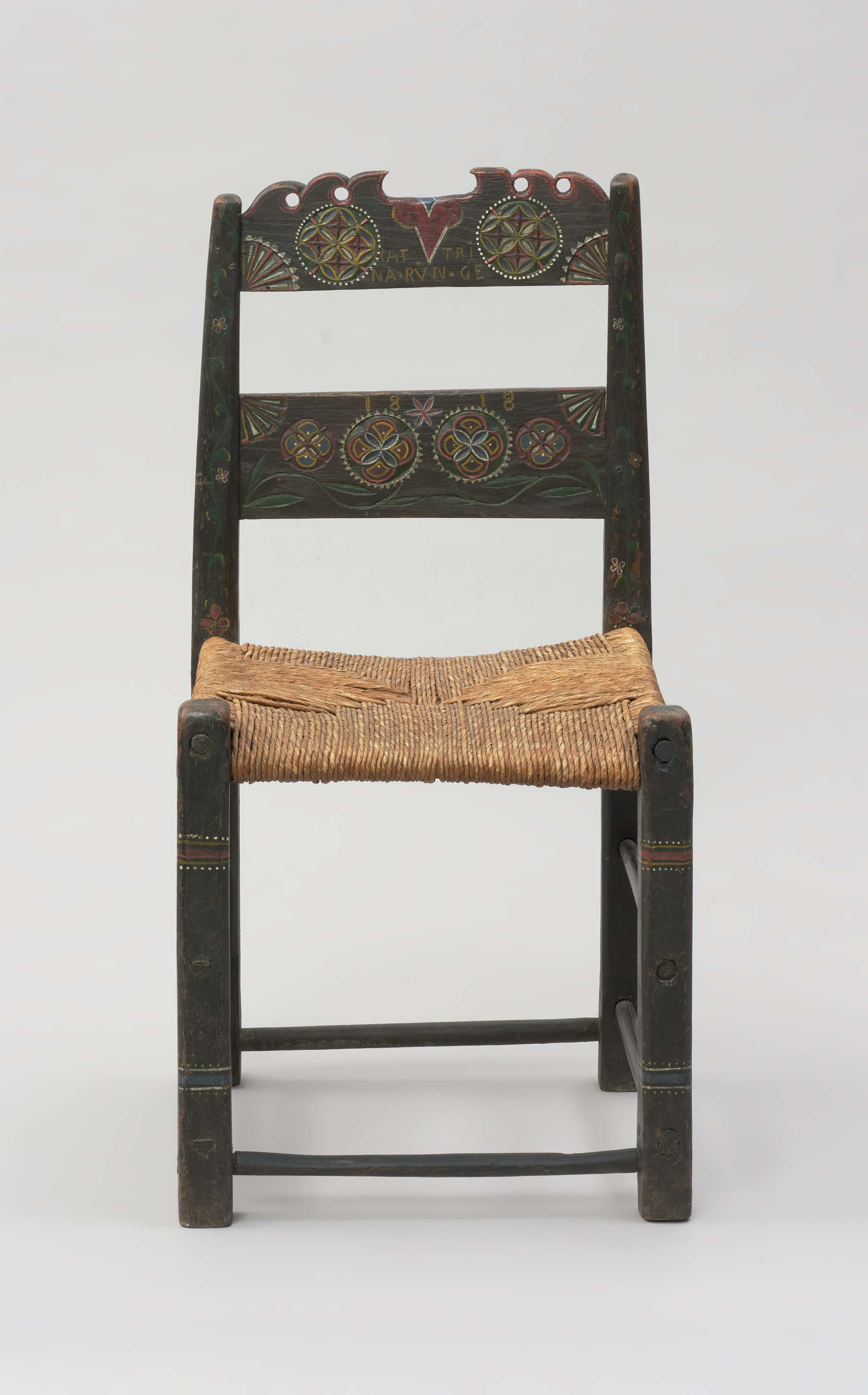 Pomorze Zachodnie jest regionem, w którym wykształciło się wiele form mebli służących do siedzenia. W skład wyposażenia pomorskich chałup wchodziły długie ławy, zydle z ozdobnie wycinanymi oparciami oraz krzesła z siedziskami wyplatanymi z dartych korzeni drzew, słomy lub wikliny. Te ostatnie jeszcze całkiem niedawno były sprzętami reprezentacyjnymi, zasiadać mógł na nich gospodarz lub ważni goście. W kulturze rybackiej Pomorza Zachodniego krzesła pełniły również ważną rolę społeczną – były meblami wiannymi. Krzesło przeznaczone na posag bogato zdobiono i umieszczano na nim datę (rok) zawarcia małżeństwa. Często też podpisywano je imieniem i nazwiskiem właścicielki. W czasie zaślubin odgrywał ono niepoślednią rolę – sadzano na nim pannę młodą podczas obrzędu przejścia ze stanu panieńskiego w zamężny, bardzo istotnego w wierzeniach ludowych. Po zakończonej ceremonii krzesło trafiało do domu małżonków i wchodziło w skład ich wspólnego majątku. Krzesła wykonywane były w warsztatach przez stolarzy, ich zdobieniem zajmowały się najczęściej żony i córki rzemieślników. Wykonywały one kunsztowne, wielokolorowe malatury „z ręki” lub za pomocą wzorników. W zbiorach Działu Etnografii Muzeum Narodowego w Szczecinie znajduje się pokryte przepiękną bogatą malaturą krzesło z 1818 roku. Ma ramową konstrukcję i siedzisko wykonane ze słomy techniką plecionkarską. Umieszczona na krześle data oraz kobiece imię i nazwisko Cattrina Runge, wskazują, że było meblem przeznaczonym na posag. W kolorowej dekoracji, złożonej z czerwonego serca oraz rozet, można odnaleźć sens symboliczny i dopatrywać się życzeń szczęścia, płodności i witalności dla młodej pary. Znaki solarne, sprawiające wrażenie „wirujących”, miały strzec małżonków i ich domostwo przed złymi mocami. Dekoracja uzupełniona jest o wijące się gałązki z kwiatami. Według informacji zapisanej w księdze inwentarzowej krzesło pochodzi z powiatu gryfickiego.