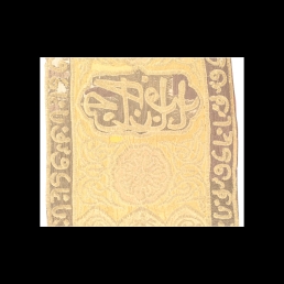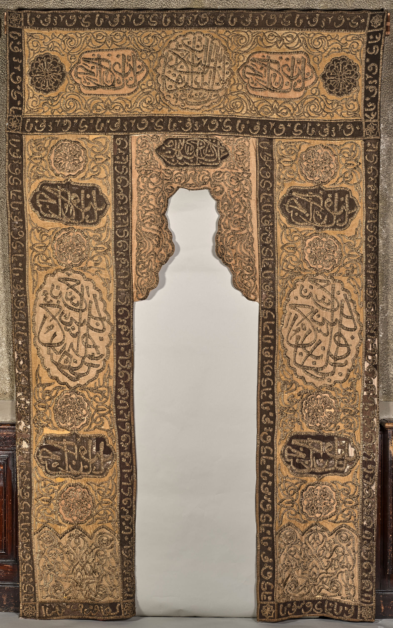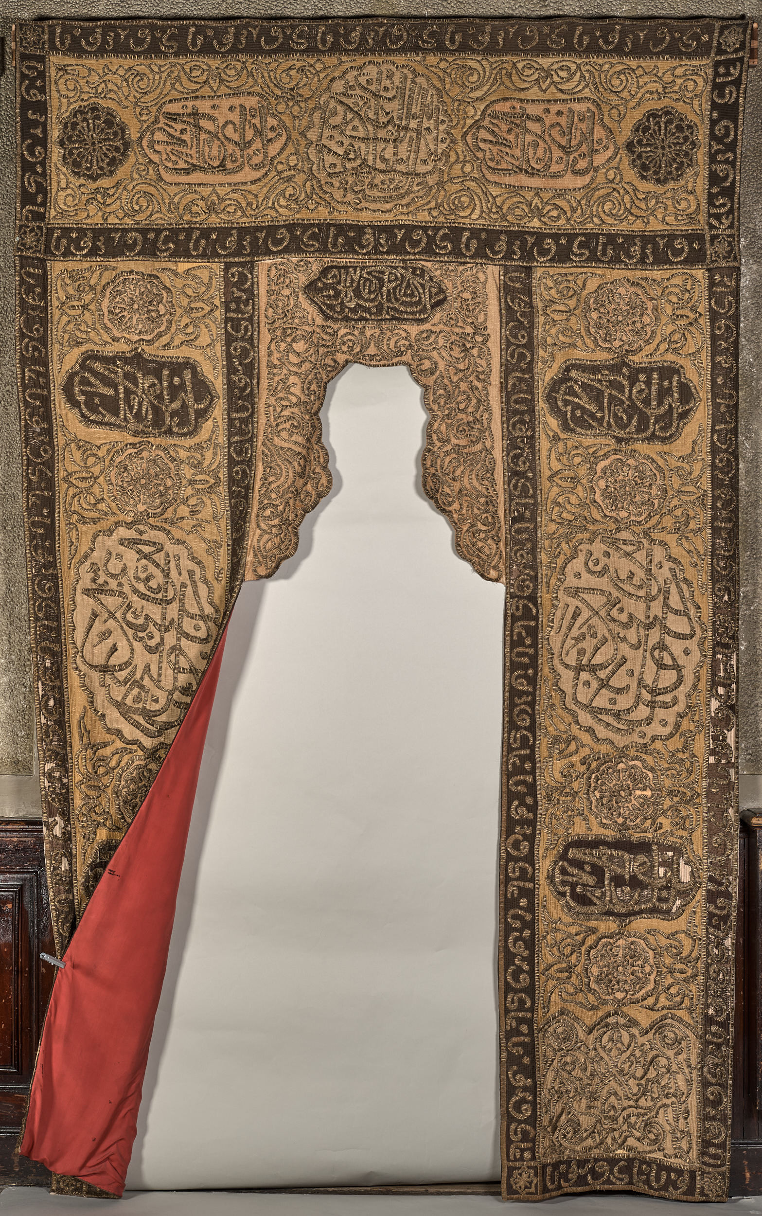 Portiera – tkanina wschodnia z wersetami w języku arabskim, haft płaski na jedwabiu, Bliski Wschód, XVIII/XIX w. Portiera to zasłona drzwi lub okna z ciężkiego materiału, chroniącego przed chłodem lub tylko o charakterze ozdobnym. Portiera mihrabowa z zamku jest prostokątna, podzielona wąskim pasem bordiury na cztery pola, w odcieniach beżowo -złotych, z akcentami ciemnego brązu. Jeden z pasów tworzy rodzaj supraporty – górnego zamknięcia kompozycji nad drzwiami. Pozostałe trzy pasy pionowe zdobią wejście, środkowy, krótszy odsłania wnękę drzwiową. Jest zakończony łukiem mihrabu. Mihrab to nisza, zwykle na planie półokrągłym lub wielobocznym, znajdująca się w sali modlitw w meczecie. Nisza ta wskazuje kierunek Mekki -wyznacza konkretną stronę świata, w kierunku której wierni powinni się zwracać podczas modlitwy. Dekorowana jest ręcznym haftem kładzionym, półpłaskim, wykonanym złotą nitką metalową na półjedwabnym tle. Osnowa jedwabna, wątek jedwabno - bawełniany. Zwykle jest bogato zdobiona. Bordiura w kolorze ciemnego brązu, na tle którego przebiega złoty ornament, złożony ze znaków pisma arabskiego. Na haftowaną dekorację składają się trzy rodzaje medalionów oraz motyw taśmowych zwojów, tworzących maureskę. W pole supraporty wkomponowano pięć medalionów, z których środkowy (największy) zawiera werset, pozostałe rozłożone są po jego bokach. Inskrypcja zapisana w języku arabskim brzmi: „Panie, który otwierasz wszystkie drzwi, Ty, Pan Wszechświata, udziel nam zwycięstwa/otwórz wszystkie drzwi” oraz „Nie stworzyłem dżinów, a ludzie zgodzili się czcić Mnie Samego”. Napis przeznaczony był do odczytu w lustrze – pismo w odbiciu lustrzanym. Tkanina półjedwabna, która stanowiła tło dla haftu wzmocniona została od spodu cienkim lnem. Całość podszyta jest podszewką w kolorze różowym. Tkanina pochodzi z Bliskiego Wschodu, z XVIII/XIX wieku.