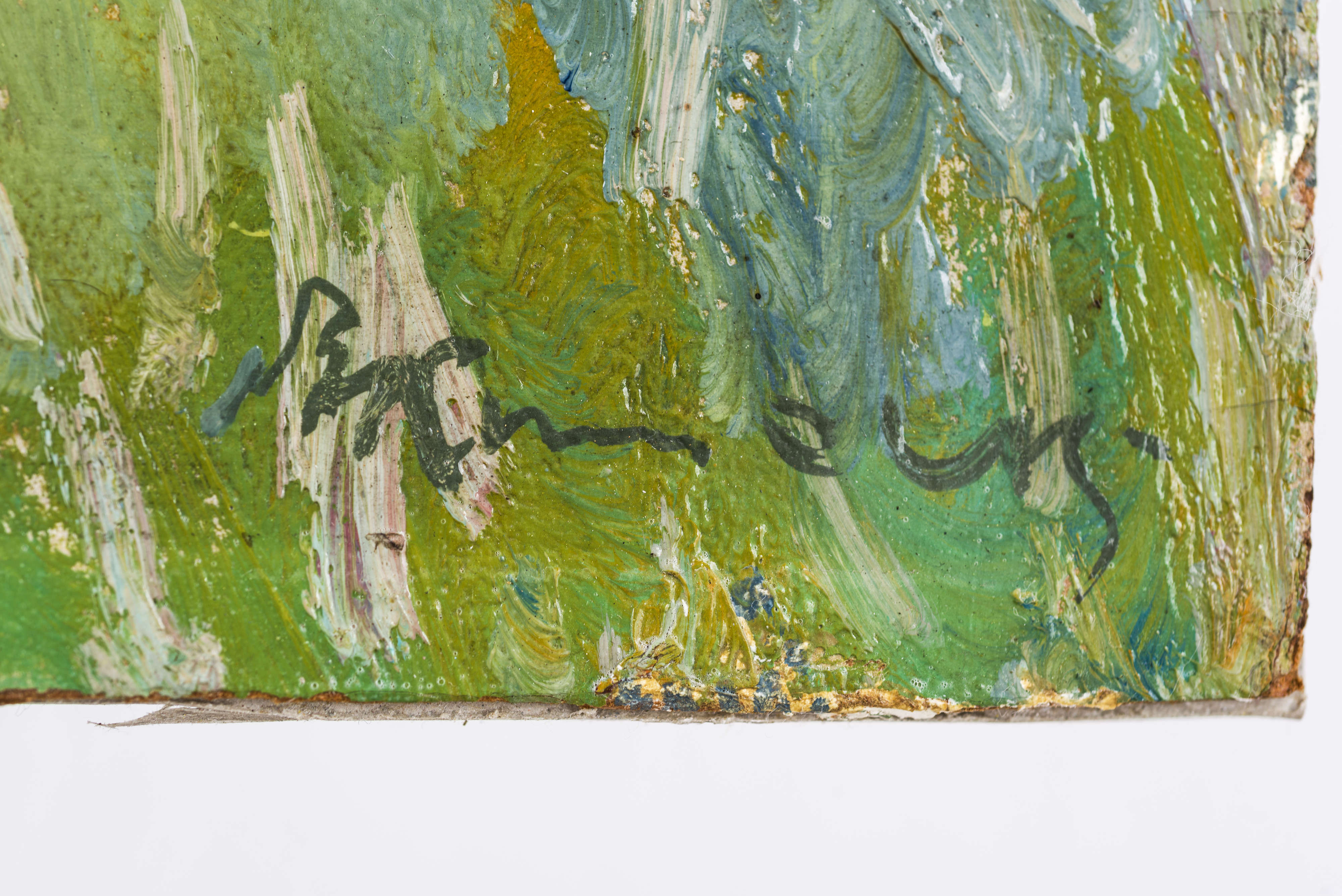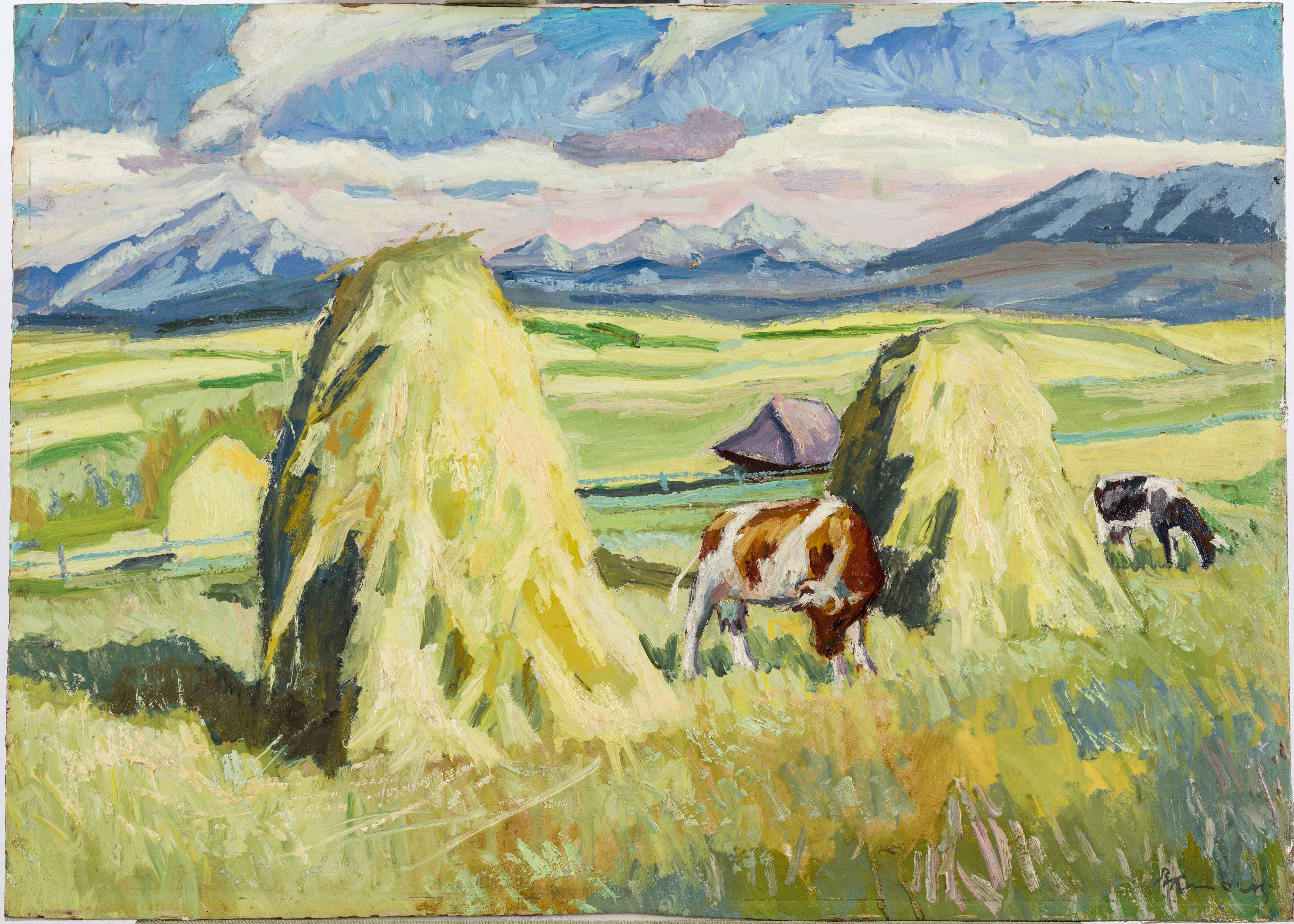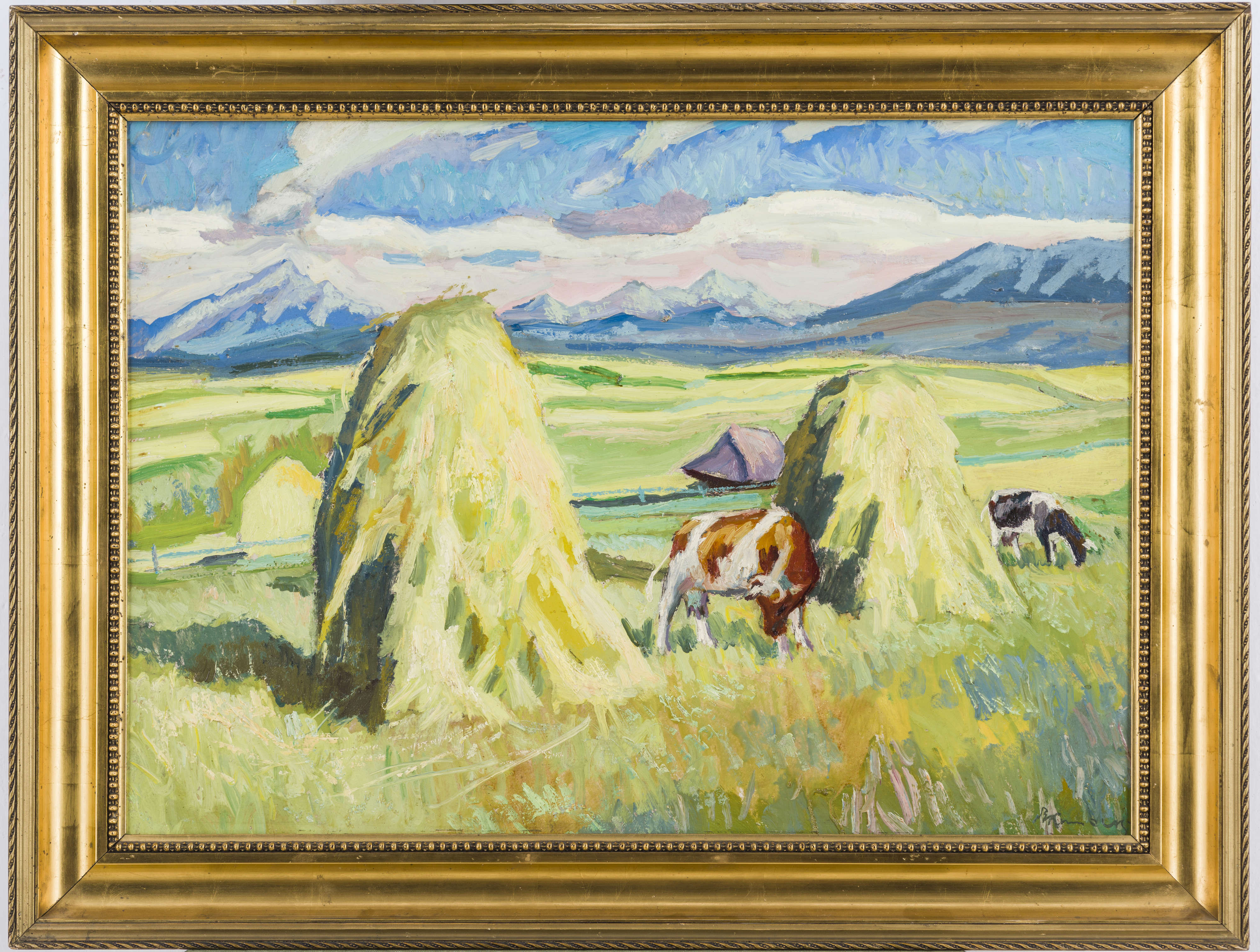 Pejzaż podgórski jest świadectwem dojrzałych poszukiwań malarskich. Wyróżnia się wyraźnym kadrowaniem, ciepłą kolorystyką, zbliżeniem stogów siana, pomiędzy którymi jest wyobrażona pasąca się krowa, w dali odcina się górski krajobraz ujęty chłodnymi błękitami. Pejzaż ma swoją wewnętrzną konstrukcję, łączącą bliski detal i odległe pasmo wierzchołków zamknięte taflą nieba. Logika kształtowania obrazu wyraża się także szczególną techniką – impastowo kształtowanej partii pierwszego planu i miękko potraktowanej horyzontalnymi pociągnięciami partii wyobrażającej daleki dystans. Obraz, skupiony na odtwarzaniu nastrojowości krajobrazu, staje się także obszarem realizacji nowoczesnego programu malarskiego, w którym wyobrażenia odsłaniają proces plastycznego opracowania, ujawniają ślad malarskiego gestu.