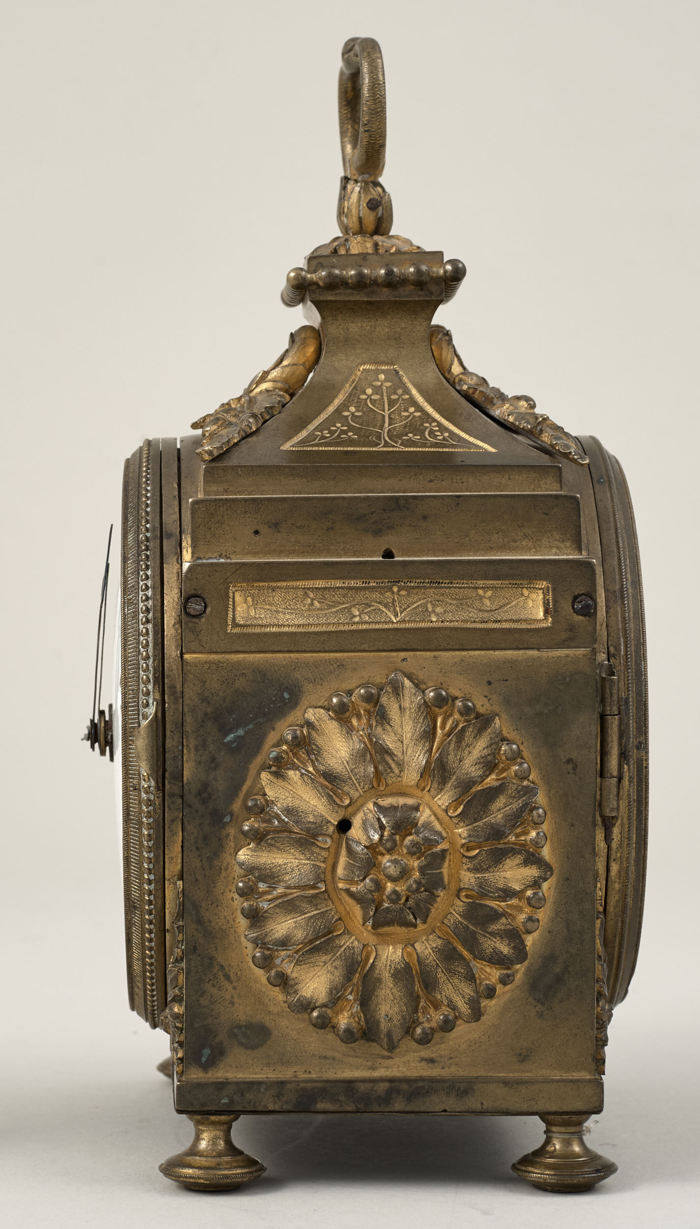 Zegar stojący prostopadłościenny w stylu empire z uchwytem u góry. Zdobiony jest nakładanymi motywami roślinnymi, wsparty na czterech nóżkach w kształcie wazonów. Skrzynka mechanizmu jest dekorowana motywami girland laurowych i rozetek, zakończona antabką w kształcie węża (uroboros) z ogonem w pysku, który bez przerwy pożera samego siebie i odradza się z siebie, co starożytności symbolizowało jedność duchową i fizyczną wszechrzeczy, która nigdy nie zanika i trwa w nieskończoność w formie ciągłej destrukcji i odradzania się. Duża, biała, wypukła tarcza została wykonana z porcelany z czarnymi cyframi arabskimi. Mechanizm posiada system „Retard - Avant" (litery „R” „A”), oznaczało kierunek regulacji. Jeśli zegar się śpieszył, to należało przesunąć w stronę Retard, a jeśli późnił - w stronę Avant. W Łańcucie był używany jako zegar gabinetowy.