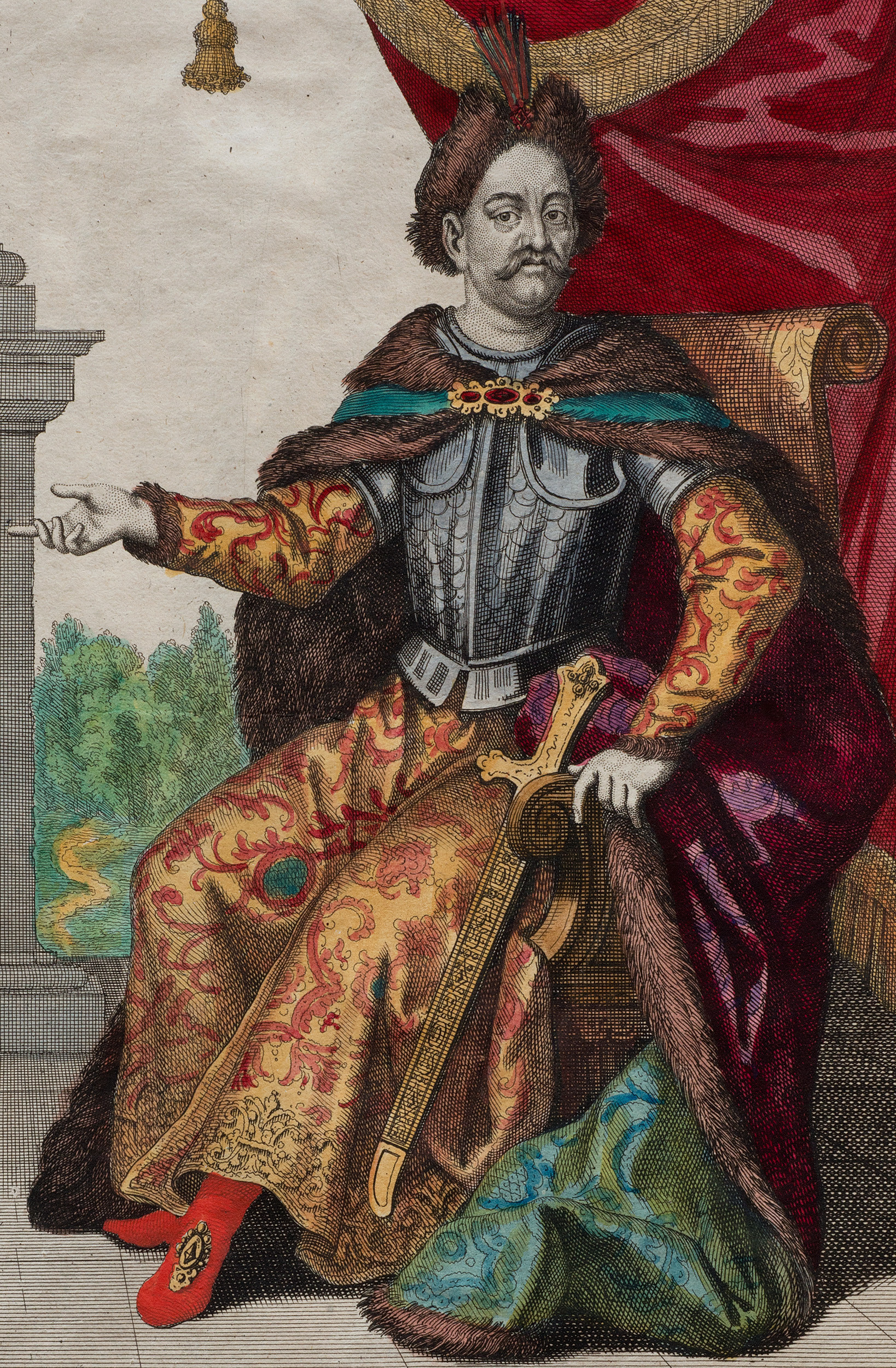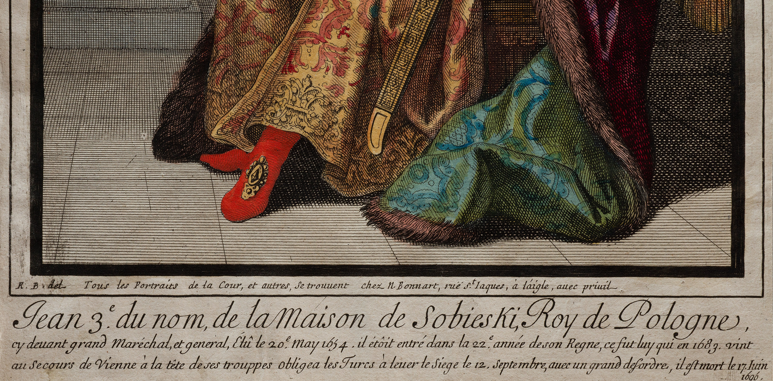 Jan III ukazany jest w stroju w typie polskim, co wskazuje, że sztycharz posiłkował się w swojej pracy wizerunkami króla, które zostały zdjęte bezpośrednio z modela. Pod obszytą futrem delią spiętą dekoracyjną zaponą, widoczny jest pancerz, który – wraz z ukazaną u boku Jana III szablą – podkreślają wojskowy autorytet polskiego monarchy. Rycina została pokolorowana farbami, podobnie jak egzemplarz grafiki pochodzący ze zbiorów Muzeum Książąt Czartoryskich (H. Widacka, Lew Lechistanu, Warszawa 201, poz. 53). Opis pod ryciną brzmi: Jean 3e. Du nom, de la Maison de Sobieski, Roy de Pologne, cy devant Grand Maréchal, et general, Elû le 20.e May 1674, il étoit entré dans le 22.e année de son Regne, ce fut luy qui en 1683. Vint au secours de Vienne à la tête de ses trouppes obligea les Turcs à lever le Siege le 12. Septembre, avec un grand desordre, il est mort le 17. J 1696 (Jan III z imienia, z rodu Sobieskich, król polski, wcześniej wielki marszałek i hetman, wybrany 20 maja 1674, panował 22 lata, to on w roku 1683 przybył na czele swych wojsk na pomoc Wiedniowi, zmusił Turków do porzucenia oblężenia w wielkim chaosie, zmarł 17 J. (zapewne skrót od Juin-czerwiec) 1969).