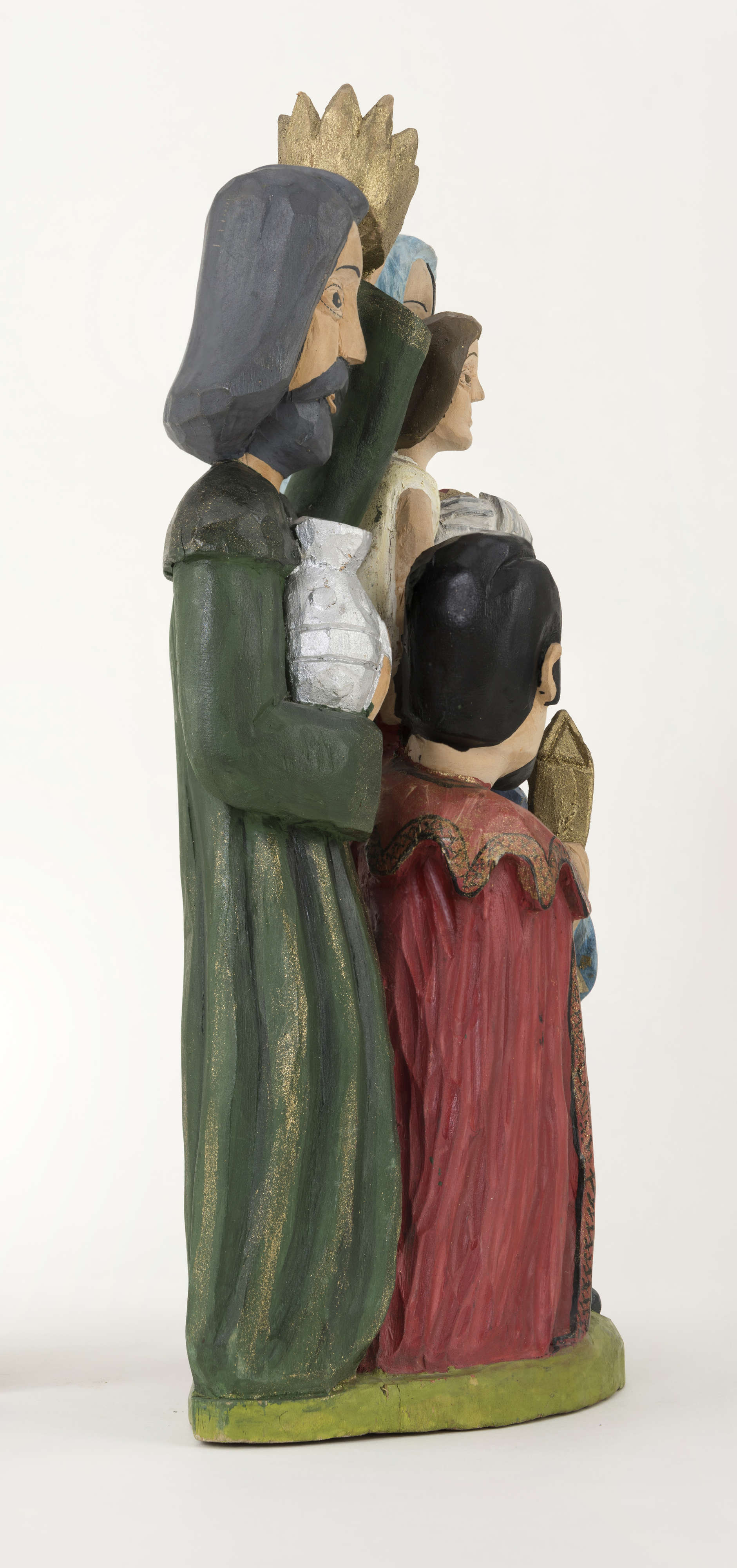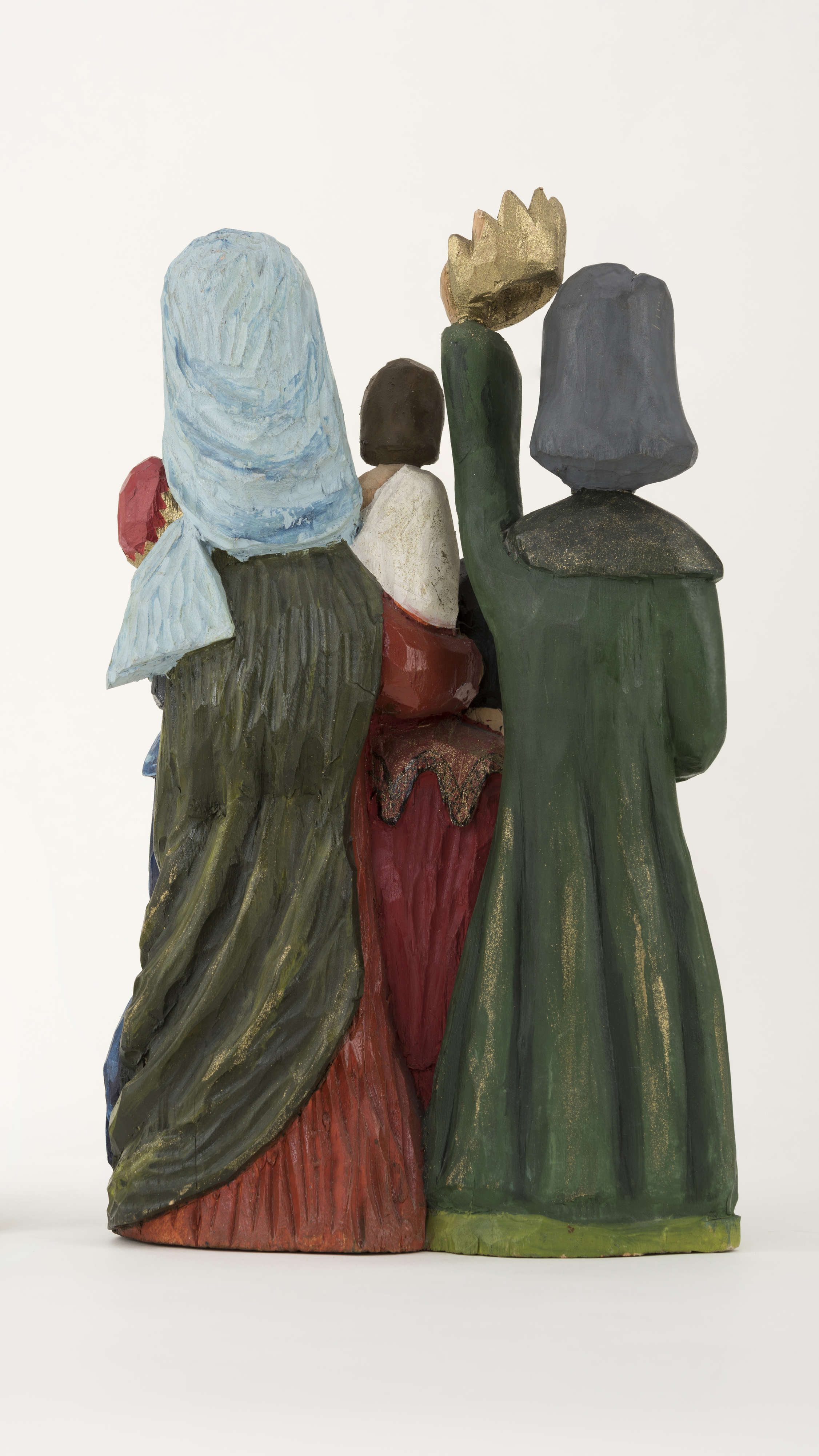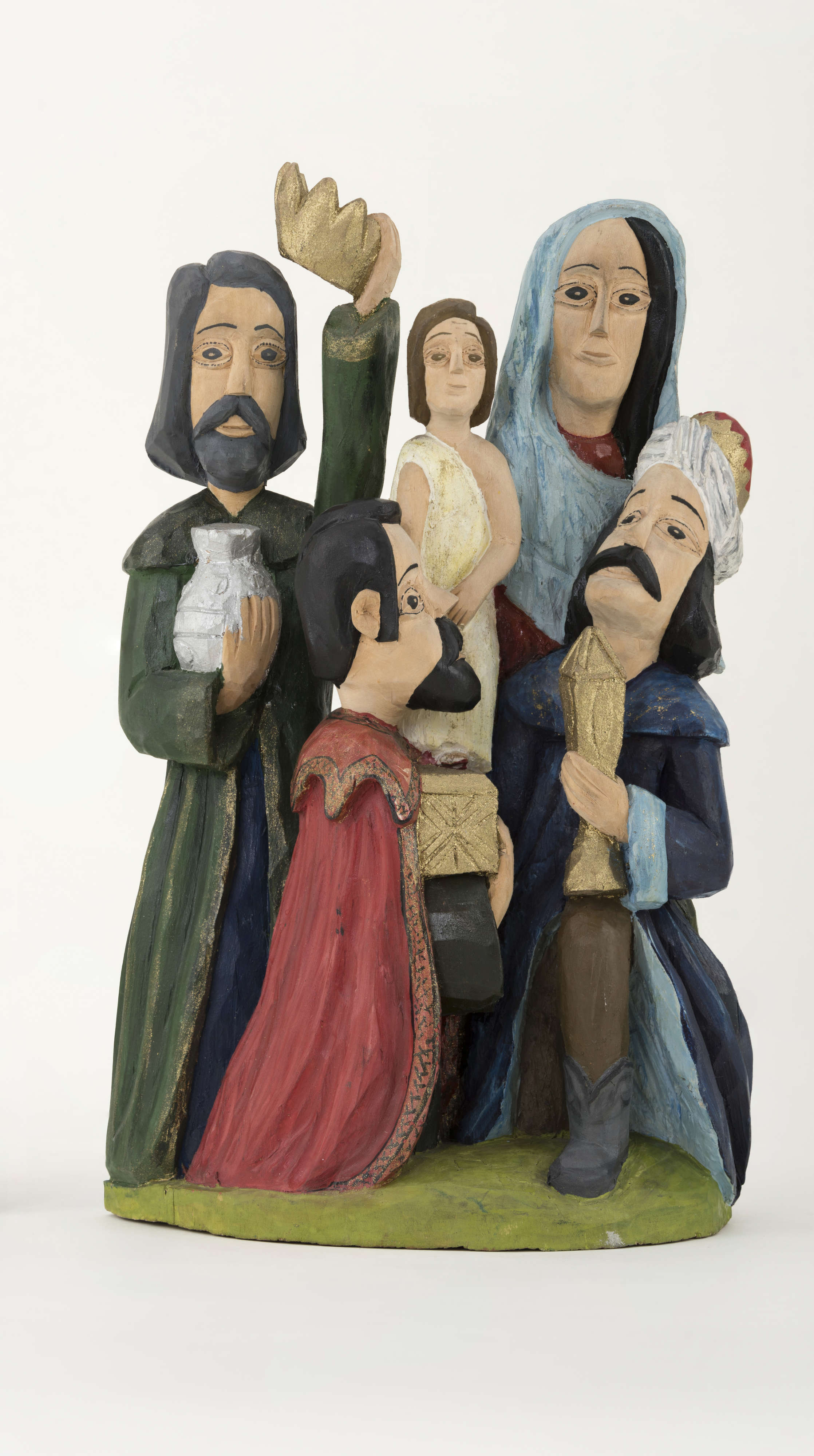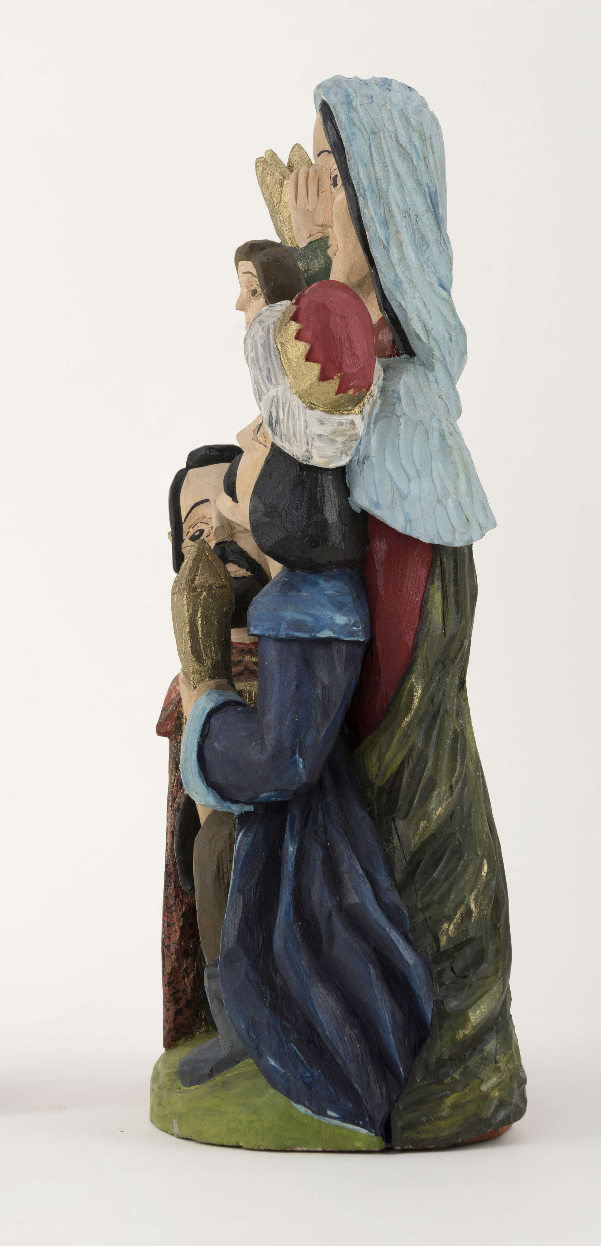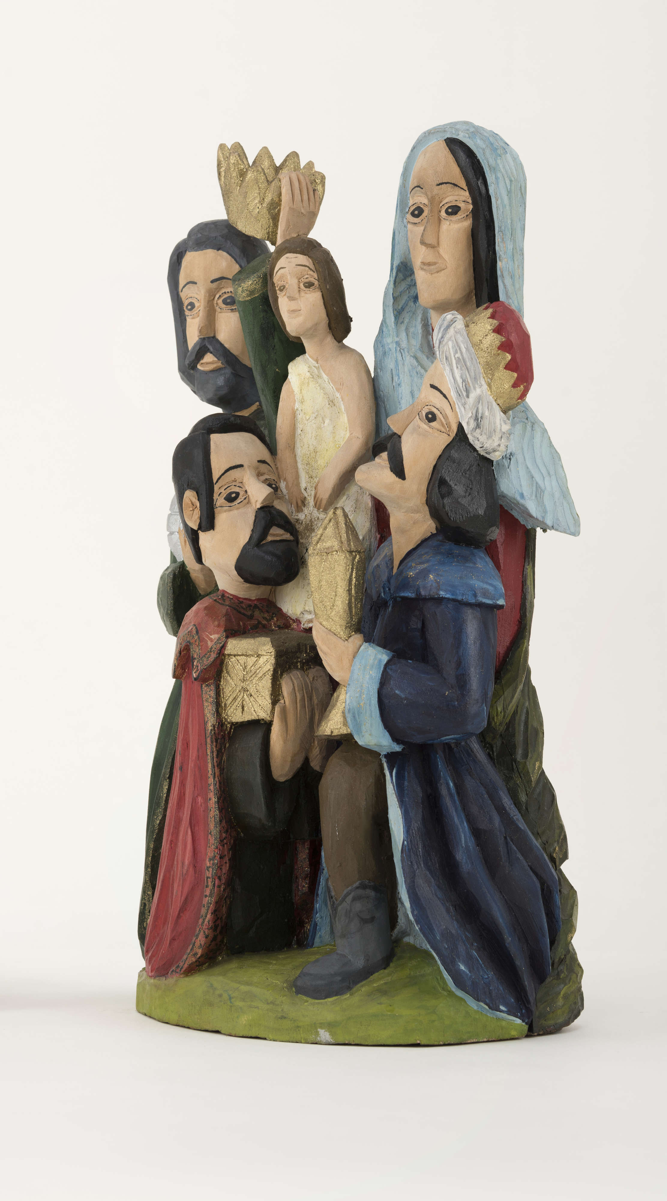 Rzeźbę (wysokość 37,5 cm) wykonał w 1982 roku Mieczysław Gaja, twórca ludowy działający w Łukowskim Ośrodku Rzeźby Ludowej. Powstała z jednego kawałka drewna lipowego, techniką strugania, jest polichromowana farbami plakatowymi w bardzo intensywnych kolorach. Na postumencie o nieregularnym, owalnym kształcie zakomponowano pięć postaci – dwóch klęczących królów i jednego stojącego przed Maryją z Dzieciątkiem na prawym ręku. Składają oni dary przyniesione.