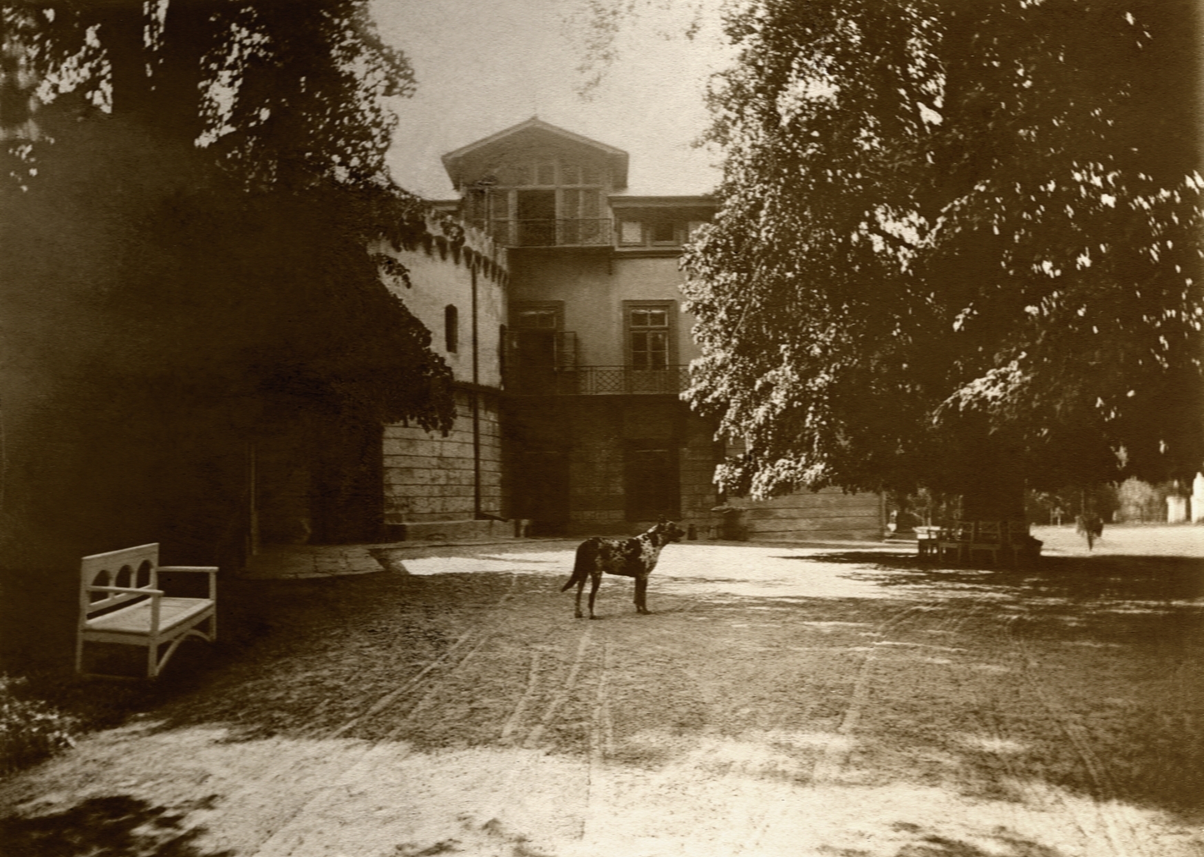 Fotografia prezentuje pałac wraz z otaczającą go bujną roślinnością oraz elementami małej architektury jakimi są ławki ogrodowe od strony północnej. W centralnej części fotografii znajduje się pies Lubomirskich Lord.