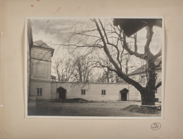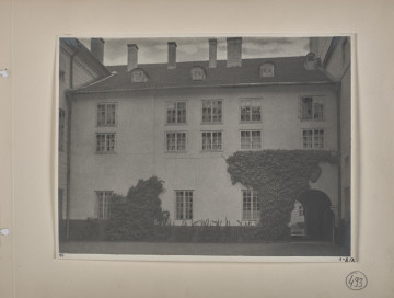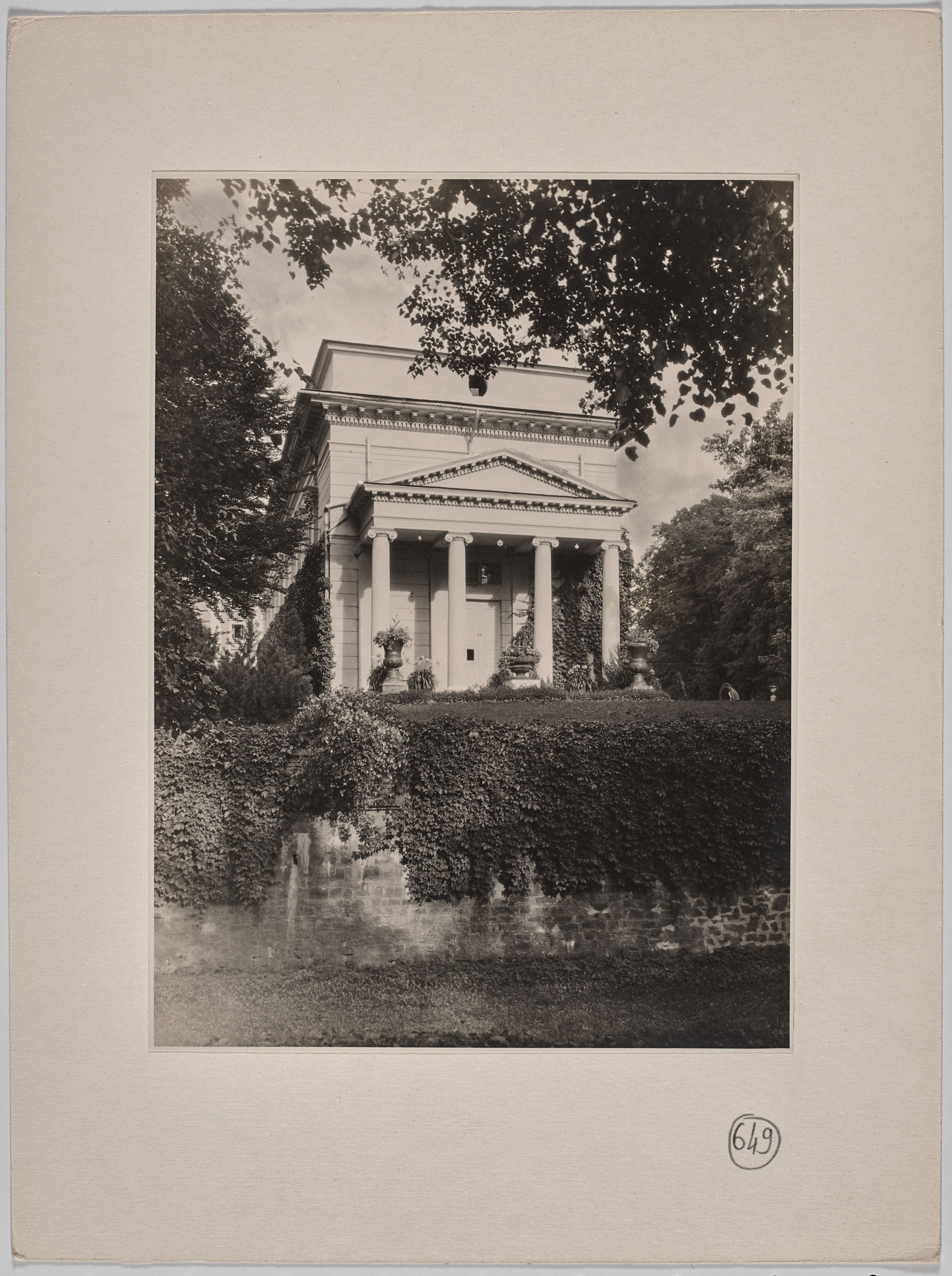 Fotografia przedstawia widok zachodniej elewacji oranżerii, od fosy zamkowej. Klasycystyczna oranżeria została wzniesiona w latach 1798-1802. Węższa elewacja zachodnia ozdobiona jest czterokolumnowym jońskim portykiem z belkowaniem i trójkątnym szczytem. Mur części elewacji oranżerii pokrywa pnące się dzikie wino. Przed portykiem stoją trzy metalowe wazy z kwiatami. Bastion przy fosie porastają pnącza. Z lewej strony widoczny jest fragment buku. Z prawej strony widok na Ogród Różany przed elewacją południową oranżerii i na lipy w alei przy fosie zamkowej. Fotografia wykonana została przez dr Józefa Piotrowskiego (1873-1939), lwowskiego historyka sztuki. Od 1 VI 920r. do 1929 r. pełnił on funkcję konserwatora zabytków przy Lwowskim Urzędzie Wojewódzkim (zob. Piotr Lasek, Inwentaryzacja zabytków architektury w lwowskim okręgu konserwatorskim 1920-1939. Szkice z dziejów, Instytut Sztuki PAN, Warszawa 2020, s. 32-62). Jest on autorem wydanego w 1933 r. we Lwowie opracowania Zamek w Łańcucie. Zwięzły opis dziejów i zbiorów oraz autorem dokumentacji fotograficznej zamku w Łańcucie, jego wnętrz i zbiorów, stanowiących dziś własność Muzeum-Zamku w Łańcucie (m.in. albumy, t. I-X, Lwów 1936) oraz Instytutu Sztuki Polskiej Akademii Nauk w Warszawie (albumy, t. I-IX, Lwów 1929).