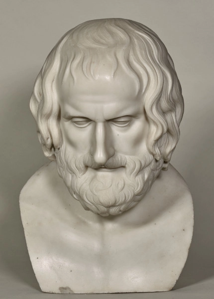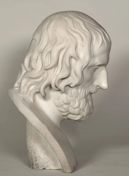 Eurypides to tragediopisarz grecki żyjący około 480-407/6 p.n.e. Jego marmurowe popiersie jest kopią antycznej, rzymskiej hermy marmurowej znajdującej się w zbiorach Museo Nazionale w Neapolu wykonanej w okresie panowania cesarza Klaudiusza (41 r.-54 r.) według rzeźby greckiej z około 330r. p.n.e. łączonej z Lizypem. Herma ta uważana jest za najlepszą wśród licznych antycznych, rzymskich kopii pisarza. Łańcuckie popiersie przedstawia Eurypidesa jako starszego, łysiejącego mężczyznę, z lekko pochyloną głową, z długimi włosami ułożonymi w wężykowate pasma. Twarz o wysokim i wypukłym czole, z długim nosem, gałkami ocznymi w kształcie migdału przesłoniętymi powiekami, wyraźnie okonturowanymi, z wąskimi ustami lekko rozchylonymi, okolona brodą z płaskimi puklami. W popiersiu zwraca uwagę jego suchy i linearny modelunek. Twórcą łańcuckiej kopii jest Giuseppe Pisani (1757 – 1839), włoski rzeźbiarz. Popiersie wykonane zostało w Wiedniu w 1805 r. W zbiorach łańcuckich znajduje się od 1948 r. Przejęte zostało przez muzeum ze Składnicy Muzealnej w Przeworsku utworzonej w upaństwowionym w 1944 r. pałacu Lubomirskich, obejmującej tamtejsze zbiory sztuki. Eksponowane jest w Galerii Rzeźb, gdzie wystawione są także kopie innych rzeźb antycznych.