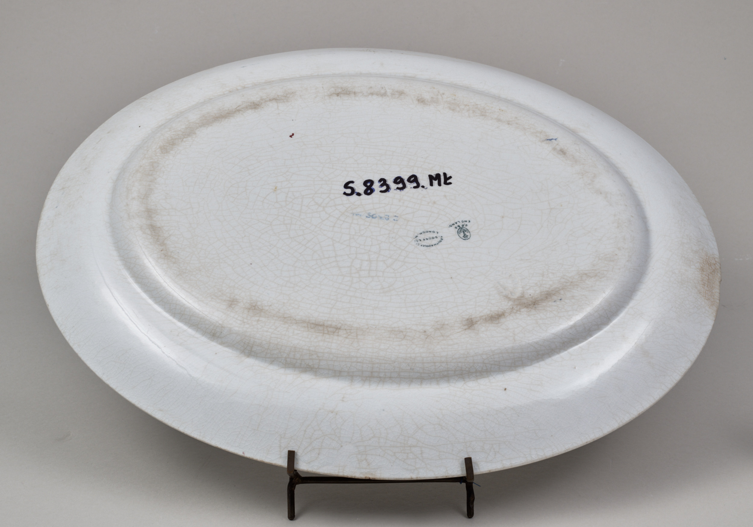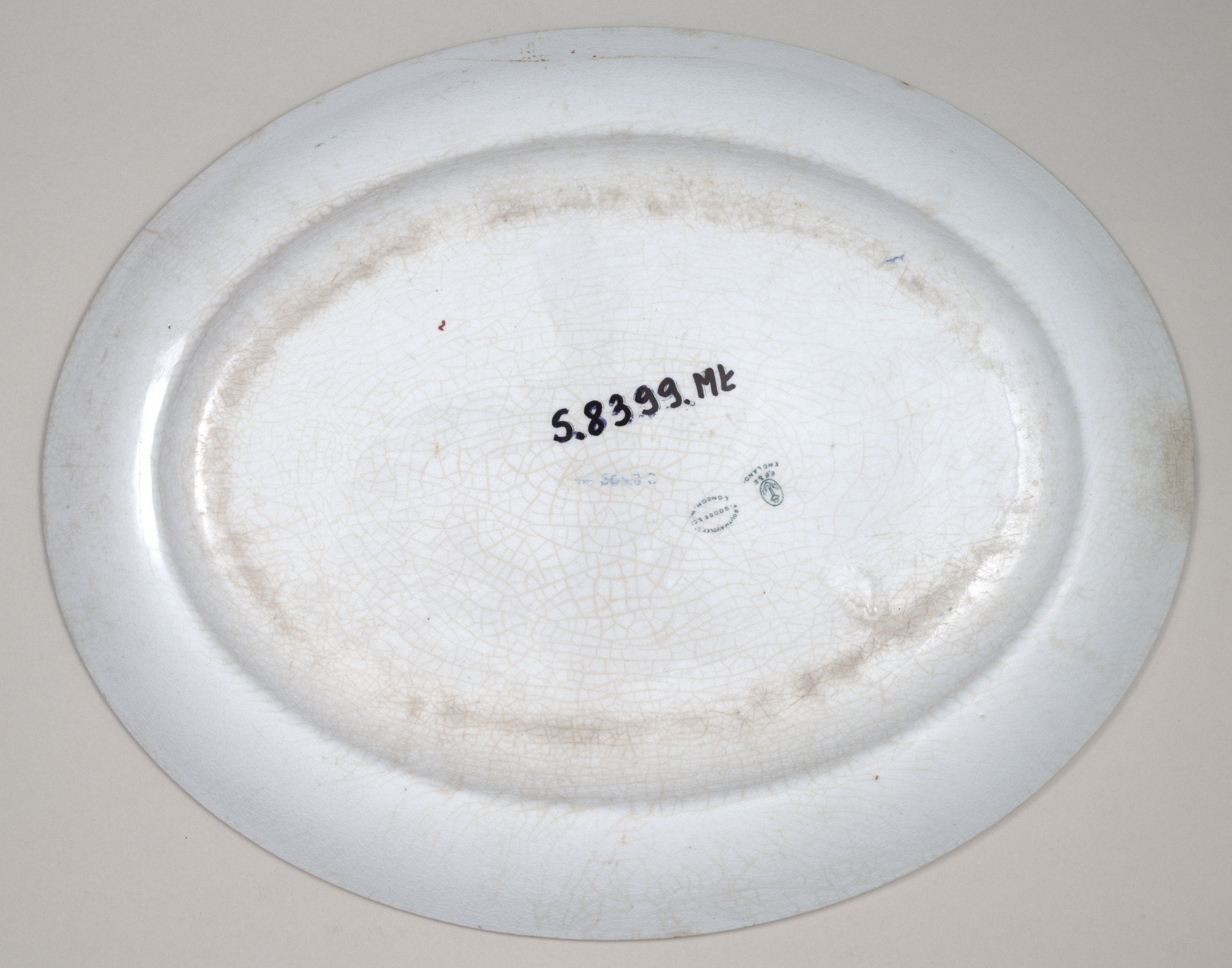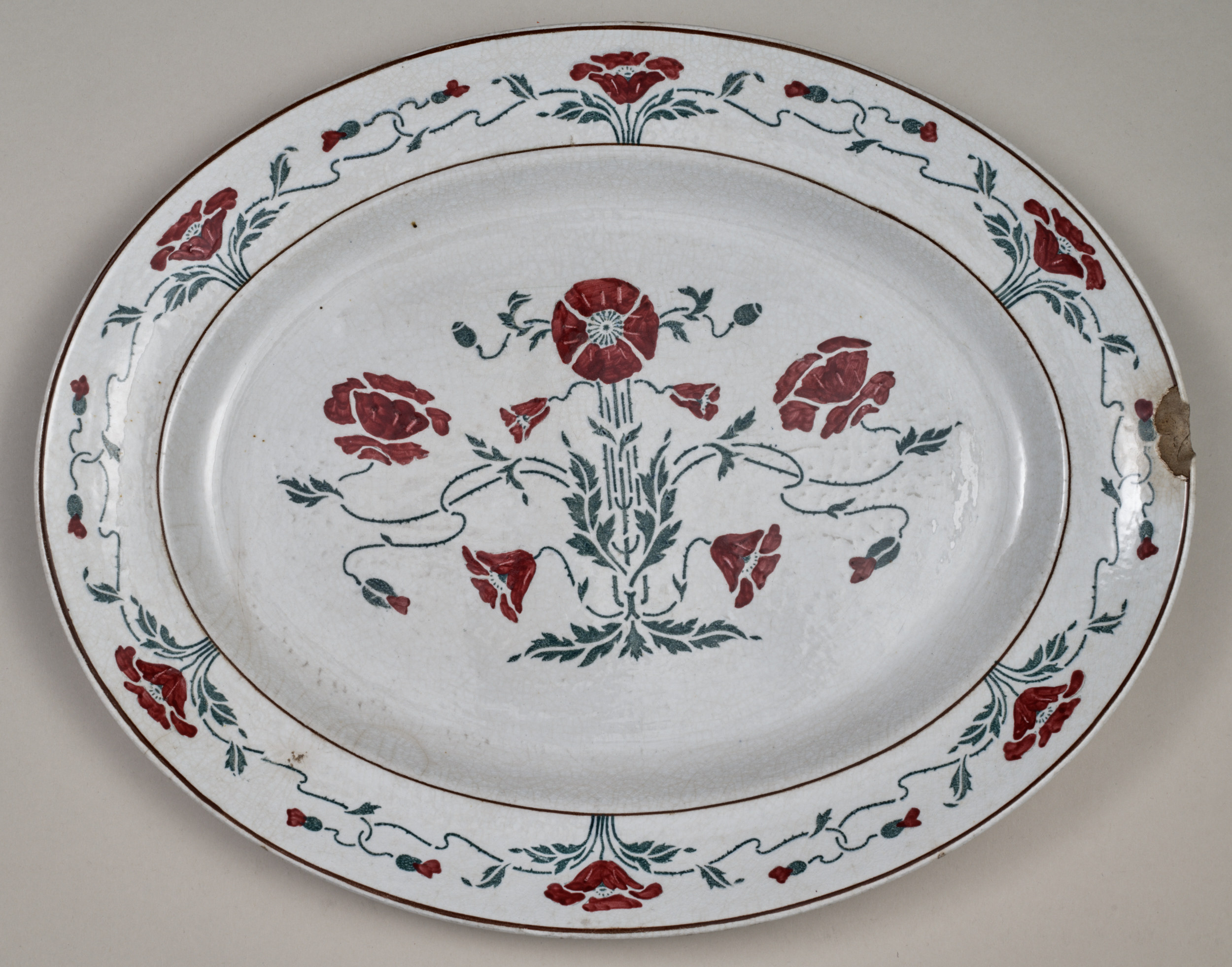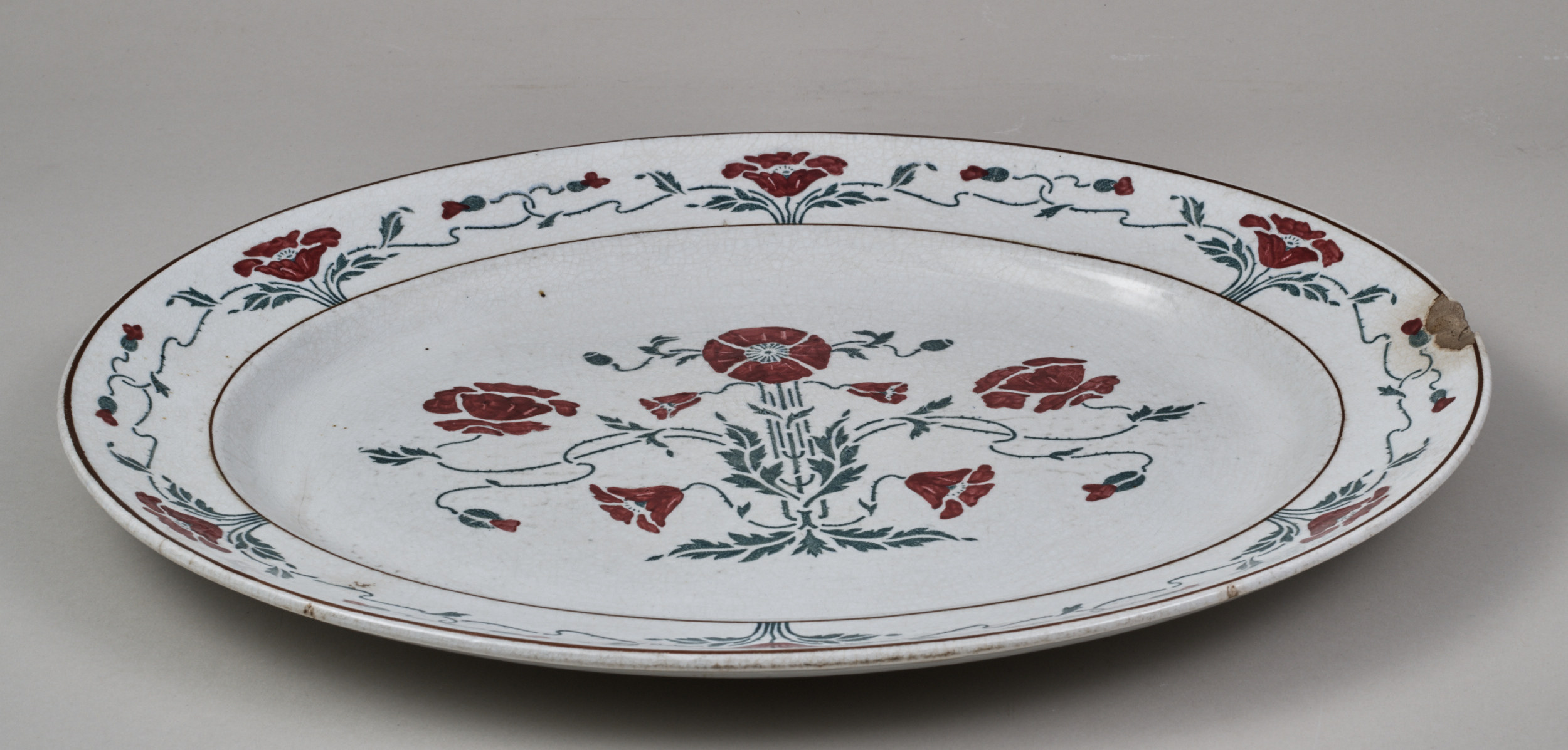 Półmisek owalny z szerokim kołnierzem z secesyjną dekoracją malarską o motywie stylizowanych maków. Łodygi, liście i kontury kwiatów ciemno-zielone, naniesione przez szablon, płatki kwiatów wypełnione odręcznie farbą czerwono-bordową. Owal lustra zdobiony stylizowanym bukietem maków, z których środkowy przedstawiony w widoku z góry wraz z łodygą tworzy oś kompozycji, po której obu stronach symetrycznie rozmieszczone są pozostałe kwiaty i pączki na cienkich esowato wygiętych łodygach z liśćmi, od dołu bukiet zakończony 3 liśćmi (2 długie rozkładają się na boki, 1 mały na osi). Kołnierz półmiska ujęty dwiema brązowymi obwódkami - zewnętrzną szerszą i wewnętrzną węższą, między którymi ornament ciągły, powtarzający się, złożony z kwiatów rozwiniętych, kielichowatych i rozwijających się pąków, splatających się między sobą długimi, wygiętymi łodygami. Na odwrocie półmiska sygnatury: producenta - kotwica w owalu, pod tym napis S.B.&S/ ENGLAND i obok magazynu zamawiającego: SOUTH AUDLEY ST. /T GOODE&Co/ LONDON.W., ponad nimi wyciśnięta inna sygnatura producenta BRIDGWOOD? 4-20.