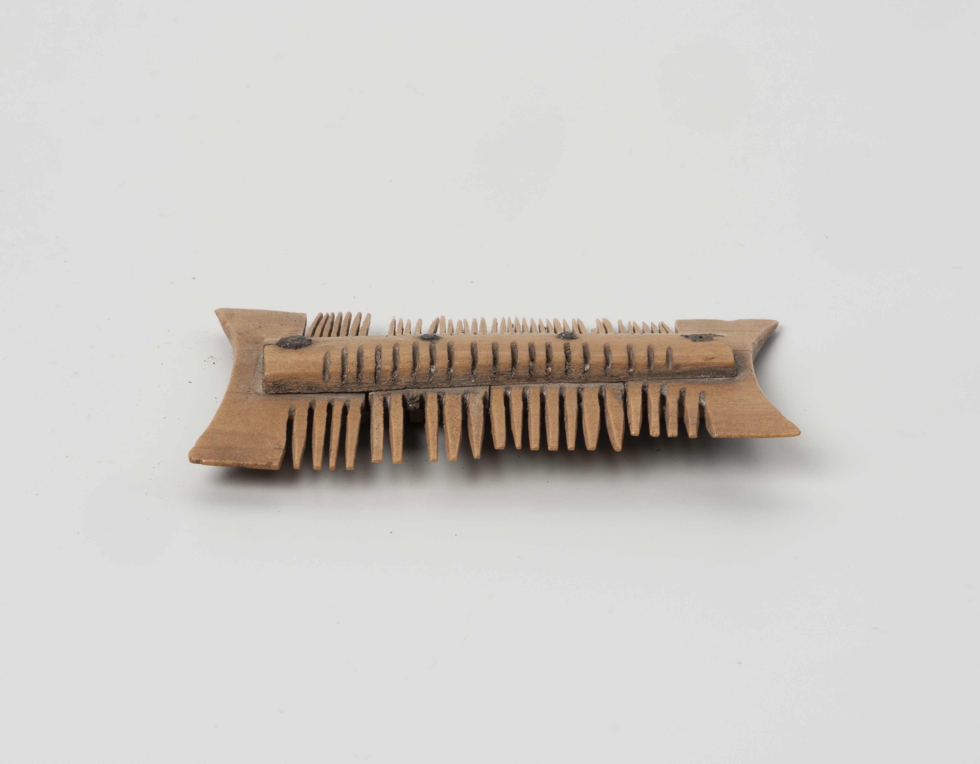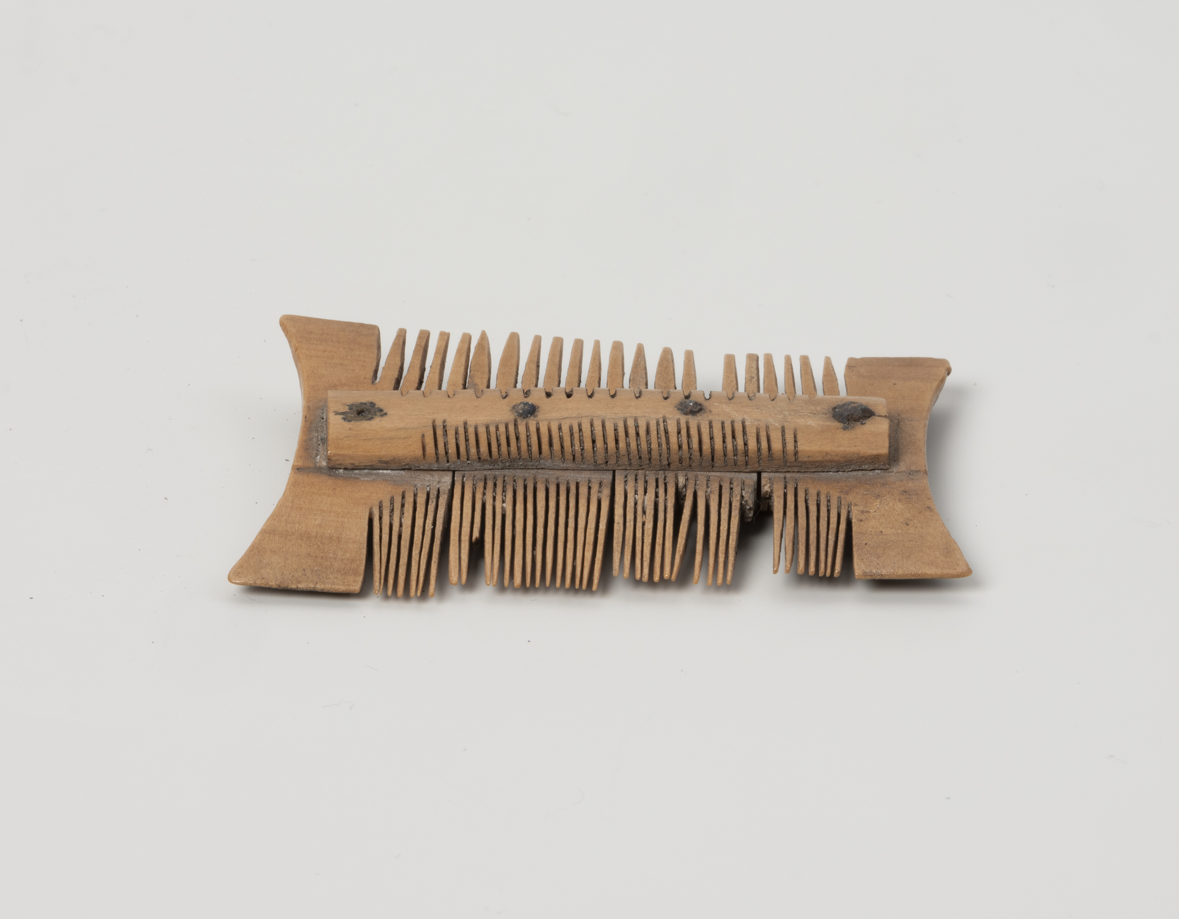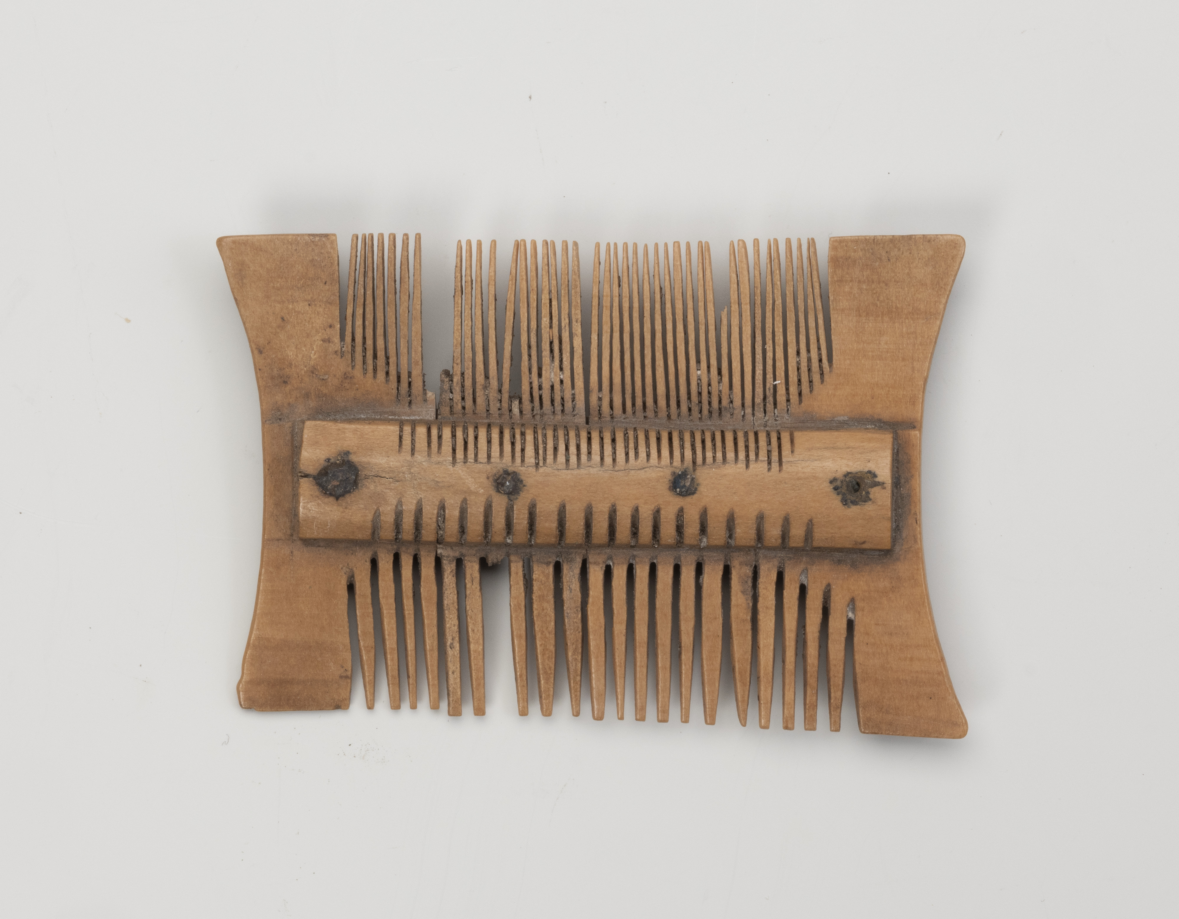 Zachował się nieomal w całości – uszkodzone ma jedynie kilka zębów. Wykonano go z poroża jeleniowatych i należy do grupy grzebieni dwustronnych, składających się z trzech warstw płytek. Według typologii Eugeniusza Cnotliwego należy do grupy IIB, typu III, odmiany 2. Ma kształt nawiązujący do prostokąta, z bocznymi, krótszymi bokami lekko wklęsłymi. Zbudowany został z czterech płytek wyciętych z poroża, ułożonych obok siebie i przymocowanych do obustronnie występujących okładzin nitami wykonanymi ze stopu miedzi. Każdy nit znajduje się pośrodku jednej płytki. Po zmontowaniu konstrukcji wycinano zęby grzebienia za pomocą precyzyjnych piłek – gęstsze po jednej, a rzadsze po drugiej stronie. Taką kolejność działań potwierdzają widoczne na okładzinach ślady nacięć pokrywające się ze szczelinami pomiędzy zębami. Na końcowym etapie prac powierzchnię jednak wygładzono i usunięto ślady obróbki surowca. Można śmiało więc stwierdzić, że ten niewielki przedmiot wykonany był przez doświadczonego wytwórcę, dysponującego specjalistycznymi narzędziami, takimi jak różne rodzaje pił, dłuta, noże i świdry.