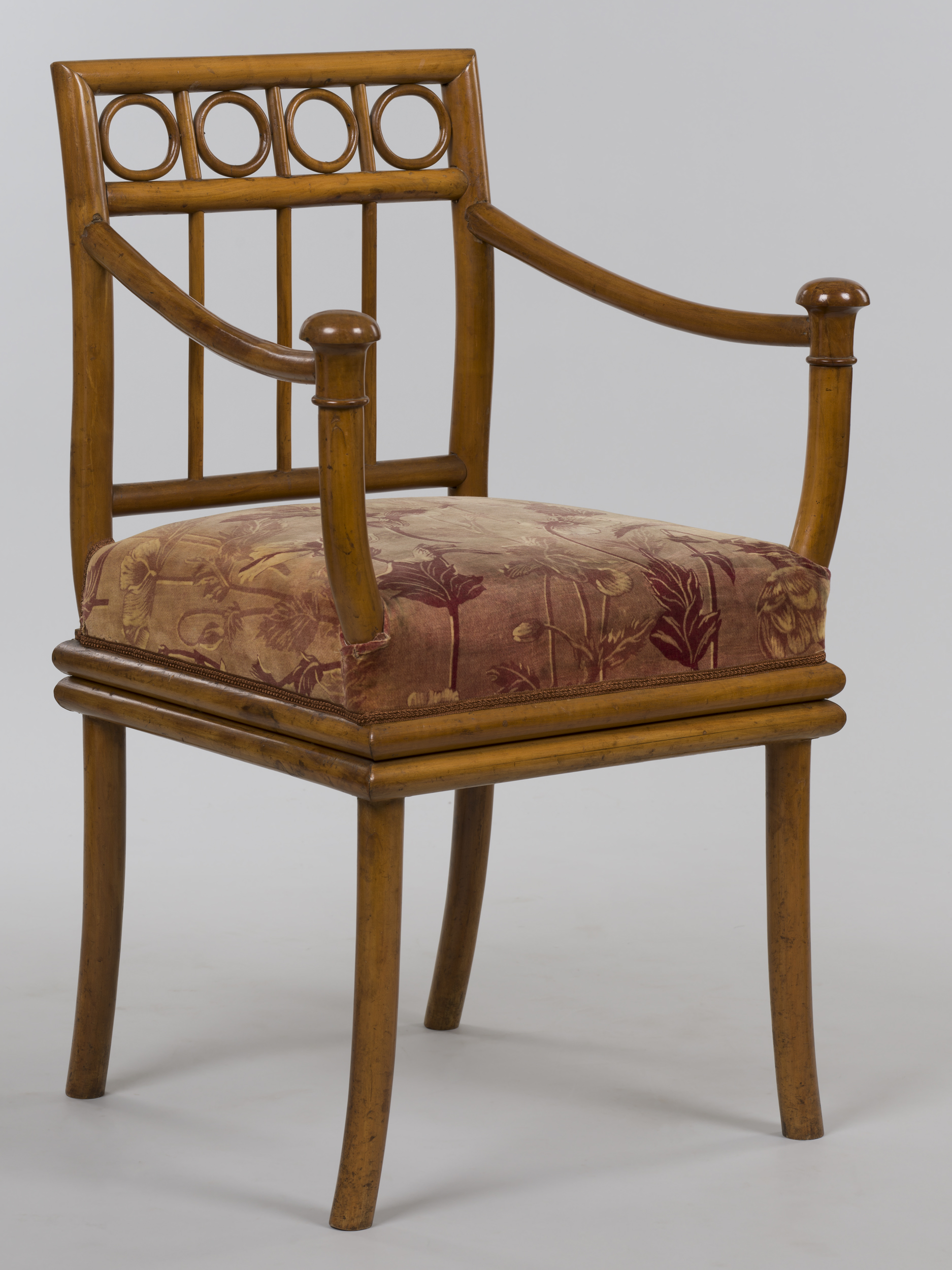 Fotel z drewna toczonego na 4 nogach z których przednie lekko wygiętych na boki, a tylne do tyłu. Siedzisko trapezoidalne. Oparcie ażurowe, lekko esowato odgięte ku tyłowi, o kwadratowej ramie podzielonej trzema wąskimi pionowymi prętami, a w części górnej poziomą poprzeczką grubości ramiaków oparcia. W czterech utworzonych w ten sposób polach umieszczono w formie dekoracji cztery toczone pierścienie.