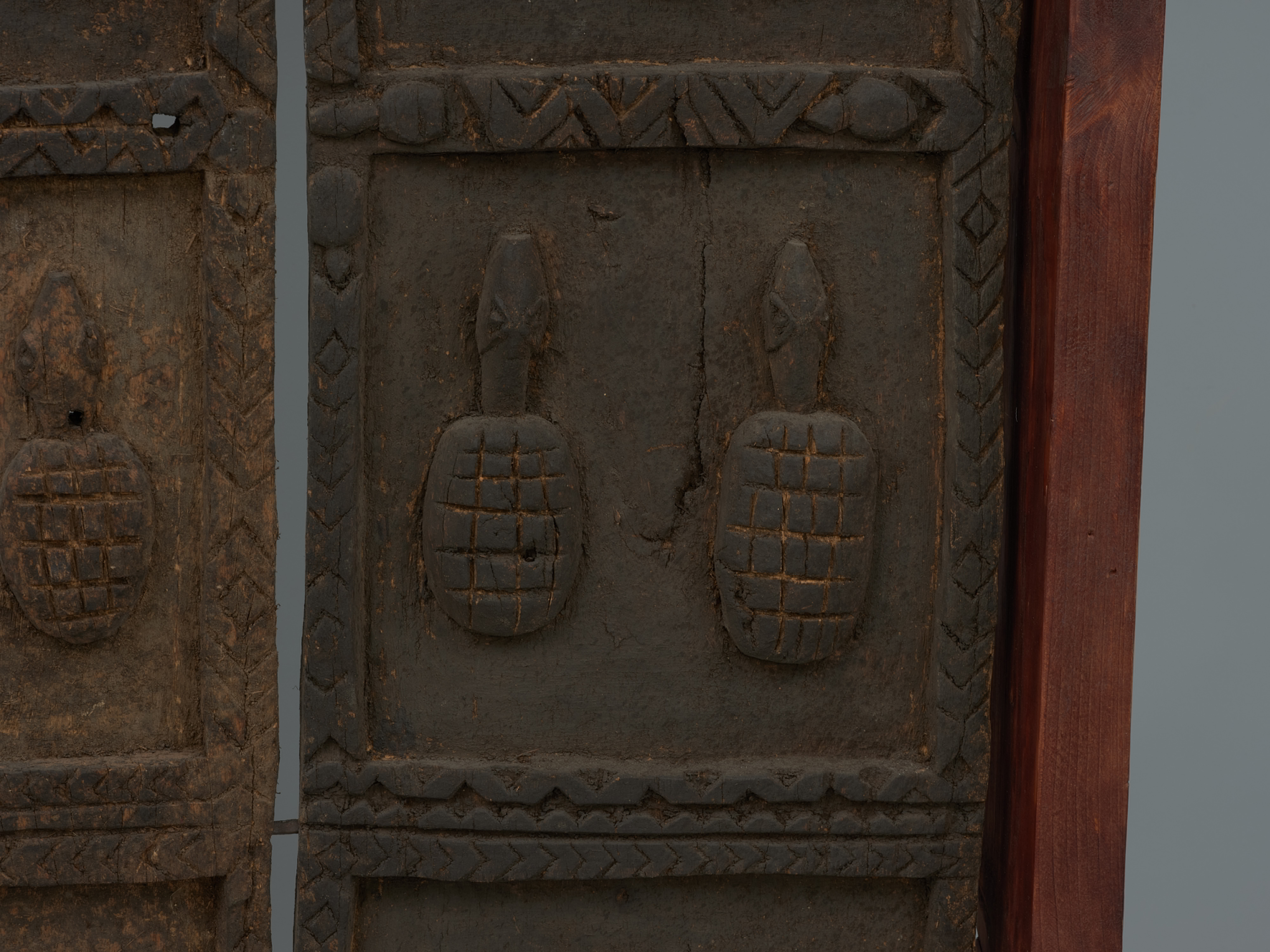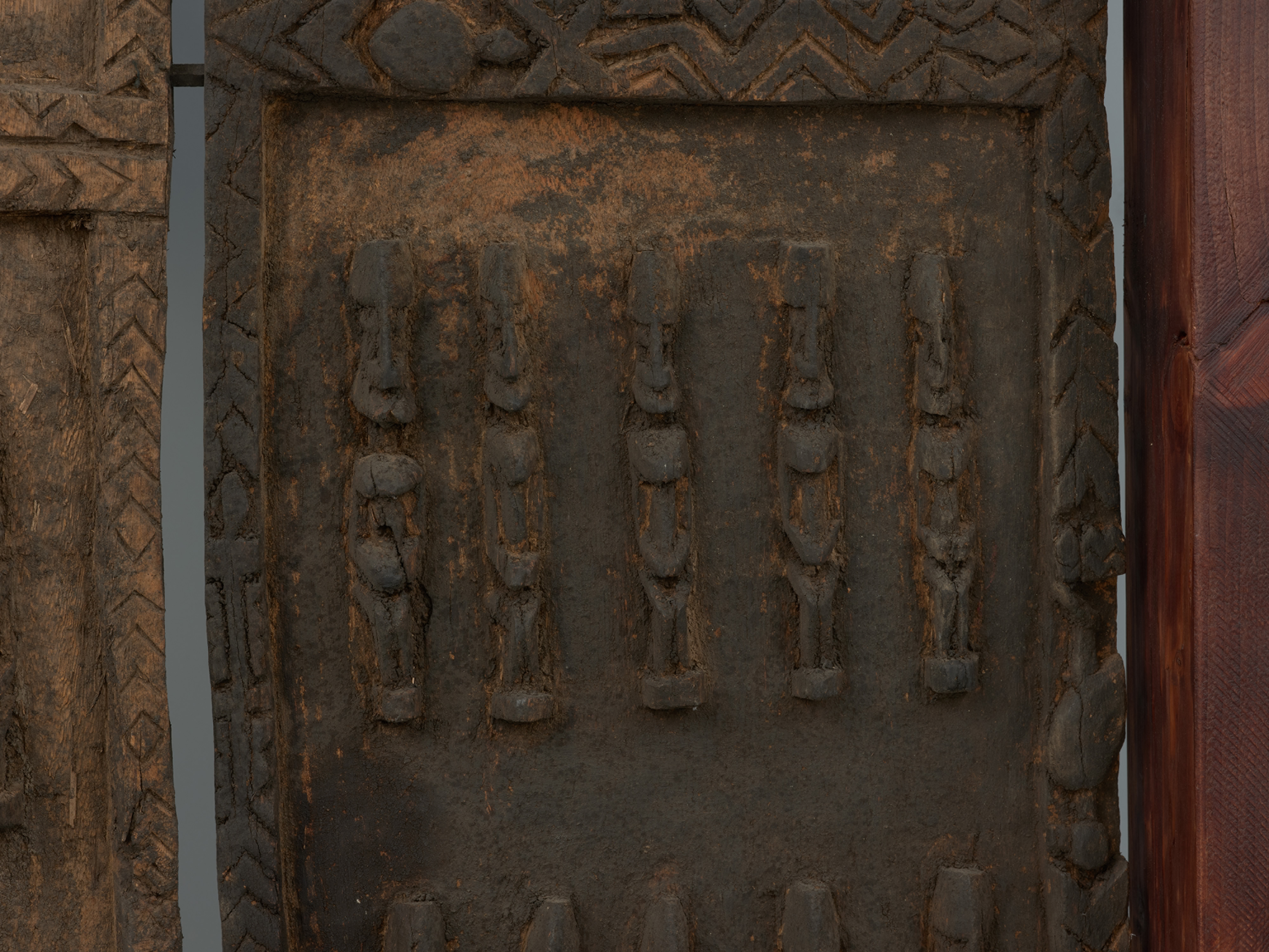 Drzwi ozdobione są płaskorzeźbionymi motywami antropo- i zoomorficznymi. Można wśród nich rozpoznać postaci przodków, krokodyli ayo-geu, węża oraz żółwi agunuru.