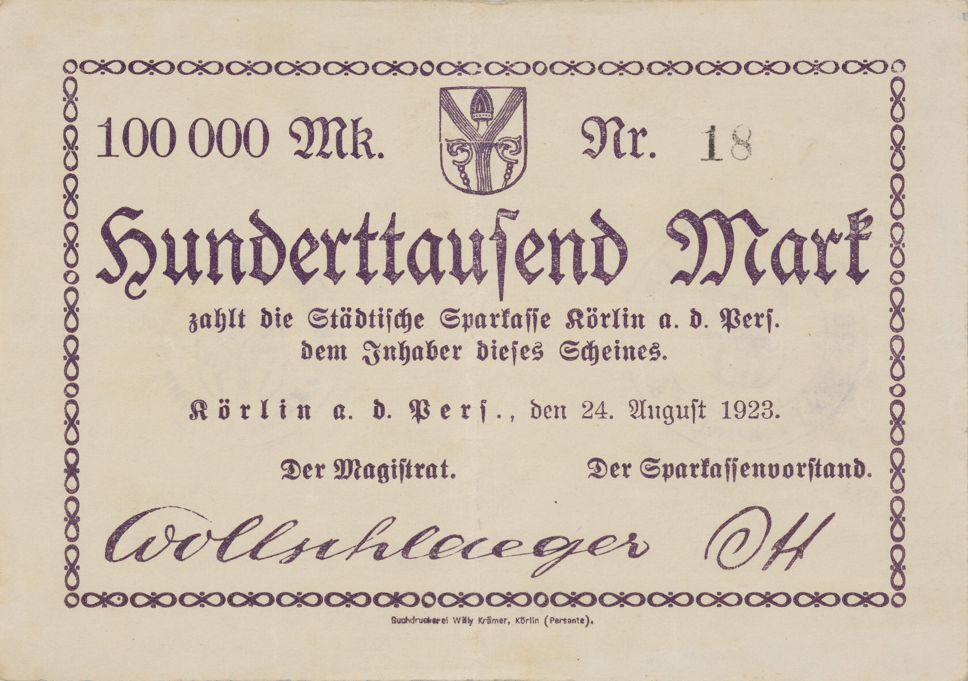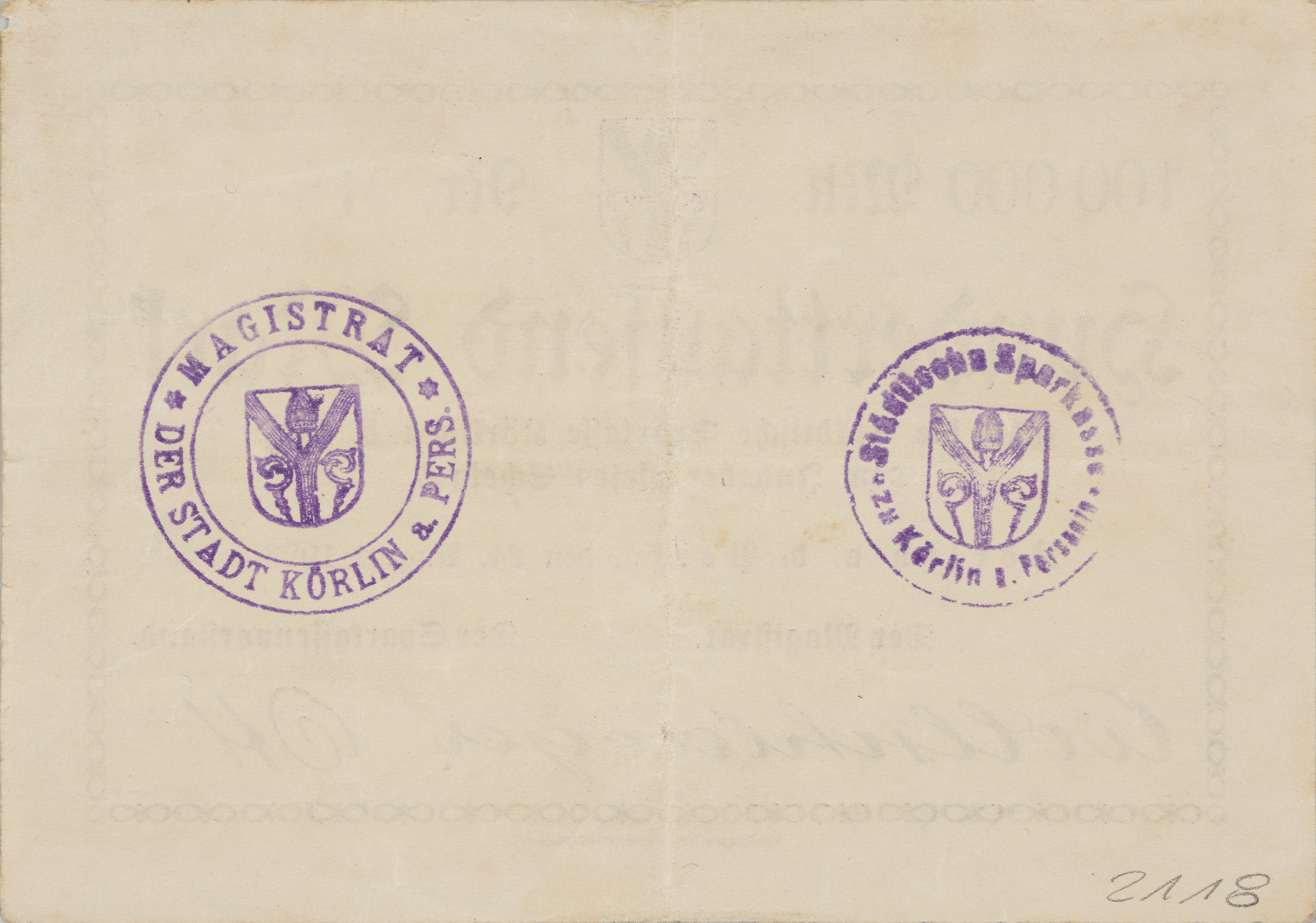 Jednak podczas ostrej inflacji w lecie 1923 roku również w Karlinie musiały zaistnieć problemy z dostępnością gotówki, skoro 24 sierpnia rada miejska podjęła decyzję o wydaniu wspólnie z Miejską Kasą Oszczędności lokalnych pieniędzy zastępczych. Postanowiono wydać bony w kursujących w tym czasie nominałach banknotów Banku Rzeszy – 100 i 500 tysięcy marek oraz 1, 2 i 5 milionów marek.