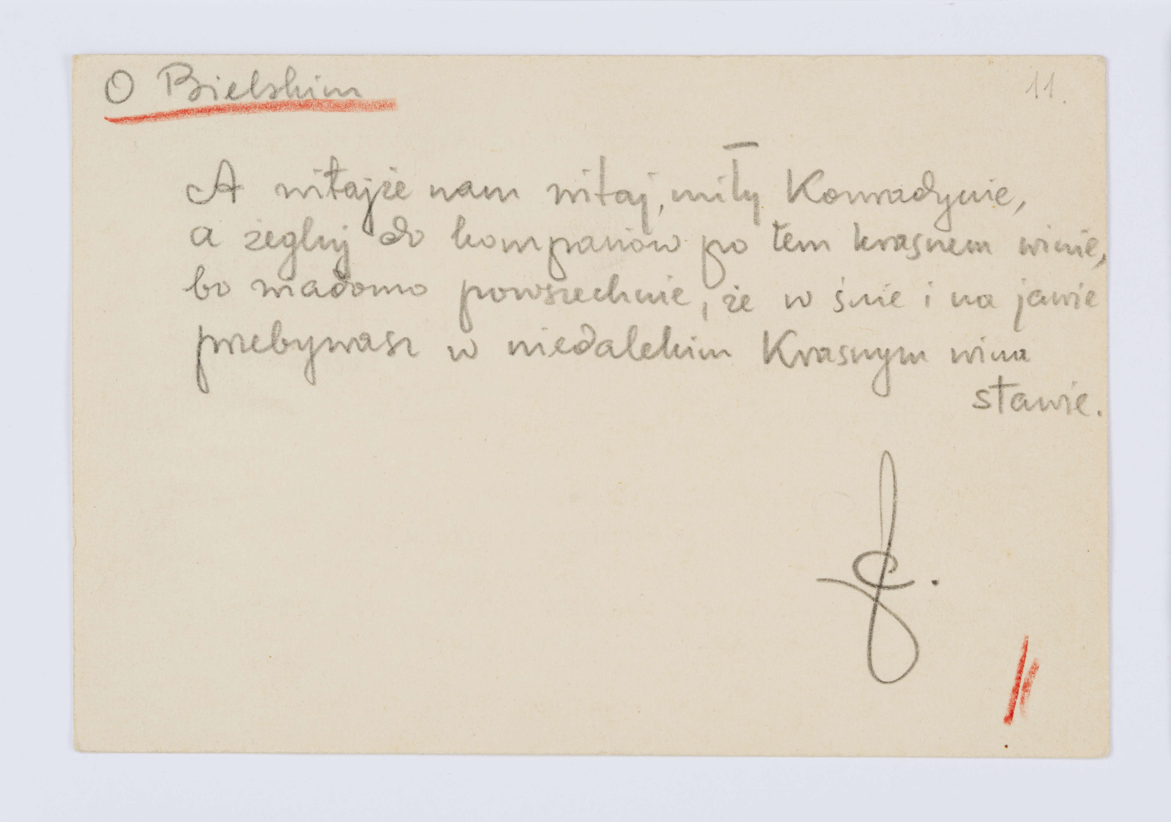 Pierwszy zachowany list Czechowicza adresowany jest właśnie do Konrada Bielskiego. Wysłał go z Lublina najprawdopodobniej latem 1922 roku, tuż po zawarciu przez nich znajomości. O tym, jak ważne i inspirujące było dla niego to spotkanie, pisze poeta w liście wysłanym z Włodzimierza Wołyńskiego w listopadzie 1923 roku: „Byłeś ongi moim budzicielem. Kiedy znalazłem się w Lublinie w lecie 22 roku, półdziecko, marzyciel z pojęciami i duszą bohaterów Claudela i takąż claudelowską prostotą, miasto przemówiło do mnie po raz pierwszy twoimi ustami. Nie żadne wiersze Tuwima, nie czasopisma najbardziej nowe obnażyły we mnie nerw życia nowoczesnego. To zrobiłeś ty w kilku zdaniach”. Konrad Bielski, autor Ody do wina, był znany z zamiłowana do alkoholu i spotkań towarzyskich. Do tego faktu nawiązuje Czechowicz we fraszce. Napisał ją, kiedy jego przyjaciel zamieszkał w Krasnymstawie, miejscowości, w której – jak pisze Julian Krzyżanowski – „dowcip poety doszukał się źródeł czerwonego wina”. Postać Bielskiego, w podobnym kontekście, pojawia się w wierszu Czechowicza We czterech.