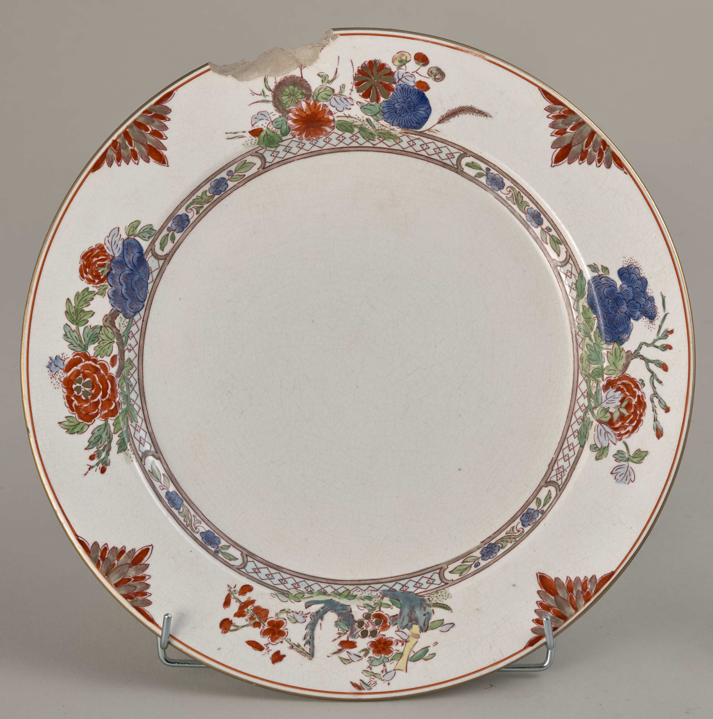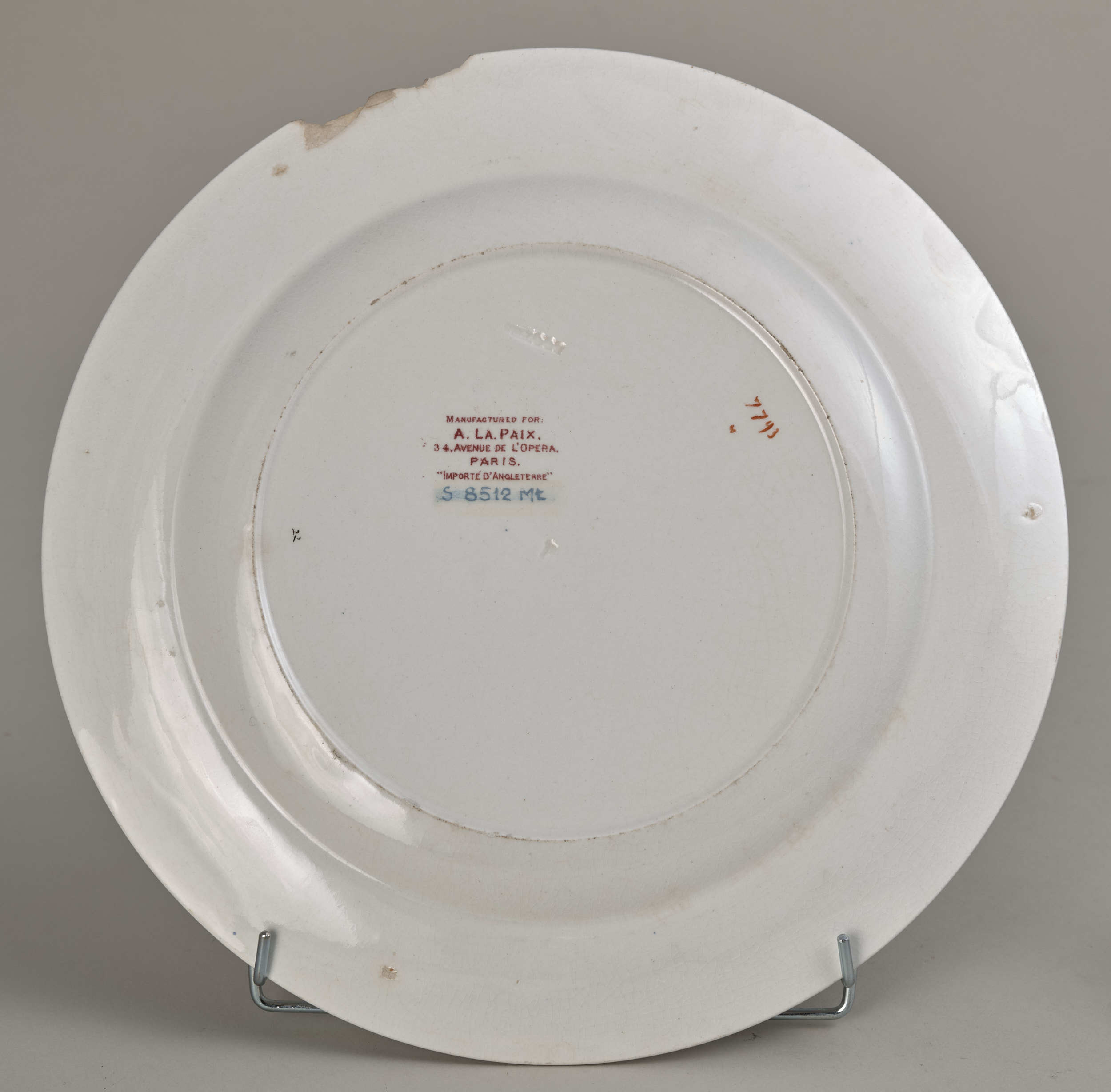 Talerz płytki z dekoracją chinizującą Talerz płytki, fajansowy o lekko kremowym odcieniu, pokryty siatką ozdobnych spękań szkliwa, zdobiony dekoracją malarską w typie dalekowschodnim o motywach roślinno – geometrycznych, a skoncentrowaną w partii kołnierza. Szczegółowy rysunek wzoru dekoracji naniesiony drukiem w kolorze purpurowym, następnie już na szkliwie- ręcznie podmalowany farbami w kilku kolorach: rdzawa czerwień, ciemnoniebieski, zielony, piaskowo-beżowy. Natomiast w mniejszości użyto farb w kolorach: jasnoniebieskim, stalowozielonym, seledynowym i żółtym. Na dekorację tę składa się pas ornamentu geometrycznego z motywem rombów, biegnący tuż pod krawędzią wrębu, następnie cztery duże kompozycje kwiatowo-roślinne, a jedno z nich z motywem połamanego krzewu, rozmieszczone na kołnierzu, blisko pasa ornamentu. Kompozycje te rozdzielone są liściastymi półrozetami. Złoto znajduje się jedynie w pasku lamującym brzeg kołnierza i drobnych elementach trzech kwiatów w dużych kompozycjach. Odwrocie talerza pokryte jest pod szkliwem szarymi plamkami. Widoczne oznakowania: w centralnym punkcie litera „B”, sygnatura fabryki „BOOTHS” – obydwa znaki stemplowane w masie i duża pieczęć drukowana podszkliwnie w kolorze bordowym: „MANUFACTURED FOR:/A.LA.PAIX,/34.AVENUE DE L’OPERA, /PARIS./IMPORTE D’ANGLETERRE”. Pod nią napis z aktualnym nr inwen. Anglia, Hanley, XIX w.