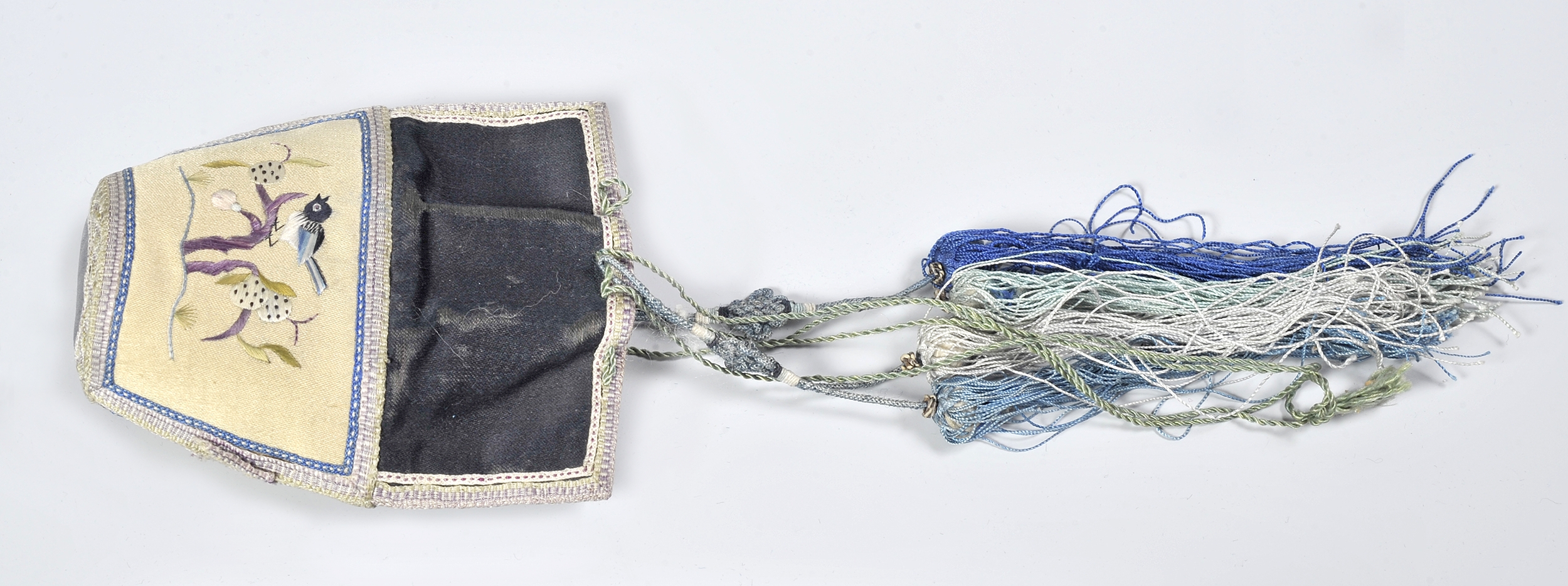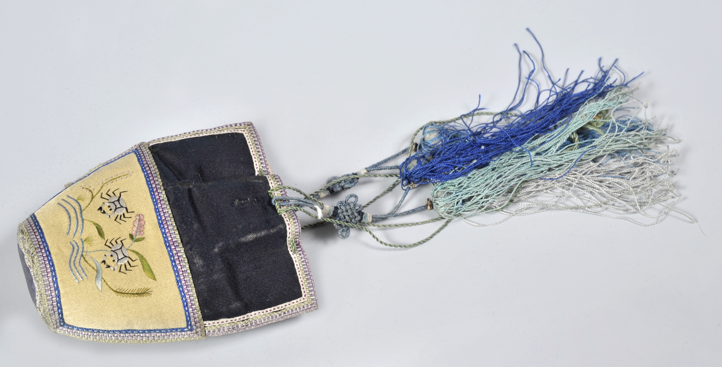 Chiński woreczek na tytoń z okrągłym, sztywnym dnem, z zamknięciem w formie ściągacza zakończonego czterema chwostami. Korpus sakiewki został ozdobiony z jednej strony haftowanym ptaszkiem siedzącym na drzewie, z drugiej strony dwoma krabami pośród roślin wodnych.