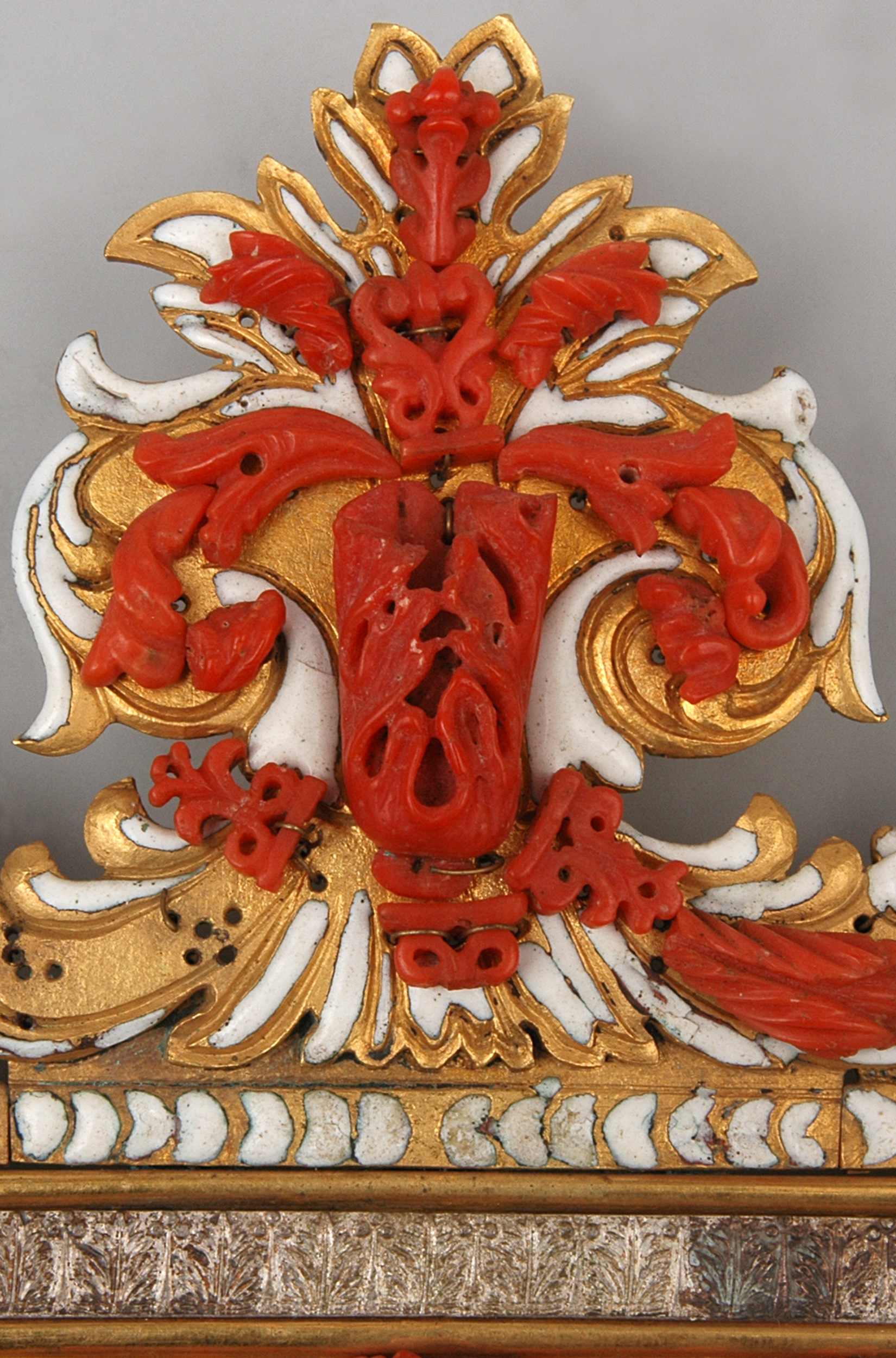 Efektowna oktogonalna kropielniczka jest dekorowana wyławianym w głębinach Morza Śródziemnego czerwonym koralem. Należy do jednych z najbardziej charakterystycznych produktów powstających w warsztatach rzemieślniczych Italii, otoczonej bogatymi w ten surowiec wodami. Ze względu, na wartość, przypisywane koralowi właściwości i trudność jego pozyskania, wyroby jubilerskie oraz nim dekorowane naczynia należały do wyrobów luksusowych. Do najczęściej zachowanych w kolekcjach, należą różnego kształtu paterki, szkatułki, sztućce, oprawy broni białej, oraz przedmioty do sprawowania kultu takie jak kropielniczki, relikwiarze, kielichy, pasyjki, ołtarzyki dewocyjne czy krzyżyki. Wilanowska kropielniczka w swojej formie nawiązuje do popularnych już w XVII w oktogonalnych relikwiarzy. Zapewne na indywidualne życzenie dodano do niej pojemnik na święconą wodę, wykonany z lapis lazuli, z figurką w niebieskiej niszy. Co charakterystyczne dla przedmiotów XVIII w., koral jest zamontowany na powierzchni metalowej płytki za pomocą stalowych drucików, a nie mocowany pod ażurową płytką. Całość ujęta została w szeroką srebrzysto-białą, partiami emaliowaną ramkę ze sterczynami, punktowo akcentowaną czerwonymi ziarnami korala. Kropielniczkę zaprezentowano warszawskiej publiczności podczas Wystawy starożytności i przedmiotów sztuki w 1856 r. w pałacu hr. Augustostwa Potockich przy Krakowskim Przedmieściu 32 (dziś: Muzeum Uniwersytetu Warszawskiego). Opisano ją w katalogu tej wystawy pod pozycją 564.