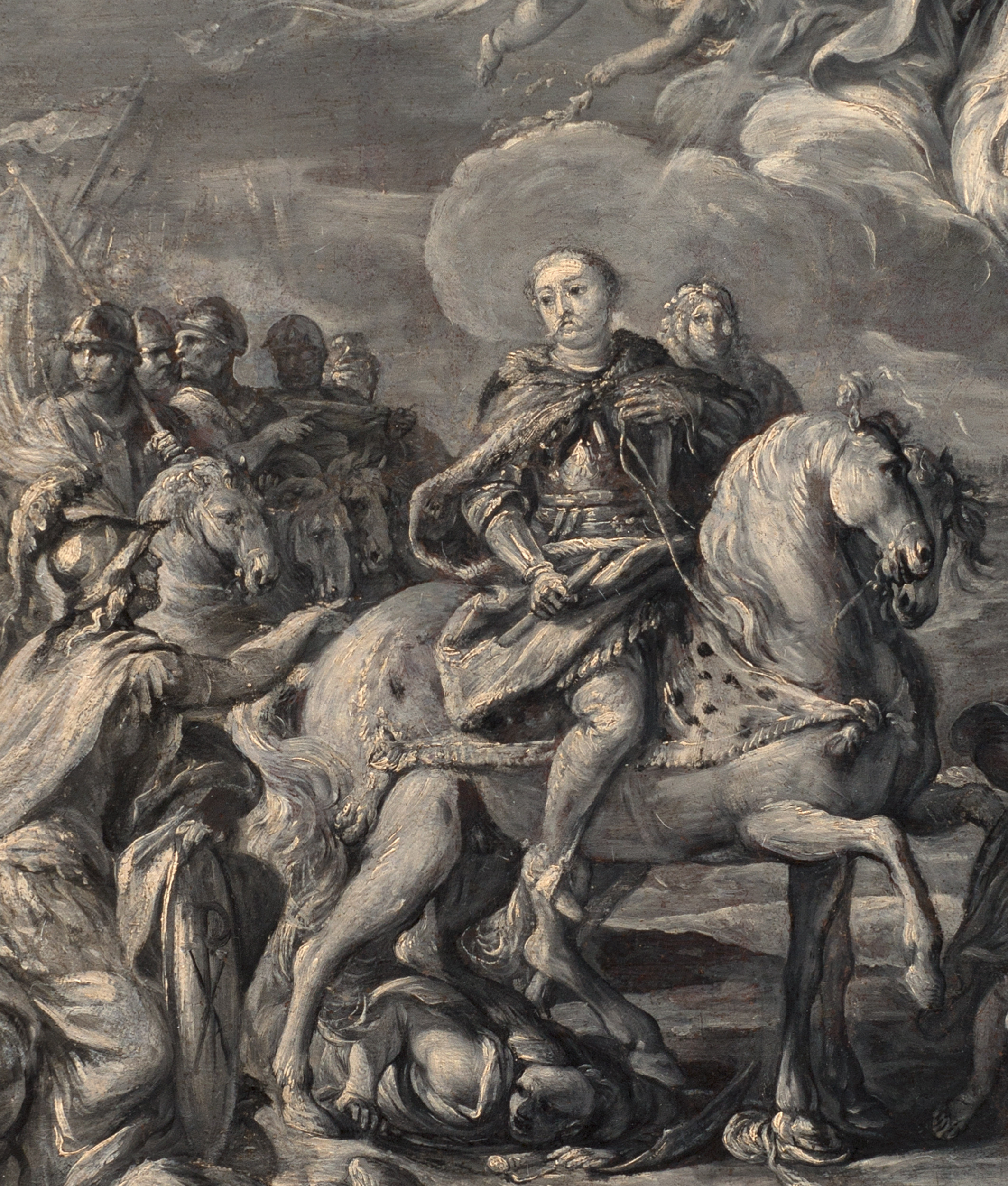 Malowana en grisaille apoteoza króla Jana III to kwintesencja barokowej formuły heroizacji króla-zwycięzcy. W ramie archiektonicznej, w której centrum kompozycyjnym widnieje pełna majestatu postać króla, jadącego konno na czele wojska ze sztandarami. Monarcha w płaszczu podbitym futrem, narzuconym na krótki pancerz, w prawej ręce trzyma regiment, w lewej lejce konia. Ten sposób przedstawienia bezpośrednio odsyła do bogatej symboliki konia i jeźdźca, związanej z walorami męstwa, siły i nieustraszoności.