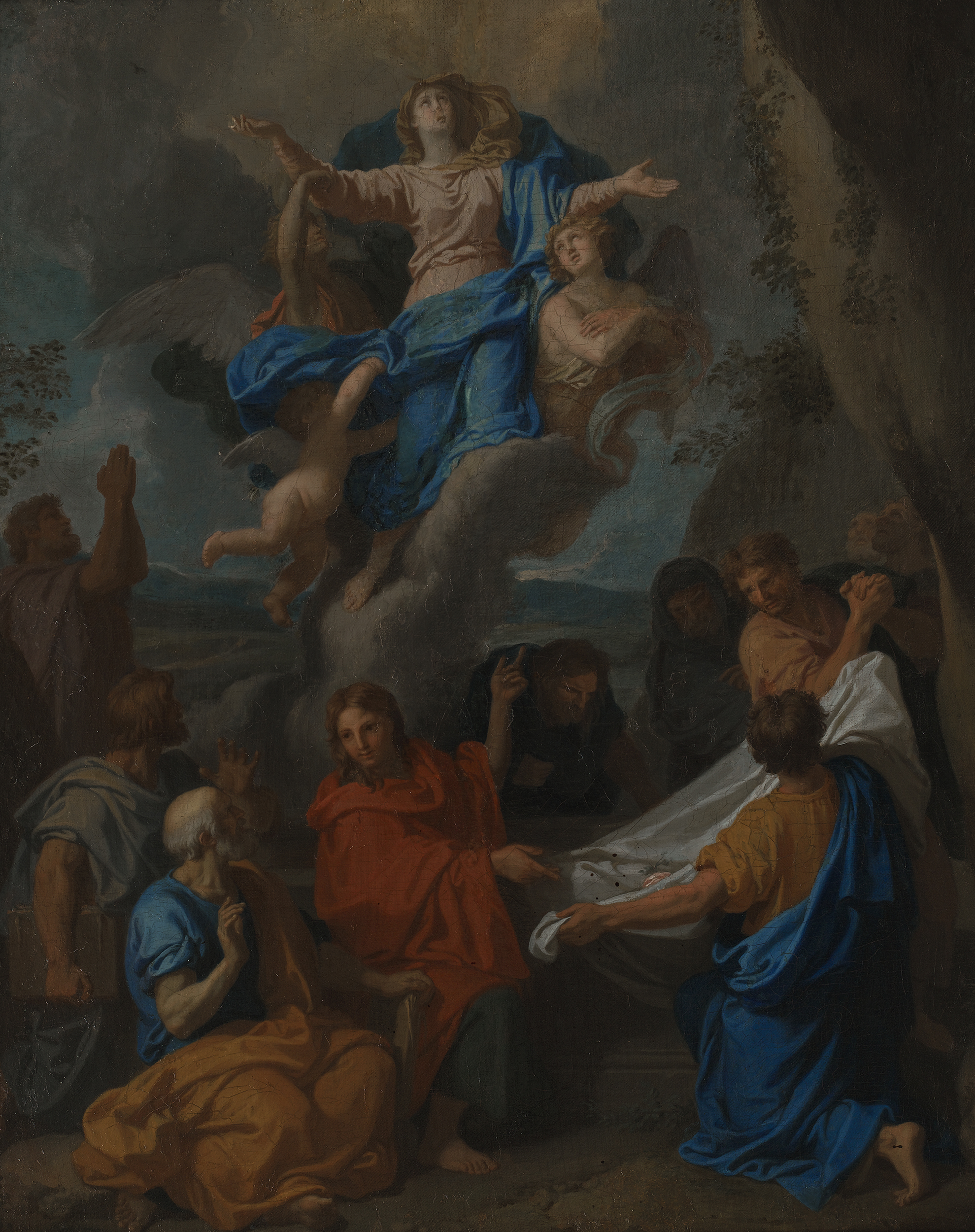 Nadprzyrodzone wydarzenie rozgrywa się na tle oszczędnego pejzażu, w pobliżu groty skalnej. Kompozycja dwustrefowa: ziemska i niebiańska. W górnej partii obrazu podtrzymywana przez anioły Madonna unosi się na chmurze ku niebu. W dolnej – na ziemi, na pierwszym planie grupa apostołów. Z lewej strony obrazu czterech, którzy gwałtownymi gestami wyrażają zaskoczenie tym wyjątkowym wydarzeniem. Z prawej, obok kamiennego sarkofagu trzech innych rozwija pusty biały całun, na którym leży kwiat róży – symbol Marii i miłości Bożej. Od postaci Madonny bije światło skierowane na całun i cztery postacie apostołów. Pozostali są w cieniu. W scenie tej brakuje trzeciej sfery ukazującej królestwo niebieskie, w której tradycyjnie był przedstawiany Bóg Ojciec, albo cała Trójca Święta.