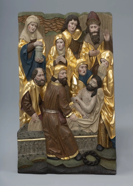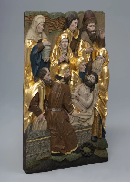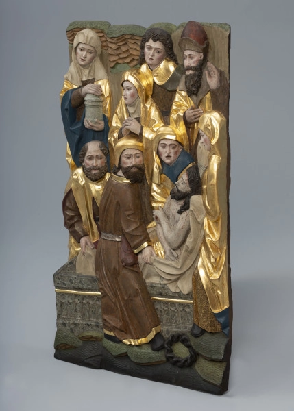 Płaskorzeźba ze sceną złożenia Jezusa do grobu stanowi pozostałość ołtarza głównego z kościoła Mariackiego w Dąbiu, który uległ zniszczeniu na skutek pożaru kościoła w 1894 roku. Dawne opisy i ocalałe fragmenty przybliżają jego pierwotną formę. Retabulum w typie popularnego w średniowieczu tryptyku wypełniały płaskorzeźbione kwatery ukazujące sceny pasyjne z centralnie usytuowanym Ukrzyżowaniem oraz przedstawieniami Zmartwychwstania i Koronacji Marii. Podobnie skomponowane ołtarze pasyjne z Zwischenahn (Dolna Saksonia) oraz z Bad Segeberg (Szlezwik-Holsztyn) przywoływane są jako analogie dla ołtarza z Dąbia.