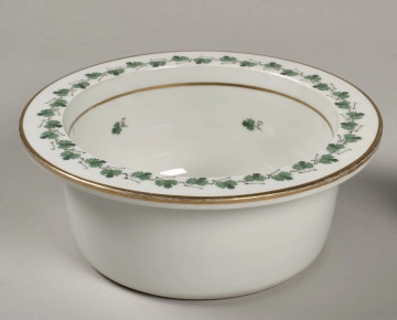 Dzbanuszek z serwisu obiadowego we wzór polnych traw. Dzbanuszek wchodzi w skład serwisu obiadowego wykonanego w manufakturze porcelany w Wiedniu. Powstała ona w 1718 r., jako druga w Europie, po Miśni, manufaktura porcelany, działała do 1864 r. Serwisy obiadowe, śniadaniowe, do herbaty, kawy i czekolady stanowiły zasadniczą część produkcji wiedeńskiej wytwórni, zwłaszcza od 4ćwierci XVIII w. Serwis obiadowy, którego część została zakupiona przez muzeum powstał w okresie kiedy manufakturą wiedeńską kierował Matthias Niedermayer (1805r. – 1827r.). Zakupiona część serwisu składa się z kilkudziesięciu sztuk: talerzy płytkich, waz na zupę, salaterek, koszyków na owoce, półmisków, solniczek, dzbanka i dzbanuszka. Serwis ten został zakupiony przez muzeum w Łańcucie w 1964 r. od Franciszka Żaby. Teresa Grzybkowska błędnie uważa, iż serwis ten zamówiła właścicielka łańcuckiego zamku Elżbieta Lubomirska (1736 - 1816) dla Henryka Lubomirskiego, który był jej wychowankiem (T. Grzybkowska, „Kobieta wodzem chwalebnego czynu”, Warszawa-Toruń 2018, s. 228, il. 144). Jest to serwis w stylu klasycystycznym. Wykonany został z mlecznobiałej porcelany. Zdobiony jest we wzór polnych traw malowanych dwoma odcieniami zieleni: trawiastą i grynszpanową oraz ciemnoszarym kolorem w postaci delikatnych linii uplastyczniających rysunek traw. Zielone pasma traw gdzieniegdzie urozmaicają małe kwiatuszki, malowane rdzawą czerwienią i chabrowym błękitem oraz jasną żółcią znaczącą ich środki. Dzbanuszek z serwisu jest wysmukły, z owoidalnym brzuścem, przewężoną szyjką, z szerokim, wywiniętym wylewem i wysokim zaokrąglonym uchem. Zdobiony na brzuścu wzorem polnych traw. Brzegi naczynia i szyjka podkreślone złoconymi paskami, na uchu złocony ornament.