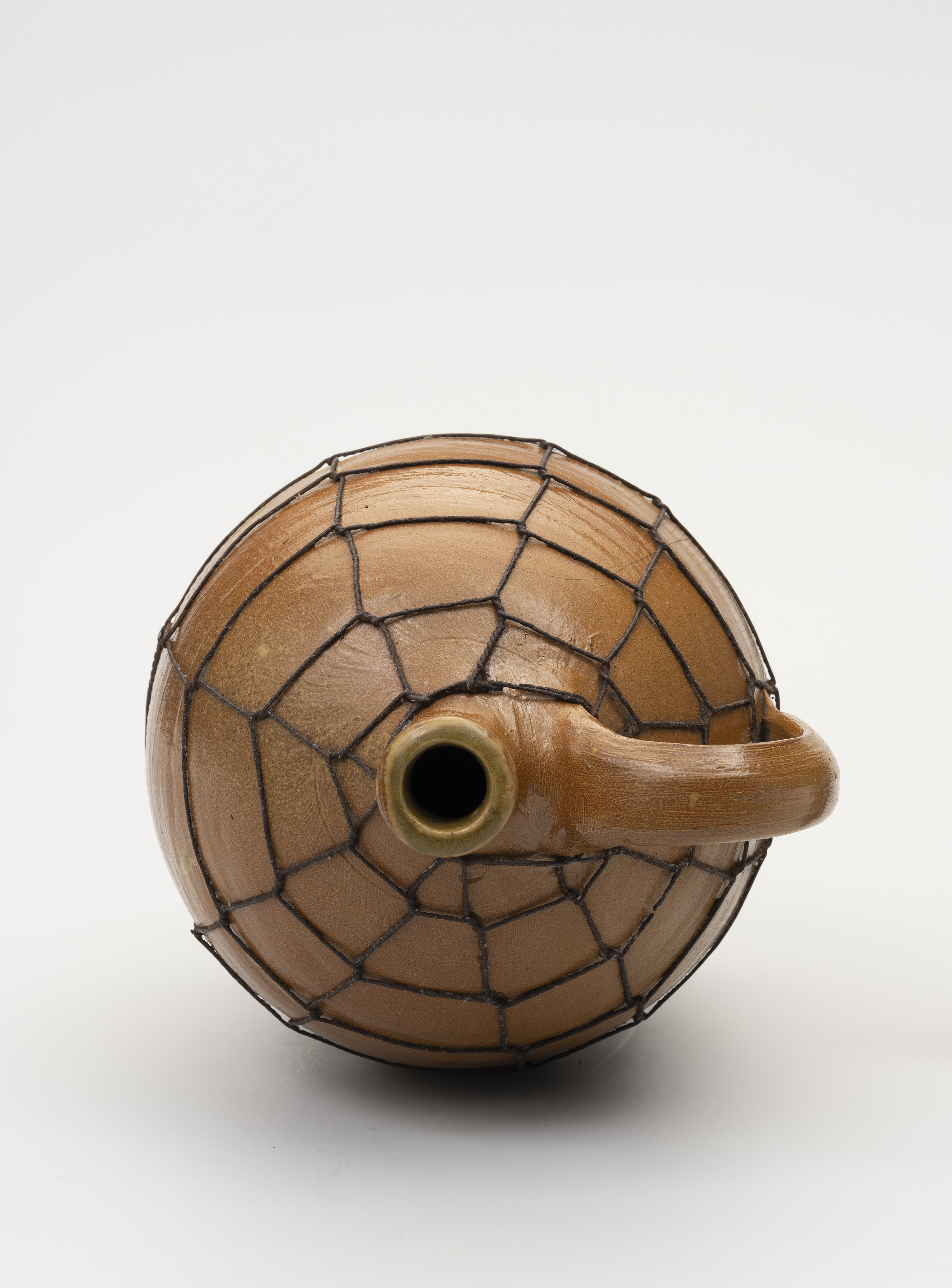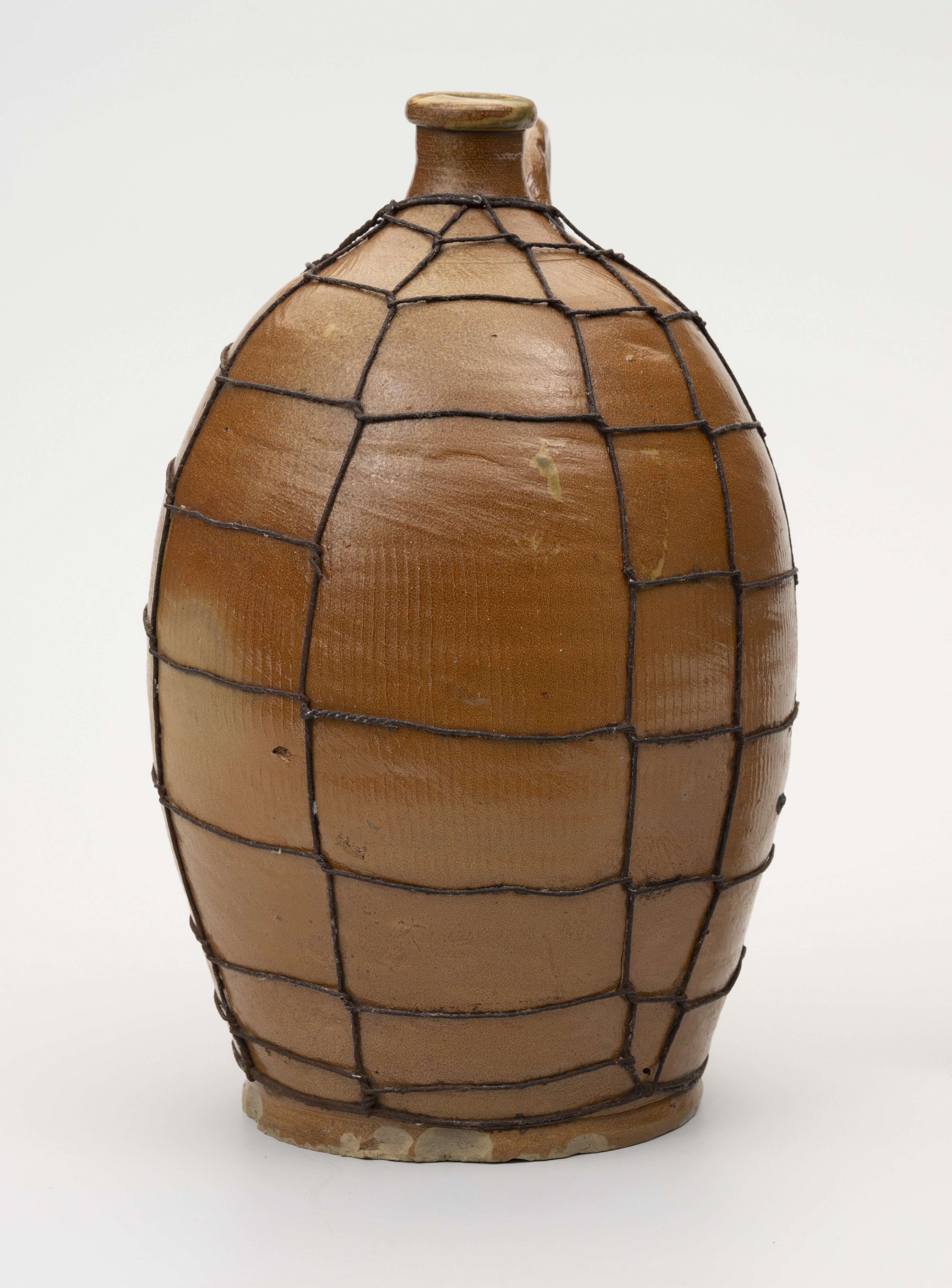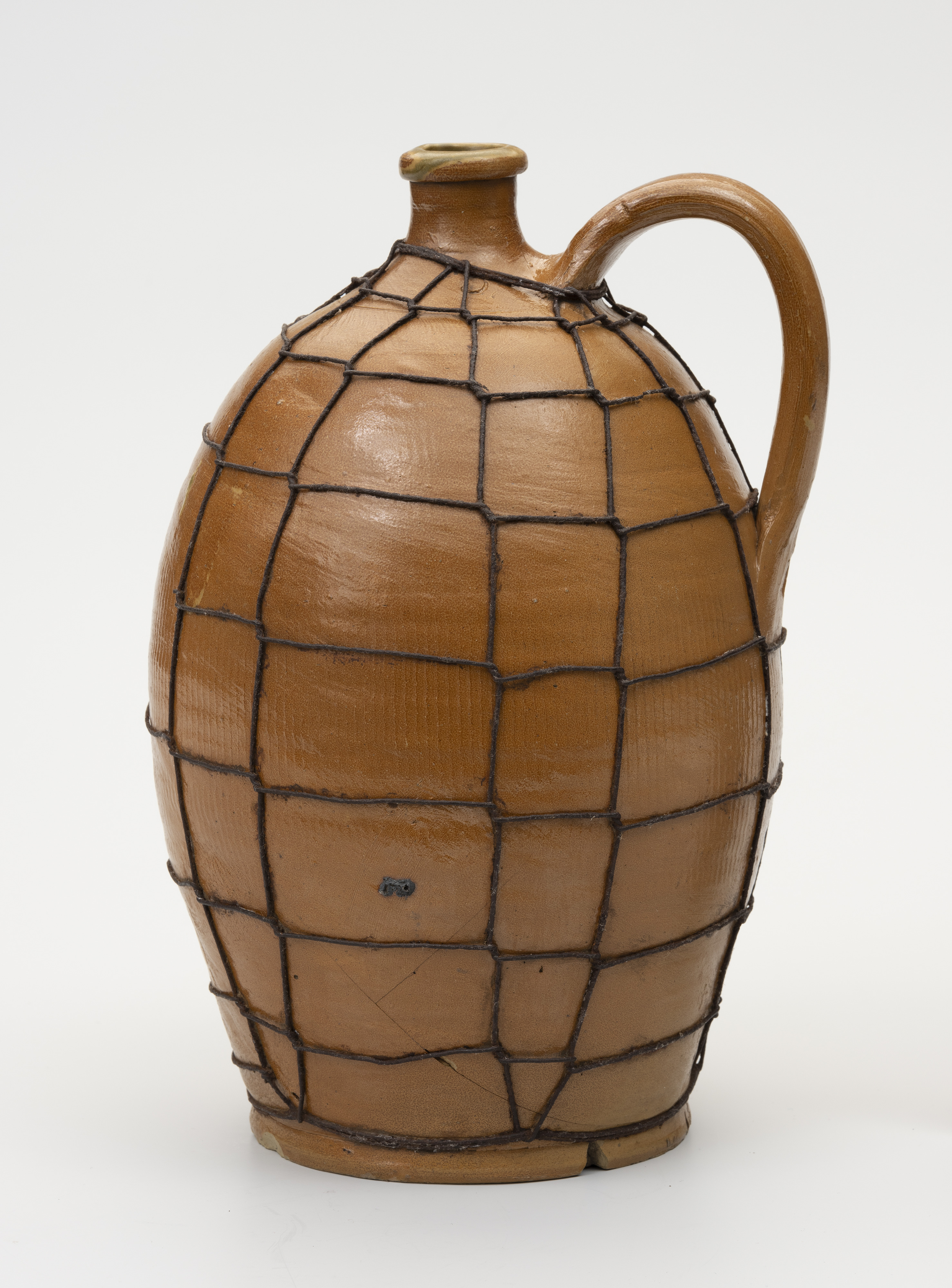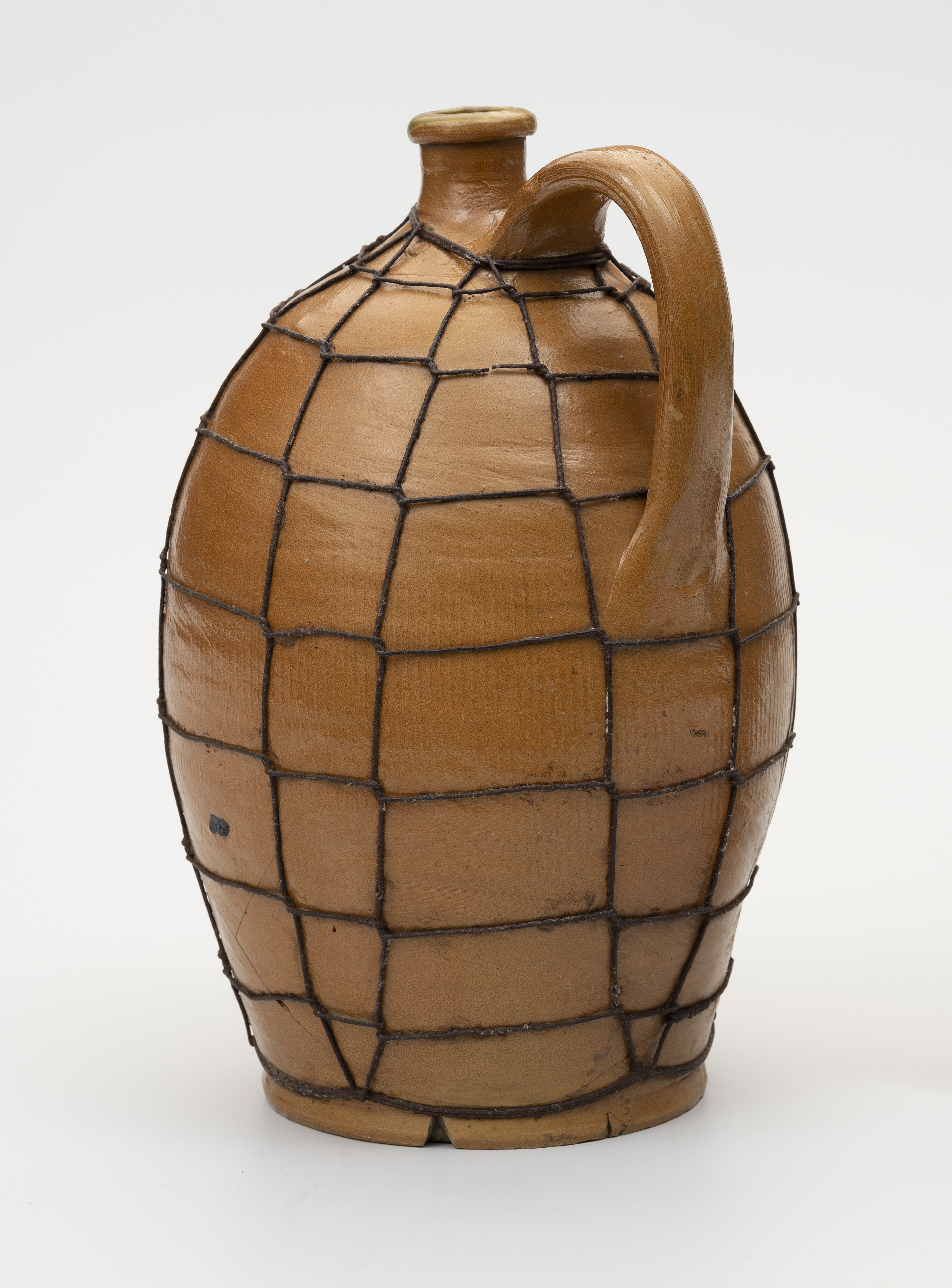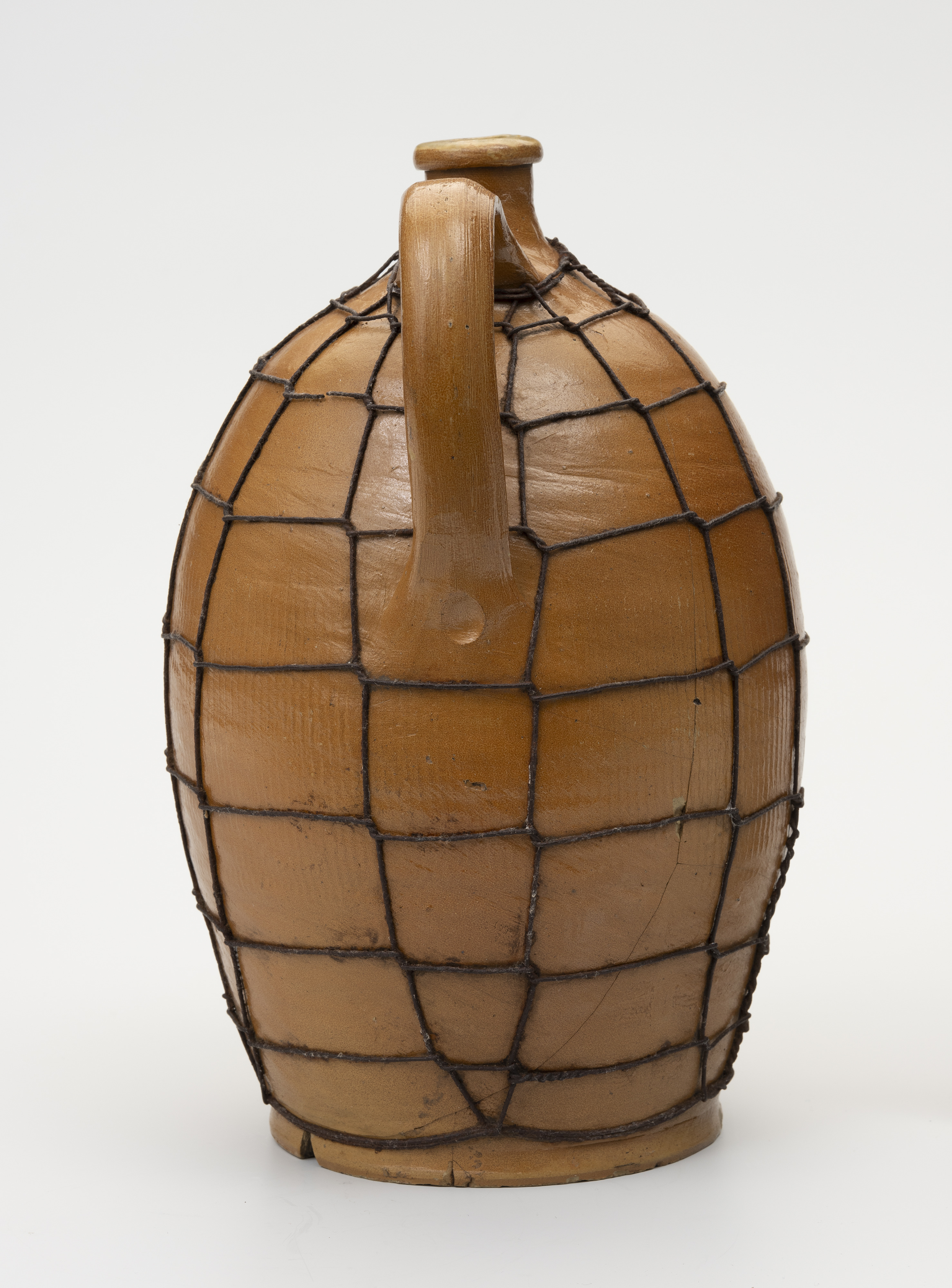Ze względu na kolor oraz jakość naczynia, z dużym prawdopodobieństwem można sądzić, że prezentowana butla została wykonana właśnie w ośrodku bolesławieckim. Znajdująca się na flaszy druciana siatka nie jest oryginalnym elementem, stanowi natomiast świadectwo późniejszej naprawy.