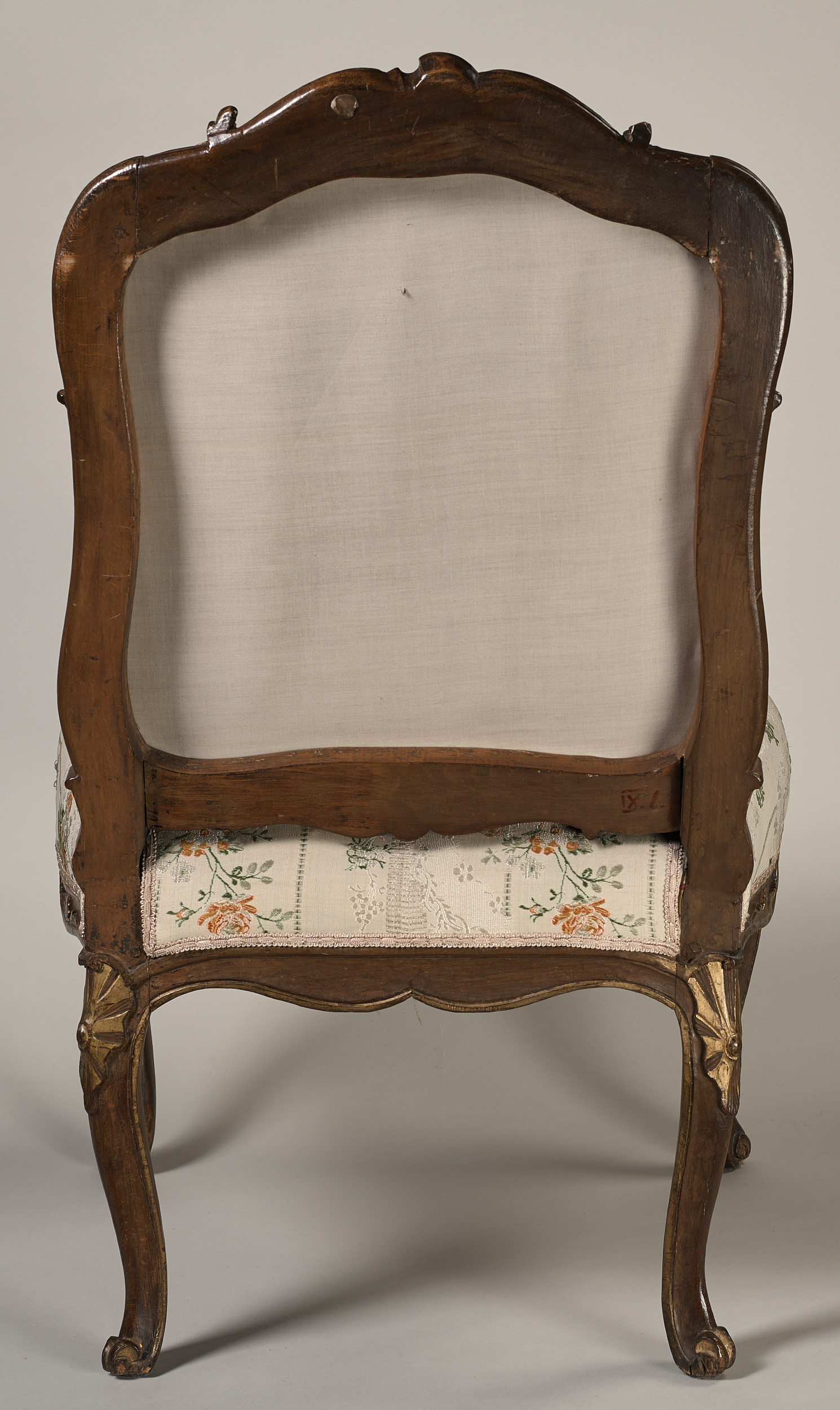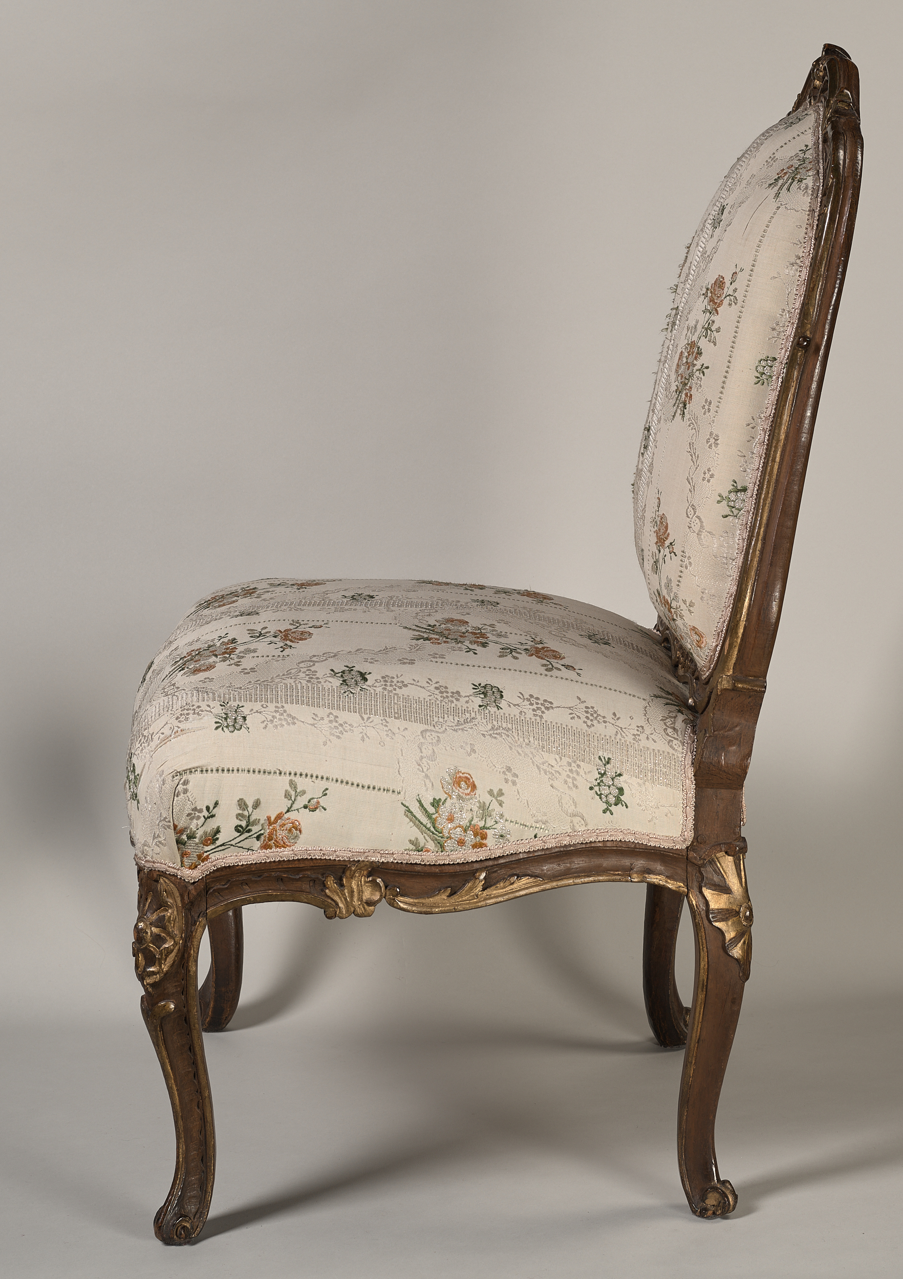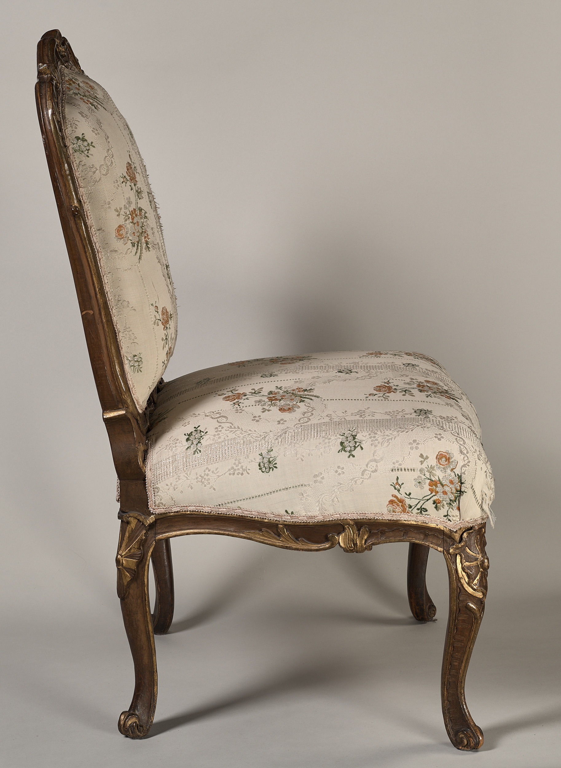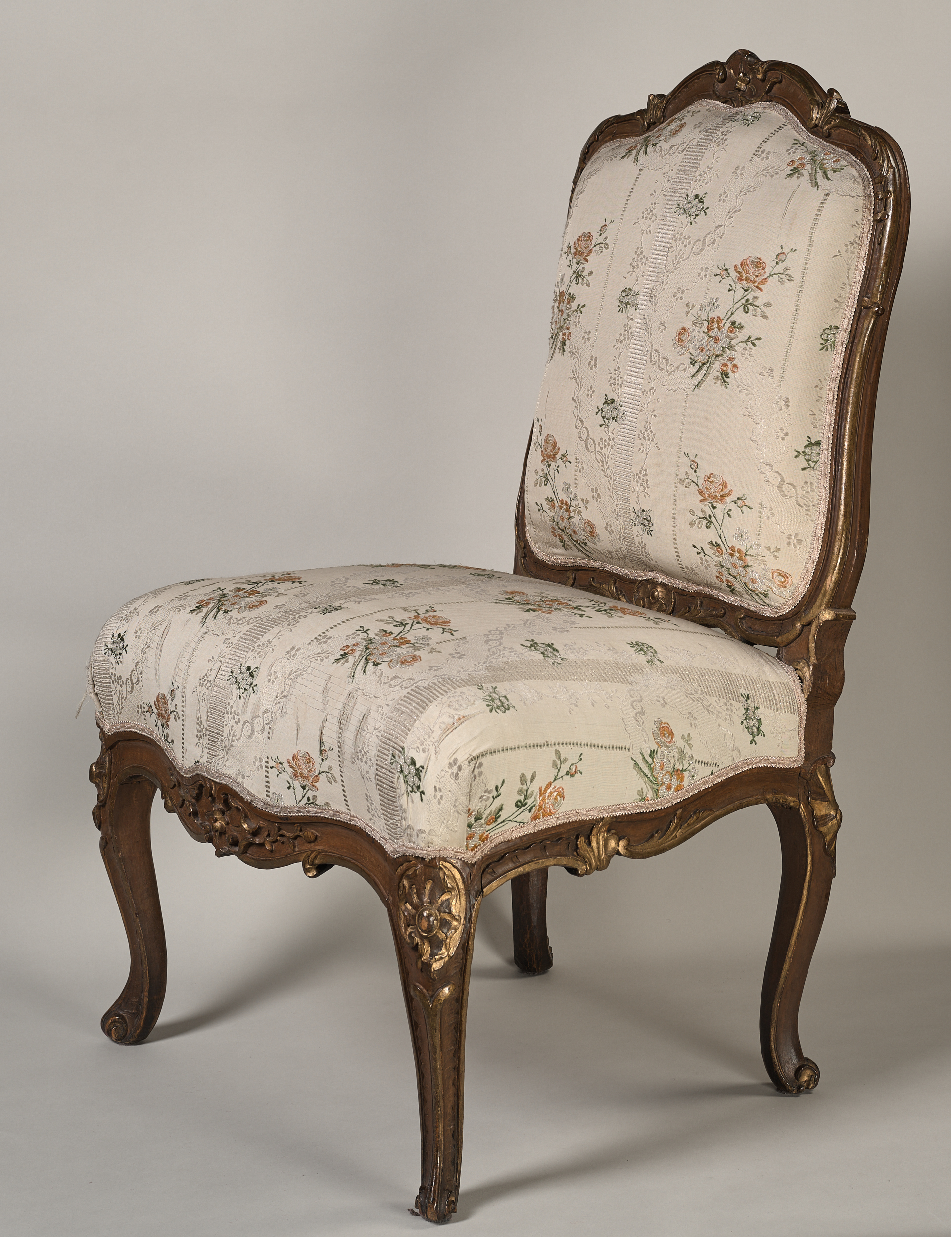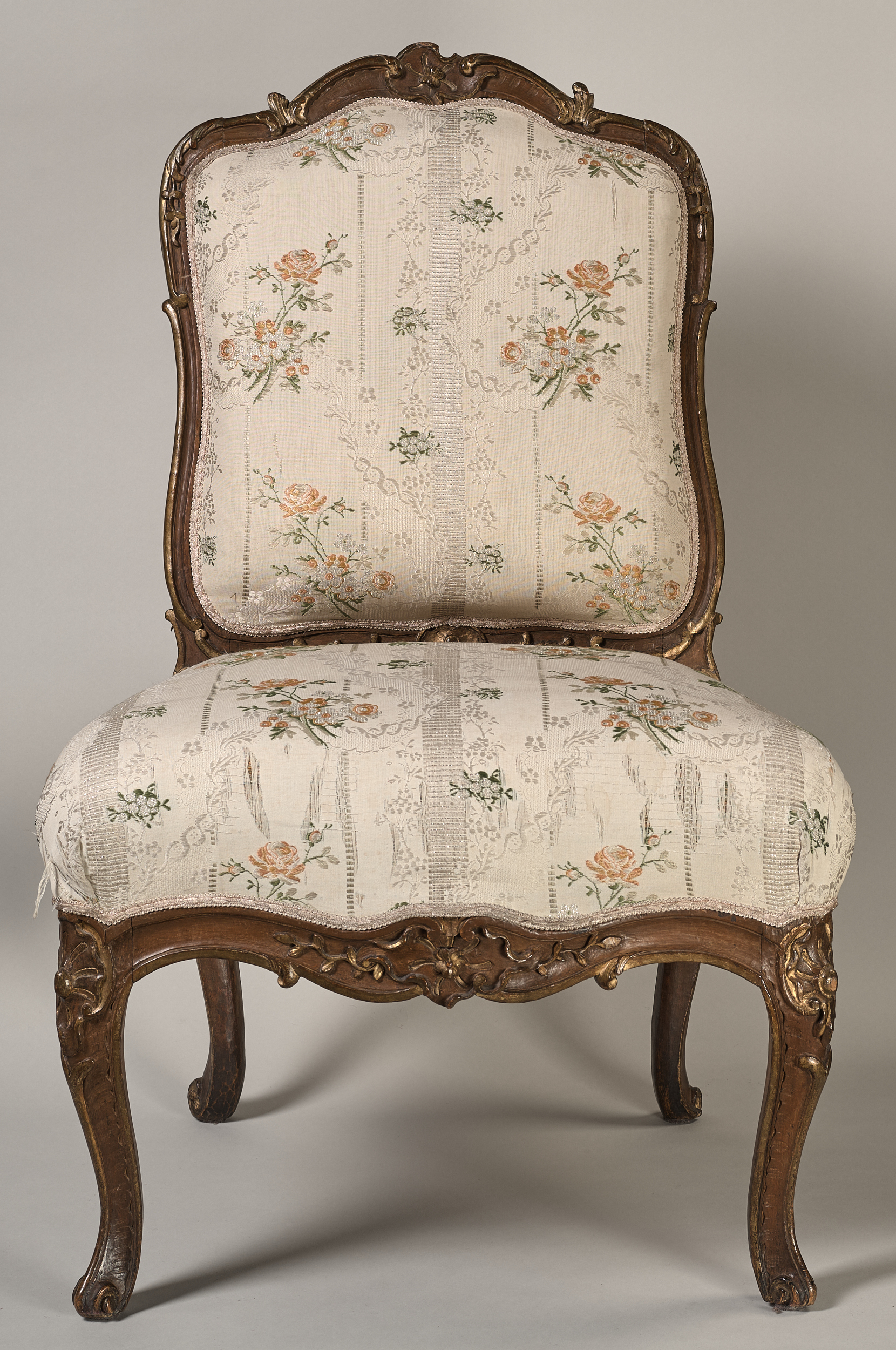 Oto krzesło. Rokokowy mebel. Skupieni na jego pochodzeniu, cechach stylistycznych, kształcie i ozdobach zapominamy, że sprzęt ten spełniał funkcję użytkowo-reprezentacyjną. Jego szkieletowa konstrukcja jest jedną z najczęściej stosowanych w czasach nowożytnych. Podstawę siedziska tworzy oskrzynienie złożone z czterech połączonych ramiaków. Od spodu z naroży oskrzynienia wychodzą wygięte nogi, które w rokokowych krzesłach zazwyczaj nie mają łączyn. Boczne ramiaki oparcia stanowią przedłużenie tylnych nóg. Konstrukcję oparcia domykają ramiaki poziome. W prezentowanym egzemplarzu istnieje prześwit pomiędzy siedziskiem i oparciem, wykonanymi w pełnej tapicerce. Szkielet mebla jest ukształtowany i ozdobiony w typowy dla stylu rokoka sposób. Zapoczątkowany we Francji w czasach panowania króla Ludwika XV styl rokoko ogarnął całą Europę. W Austrii i na terenach pozostających pod wpływem dynastii Habsburgów, rokoko przeżywało największy rozkwit w czasach panowania cesarzowej Marii Teresy Habsburg. Od jej imienia środkowoeuropejska odmiana rokoka nazywana jest stylem Marii Teresy lub terezjańskim. W tej odmianie rokokowe dekoracje są dodatkiem do konstrukcji i nie naruszają tektoniki mebla, co widać na prezentowanym egzemplarzu.