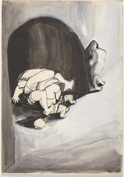Rysunek przedstawia scenę gwałtu na Żydówce dokonywanego przez hitlerowskiego żołnierza; na drugim planie widać chowającego się za bramą naocznego świadka tej zbrodni. Jest to jedna ze scen jawnej przemocy wobec ludności żydowskiej, w tym przemocy seksualnej wobec kobiet, do której nieustannie dochodziło podczas okupacji niemieckiej.