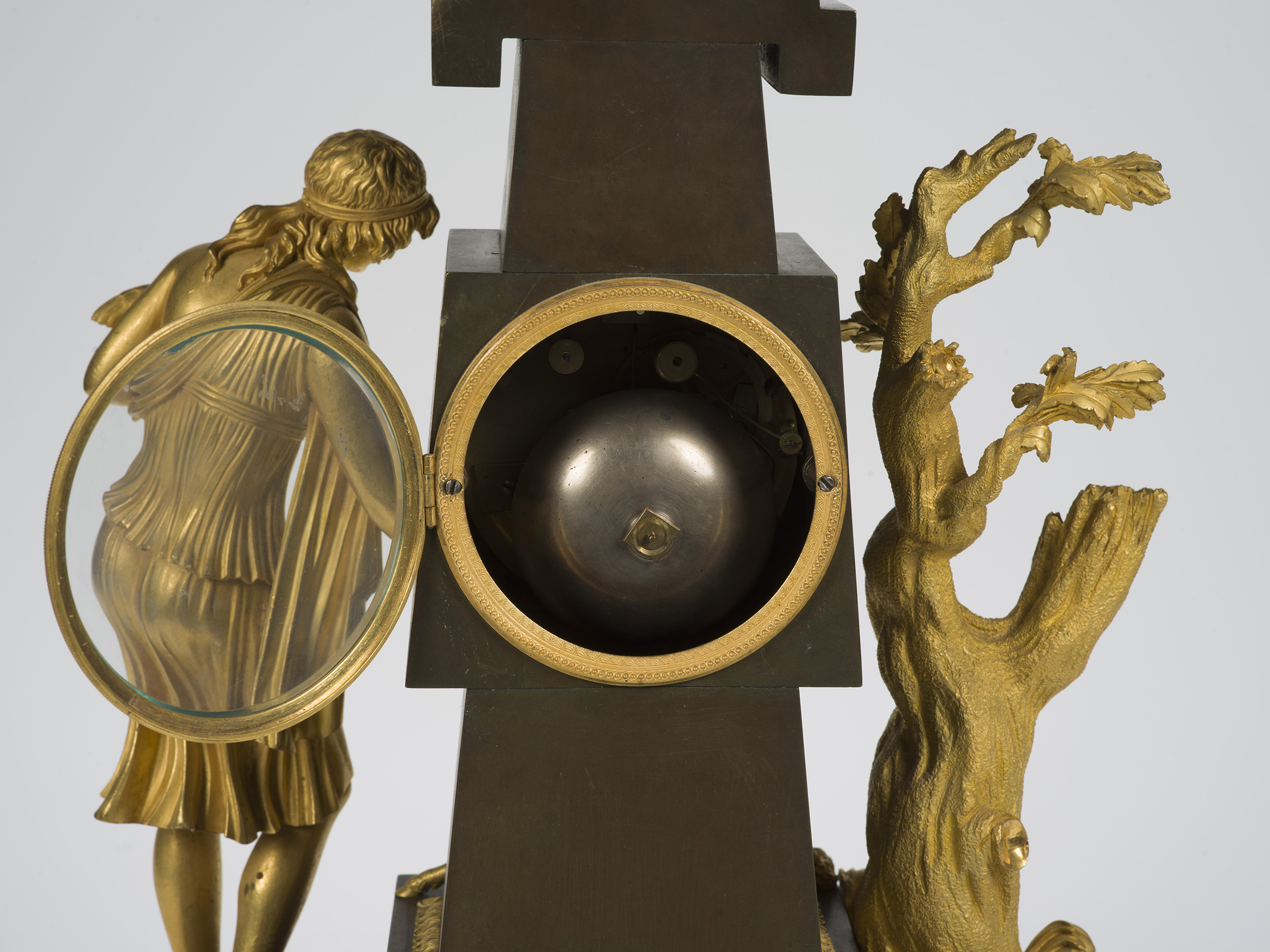 Mechanizm ukryty w obelisku ma napęd sprężynowy oddzielny dla funkcji chodu (oddzielny dla bicia półgodzin i godzin) i wychwyt kotwicowy. Długość zawieszenia krótkiego, lekkiego wahadła na zawieszce nicianej można regulować w czterech różnych pozycjach oddzielnym pokrętłem. Tarcza zegara ze wskazaniami minut i godzin dwoma wskazówkami oraz z dwoma otworami naciągu sprężyn. Bicie godzin i półgodzin z paryskiego koła zapadowego z regulatorem wiatraczkowym.