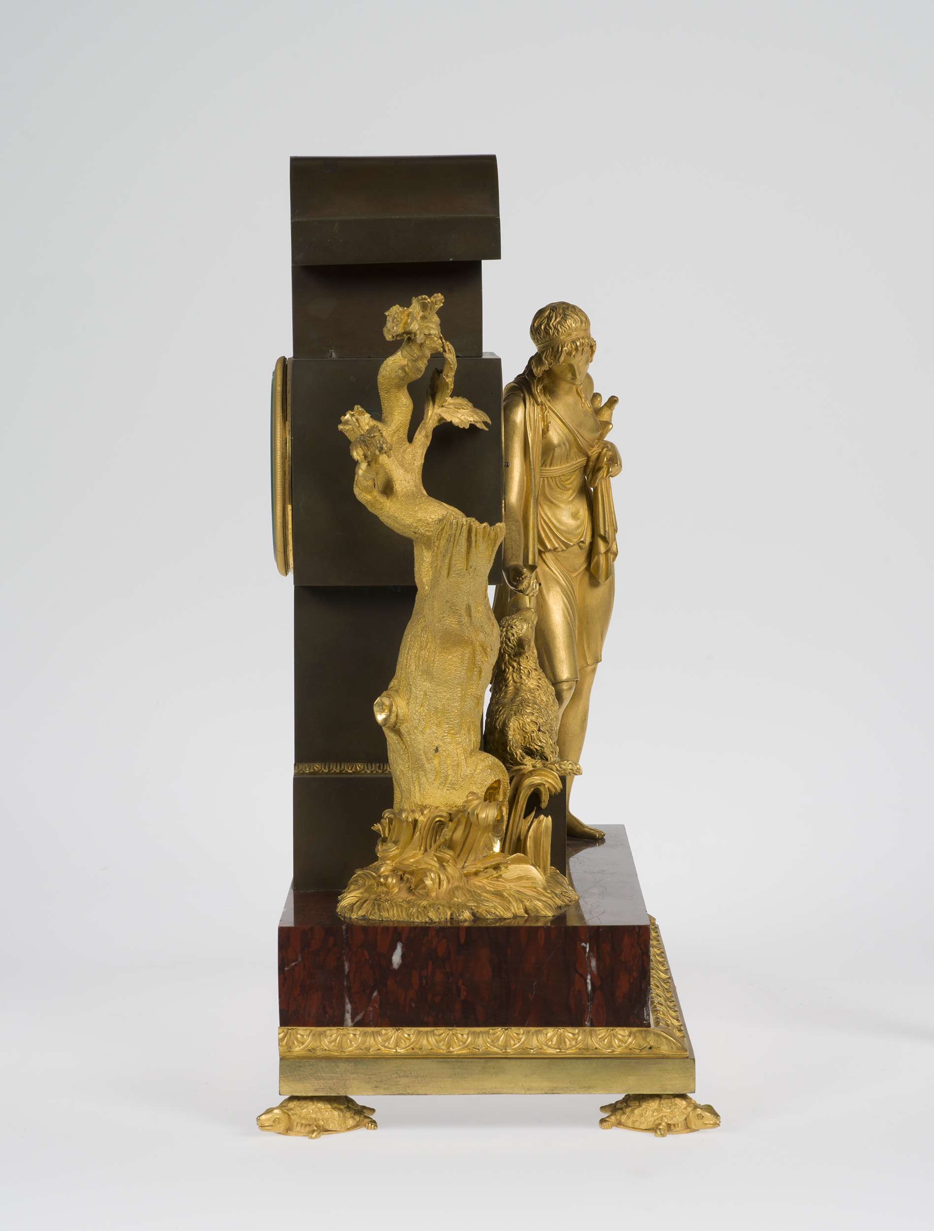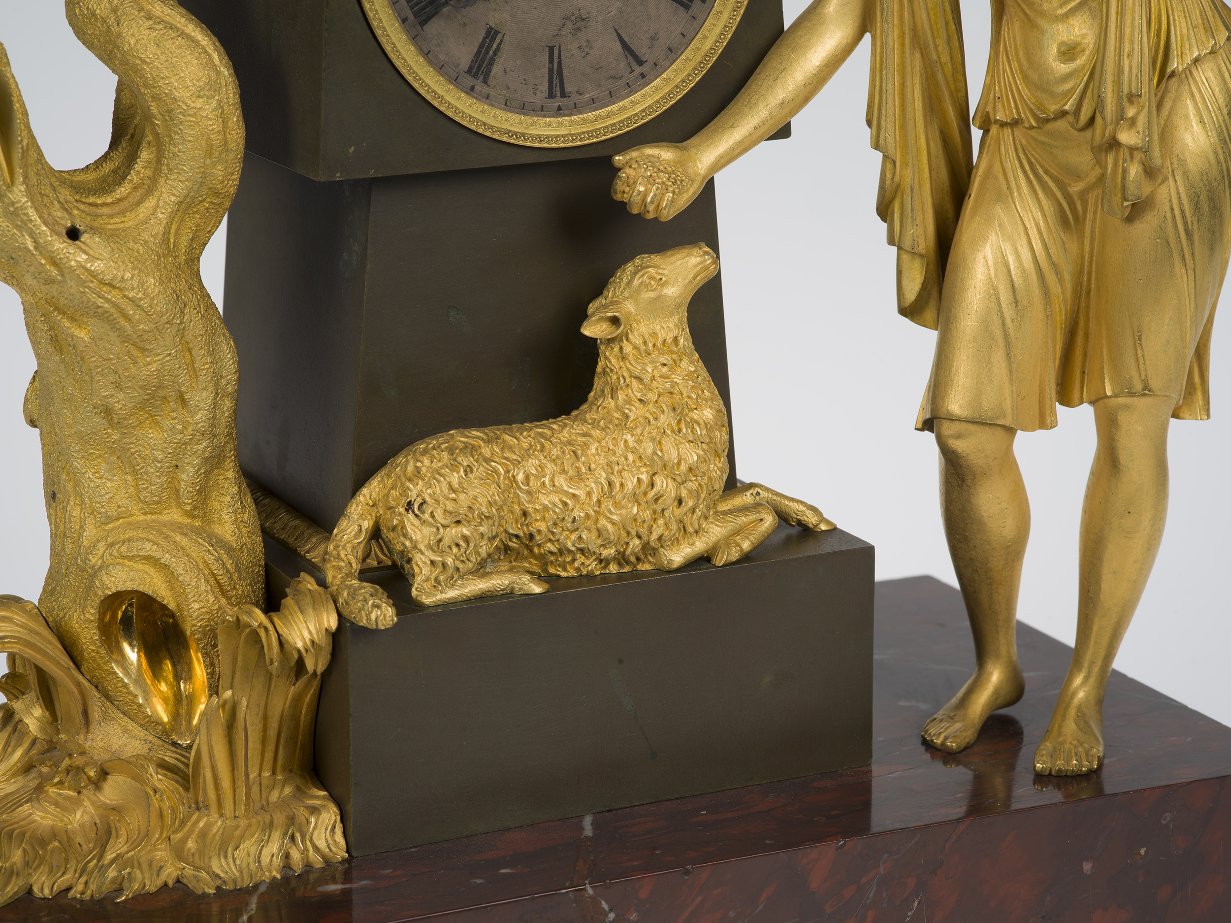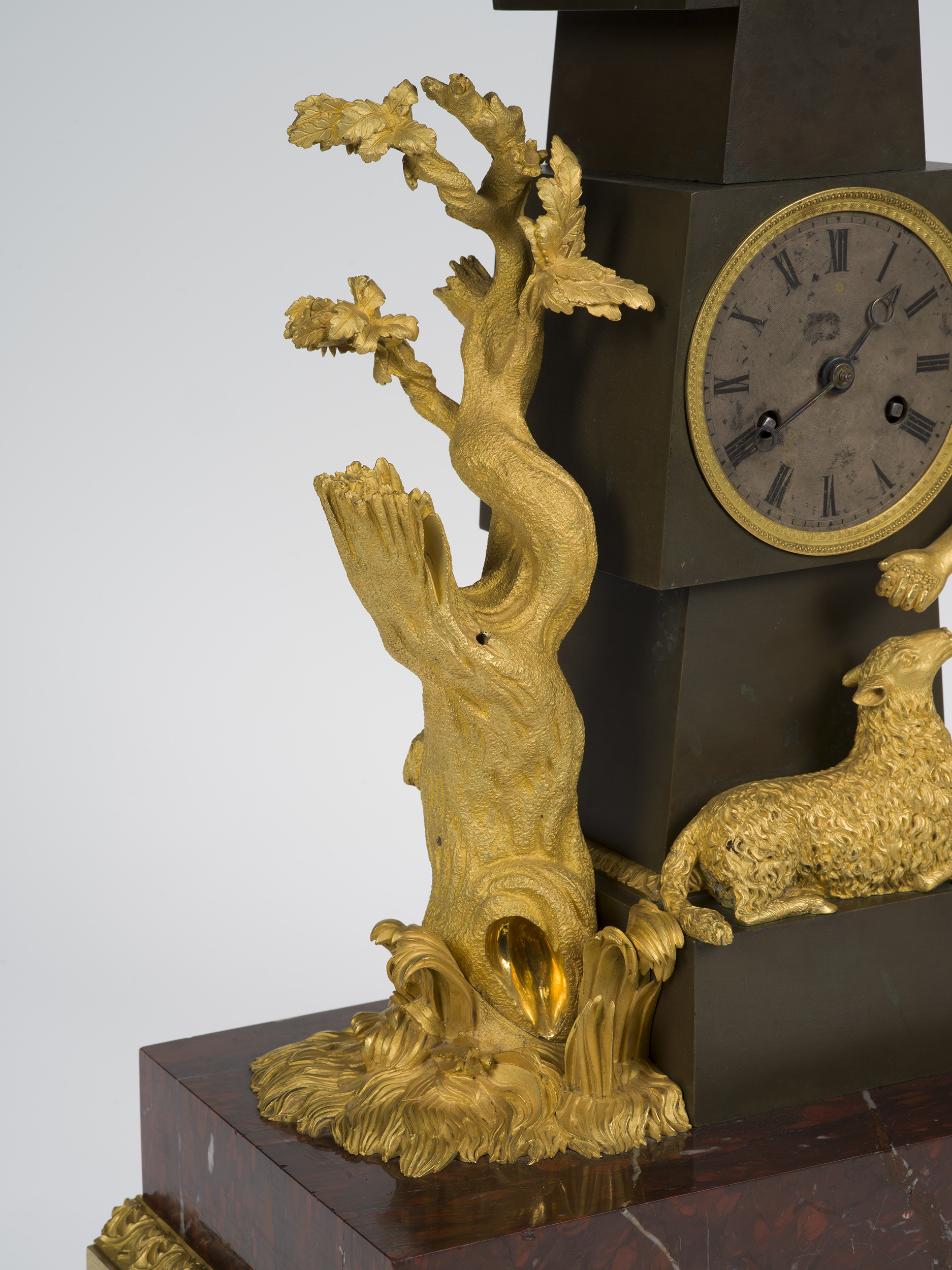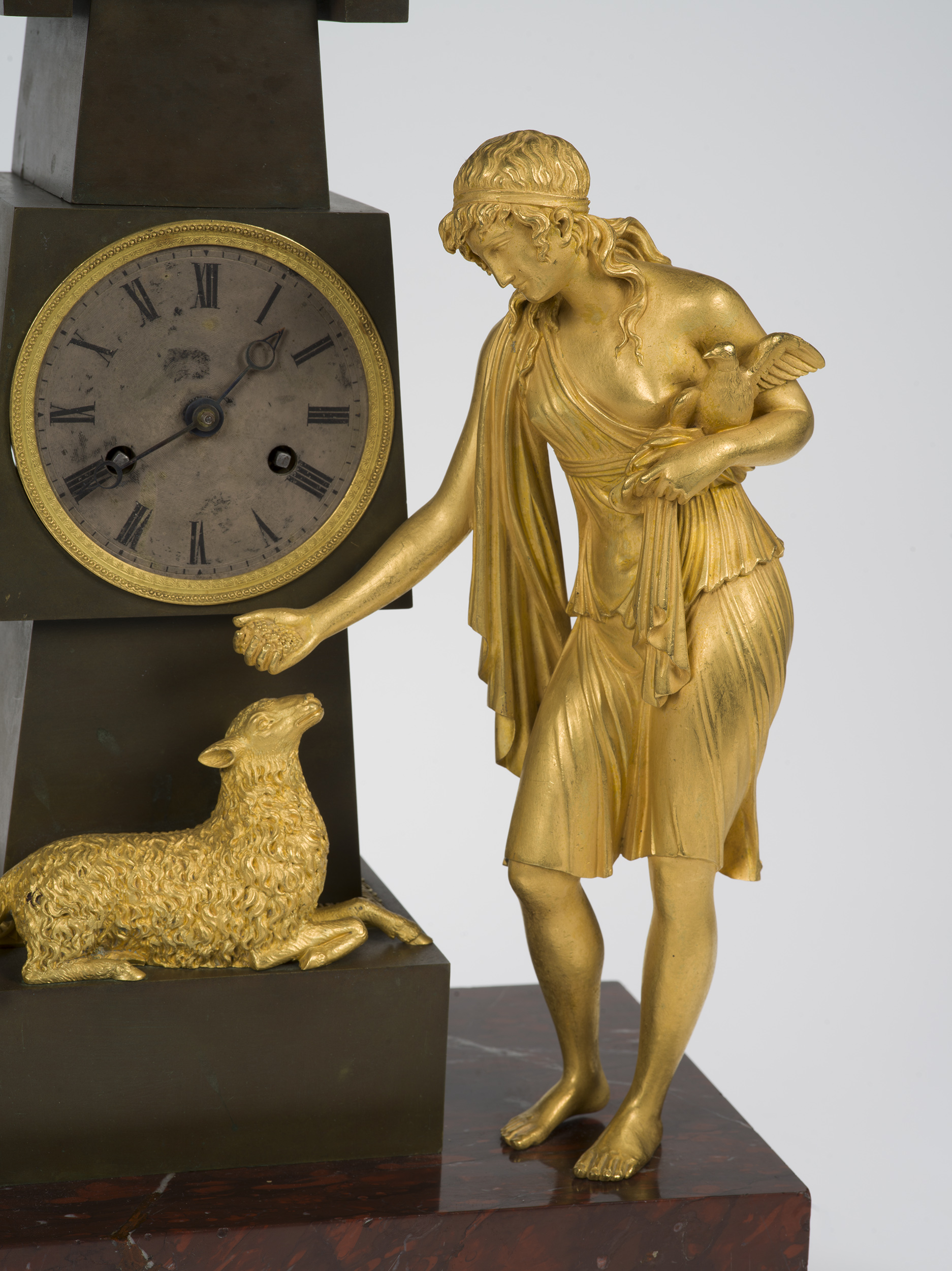 Paryski zegar kominkowy, z mechanizmem odmierzającym minuty i godziny posiada rzeźbiarską obudowę figuralną, będącą dekoracją kominka, w której każdy element jest nośnikiem treści symbolicznych, stanowiących przesłanie pomyślnych życzeń. Na niskiej podstawie z czerwonego marmuru ustawiony jest ciemny obelisk z brązu patynowanego. W jego centralnym rozszerzeniu umieszczono mechanizm zegara z okrągłą, srebrzoną tarczą zegarową otoczoną złoconą ramką z perełkowaniem. Z prawej strony obelisku postać pasterki w krótkiej tunice, przytrzymująca lewą ręką gołębia, prawą karmiąca owcę leżącą na cokole obelisku. Z lewej strony obelisku drzewo ze złamanymi konarami, na których wyrastają młode gałązki. Gołąb to najczęściej stosowany atrybut Wenus italijskiej - bogini wiosny, miłości i odradzającego się życia podobnie jak młode gałązki złamanego konaru. Owca jest symbolem ofiarności, łagodności, uległości. Żółwie na których wspiera się podstawa obudowy symbolizują długowieczność i stabilizację.