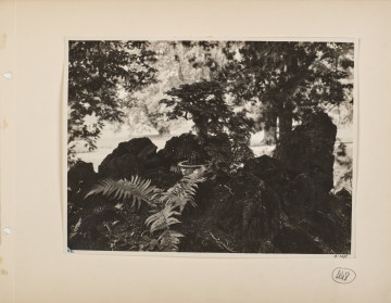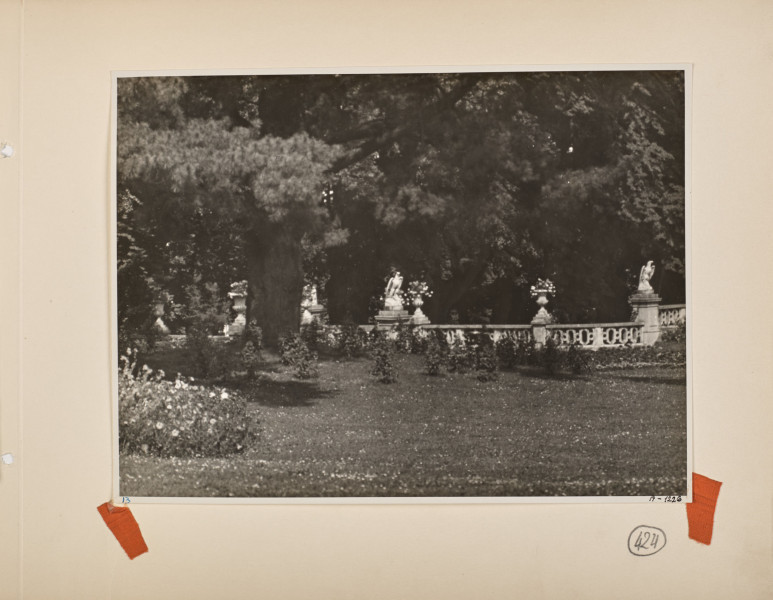 Fotografia przedstawia fragment wewnętrznego parku łańcuckiego od strony zachodnio-południowej z fragmentem gazonu o na nasadzeniami- kwiatami i krzewami, oraz z fragmentami mostu głównego. Podczas modernizacyjnych prac w rezydencji łańcuckiej, prowadzonych przez III ordynata Romana Potockiego i jego żonę Elżbietę z Radziwiłłów, wzniesiono w miejscu poprzedniego wzniesionego przez I ordynata, nowy, kamienny most główny z balustradą ozdobioną rzeźbami puttów i orłów oraz wazami, w których od wiosny do jesieni, sadzono rośliny ozdobne. Most ten zachowany jest do dzisiaj. W tle widoczna jest lipowa aleja zasadzona wokoło fosy jeszcze przez księżnę Izabellę Lubomirską (zm. w 1816 r) po rozsunięciu wałów usypanych pierwotnie przed fosą. Ziemne wały wraz z murami i fosą tworzyły wzniesione w XVII wieku fortyfikacje łańcuckie. W końcu XVIII wieku systemem ten był już nieużyteczny- założono więc wewnątrz fosy, w bezpośrednim otoczeniu zamku pierwszy ogród a wokoło fosy zasadzono po rozsunięciu wałów, obiegającą fosę aleje lipowe. Aldona Cholewianka-Kruszyńska
