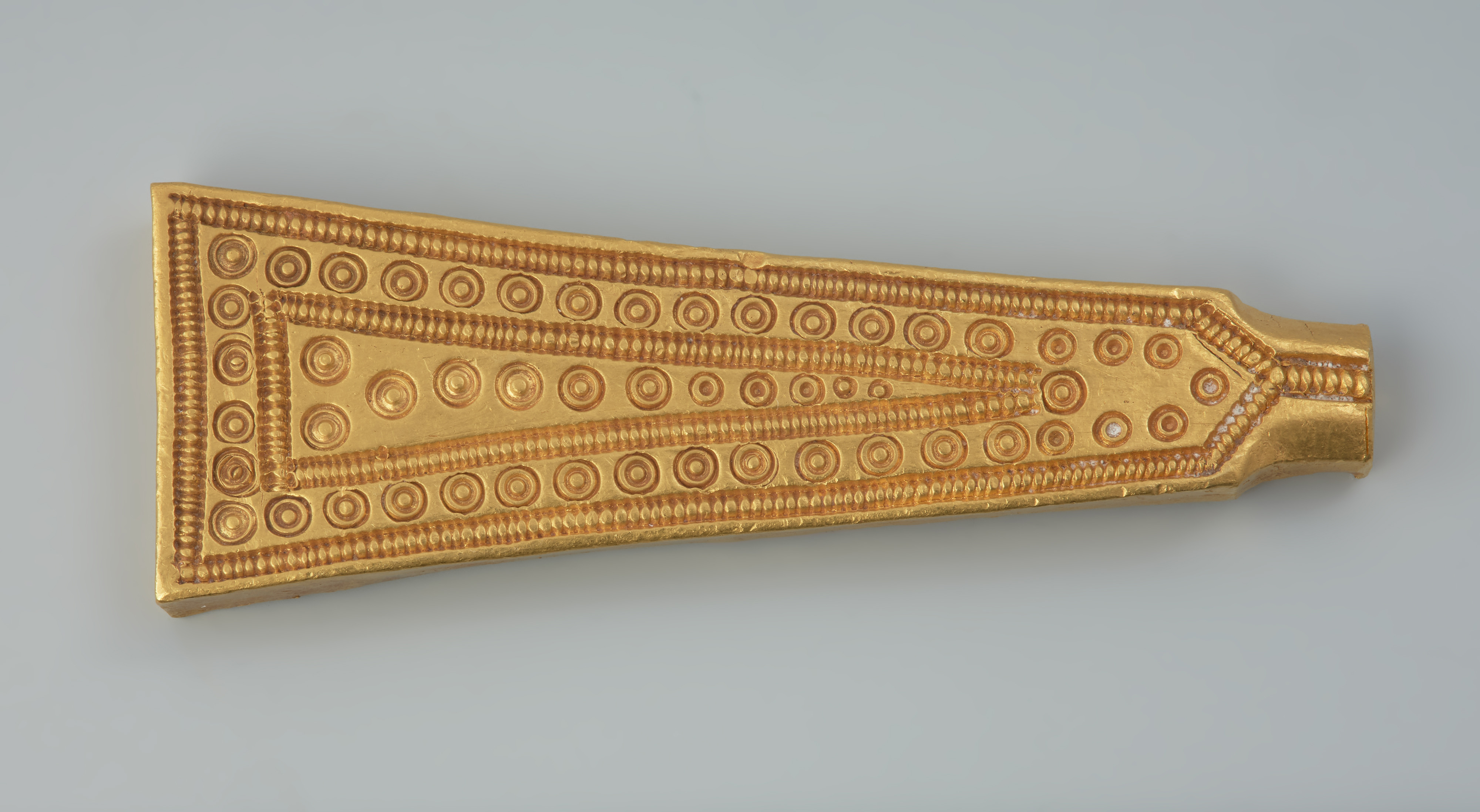 Płytka ze złota ma formę symetrycznego klina, który przechodzi na węższym zakończeniu w imitację owalnej w przekroju nasady lub ucha. Jest zdobiona tylko na zewnętrznej stronie ornamentem pseudoperełkowym i motywem koncentrycznych kółek. W zbiorach Działu Archeologii Muzeum Narodowego w Szczecinie znajdują się dwie takie niemal identyczne złote płytki ze Skalina, znalezione razem. Szczegóły odkrycia oraz kontekst, w jakim wystąpiły nie są znane. Ze źródeł archiwalnych wiadomo jedynie, że oba przedmioty znaleziono w latach trzydziestych XX wieku na terenie na żwirowni pod Skalinem. Należy je wiązać z ludnością grupy dębczyńskiej i datować na V wiek. Grupa dębczyńska, podobnie jak większość grup i kultur archeologicznych, dzieli się na fazy rozwojowe, w tym przypadku dwie. Fazę drugą, późniejszą, wyróżniają skarby, w skład których wchodziły m.in. bardzo duże zdobione fibule z metali szlachetnych, monety, w tym złote bizantyńskie solidy oraz inne złote przedmioty. Skarb dwóch złotych płytek jest charakterystycznym znaleziskiem późnej fazy grupy dębczyńskiej. Analogie można wskazać w zachodniej części basenu Morza Bałtyckiego. Chociaż część badaczy uznaje znalezisko ze Skalina za skarb, płytki mogą pochodzić z wyposażenia zniszczonego grobu. Ich funkcja nie jest znana, mogą być fragmentami naszyjnika lub bransolety.