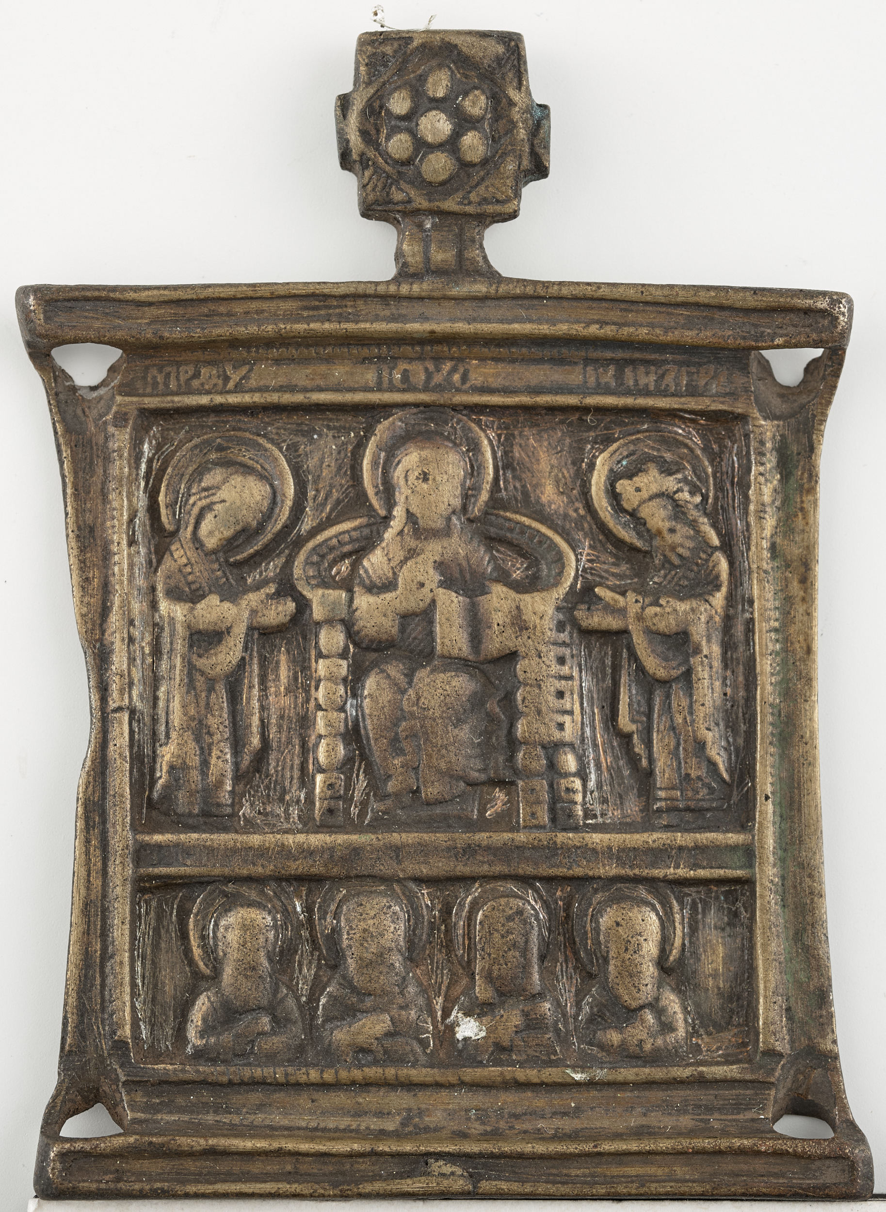 Deesis z greckiego oznacza błaganie, prośbę. Od wczesnego chrześcijaństwa prośby modlitewne zawarte są w tekstach liturgicznych: dziękczynnej modlitwie eucharystycznej, modlitwach błagalnych, w których Kościół ucieka się do orędownictwa Bogurodzicy, Jana Chrzciciela, aniołów, apostołów, męczenników, świętych, którzy zanoszą modlitwy wiernych do Chrystusa. Wizerunek Deesis, znany od VI – VII w., został utrwalony od X w. po okresie obrazoburstwa w kilku wariantach, począwszy od wersji podstawowej ze stojącym lub tronującym Chrystusem – Pantokratorem Wszechwładcą i zwracającymi się do niego największymi orędownikami ludzkości, Bogurodzicą i Janem Chrzcicielem (patrz S.12824MŁ), a skończywszy na Wielkiej Deesis poszerzonej o archaniołów, apostołów, męczenników, wybranych świętych (S.12788MŁ; S.12830MŁ). Prezentowana ikona Deesis jest fragmentem odlanego w metalu tryptyku (zachowane środkowe skrzydło) spopularyzowanego w środowisku staroobrzędowców. Oprócz klasycznego trójosobowo „trymorphonu” – tronującego Pantokratora, Bogurodzicy i Jana Chrzciciela, na dole umieszczono wybranych świętych: Leoncjusza Rostowskiego, św. Mikołaj oraz Zozyma i Sawacjusza Sołowieckich. Biskup Mirry św. Mikołaj, między innymi patron podróżnych, był zawsze otoczony na Rusi wielką czcią. Żyjący w XI w. mnich kijowsko - peczerski Leoncjusz, zostawszy biskupem Rostowa nad Donem, nawracając pogrążoną w pogaństwie prowincję, miał ponieść śmierć męczeńską. W środowisku przeciwnych reformie liturgicznej staroobrzędowców pochodzący z XV w Zozym i Sawacjusz, założyciele pustelni, a potem monasteru na wyspach Sołowieckich nad Morzem Białym, byli stawiani jako wzór życia monastycznego. Założony przez nich monastyr, sprzeciwiający się moskiewskiej reformie patriarchy Nikona, zdobyty zbrojnie przez wojska carskie w 1676 r., postrzegany był jako ostoja tradycji prawosławnej.