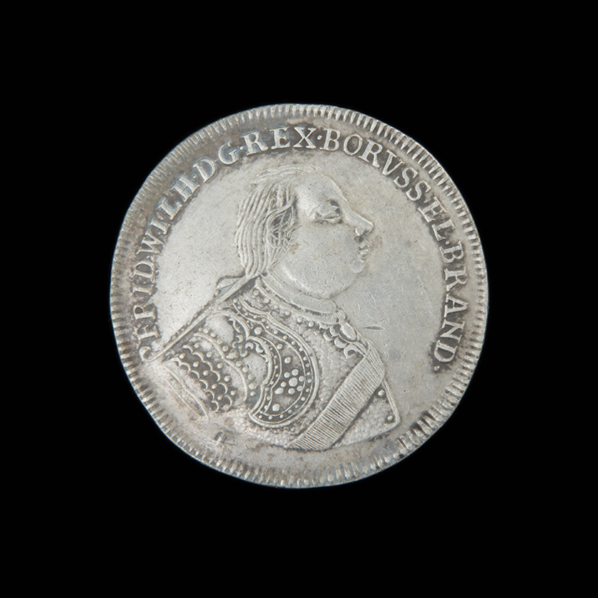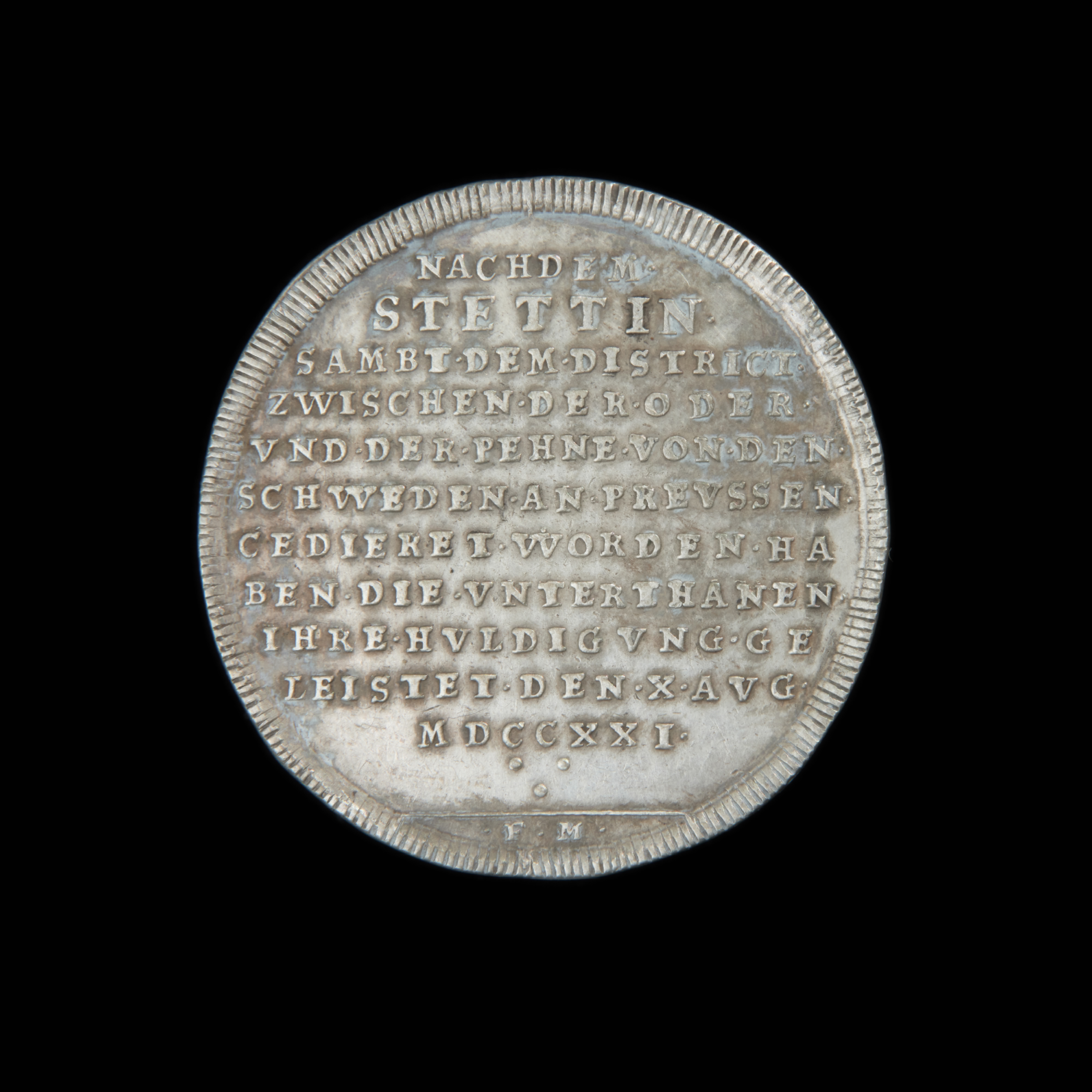 Podczas trzeciej wojny północnej (1700–1721) Szczecin dostał się pod pruski zarząd (1713). Przyłączenie części szwedzkiego Pomorza Zachodniego do Prus potwierdził pokój w Sztokholmie w 1720 roku. Szwecja przekazała te tereny oraz wyspy Uznam i Wolin za dwa miliony talarów. W 1721 roku król Prus Fryderyk Wilhelm I (1713–1740) przyjął na dziedzińcu zamkowym w Szczecinie hołd od mieszczan. Z tej okazji w Berlinie zostały wybite monety i medale okolicznościowe, w bardzo podobnych, mocno oficjalnych schematach przedstawieniowych. Półtalar nie zawiera nowych rozwiązań. Portret króla pojawia się w tradycyjnym profilowym ujęciu, w zbroi przepasanej szarfą. Długie włosy zaczesane do tyłu i związane wstążką tworzą cienki długi warkoczyk. Lekko zadarta do góry głowa ujawnia człowieka dumnego i pewnego siebie. Co ciekawe, na stemplu nie ma żadnych symboli władzy Fryderyka Wilhelma. Portretowi towarzyszy jedynie tytulatura (król Prus i elektor Brandenburgii), bez tytułu pomorskiego, w przeciwieństwie do monet Wielkiego Elektora Fryderyka Wilhelma wybitych z okazji zdobycia Szczecina w 1677 roku. Litera L pod ramieniem to sygnatura medaliera Christiana Friedricha Lüdersa. Rewers monety ogranicza się do wielowierszowego napisu w polu stempla, potwierdzającego zaistniałe wydarzenie. Inicjały FM należą do berlińskiego medaliera Friedricha Eberharda Marla, autora wielu monetarnych portretów następcy Fryderyka Wilhelma I – Fryderyka II. Panowanie Fryderyka Wilhelma I nie spotkało się z aprobatą mieszkańców Pomorza. System przez niego wprowadzony opierał się na wysokich podatkach i stałej armii, która w sojuszu z obszarniczą szlachtą (junkrami) stała się podstawą pruskiego militaryzmu.