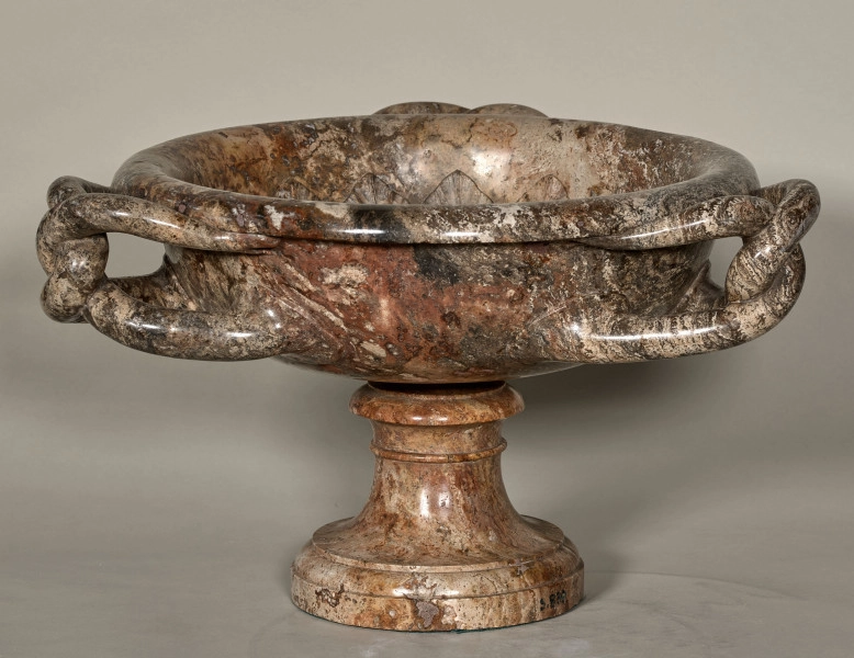 Waza z trzema uchwytami. Marmurowa, dekoracyjna waza wykonana została przez nieznanego rzeźbiarza na przełomie XVIII i XIX w., zapewne we Włoszech. Charakterystyczną cechą wazy są trzy pary dużych, splecionych uchwytów. Półkolista, spłaszczona czara z wylewem półkoliście wywiniętym spoczywa na trzonie przechodzącym w okrągłą stopę zdobioną na obrzeżu profilowaniem. Czara wewnątrz ozdobiona jest płaskorzeźbioną kompozycją przedstawiającą centralnie głowę Meduzy ujętą liśćmi lauru w koncentrycznym układzie. Głowa Meduzy wyobrażona została o twarzy młodej kobiety, ze skrzydłami we włosach i parą splecionych węży pod podbródkiem. Meduza to postać w mitologii greckiej, była najgroźniejszą z trzech sióstr Gorgon - potworów. Waza ta wymieniona jest w inwentarzu zamku łańcuckiego z 1862 r. (s. 186): „Waza z marmuru różowego i popielatego – płytka, o trzech uchach przeplatanych, z twarzą wewnątrz wykutą”. Zdobiła Galerię Rzeźb, gdzie eksponowana jest do dziś.