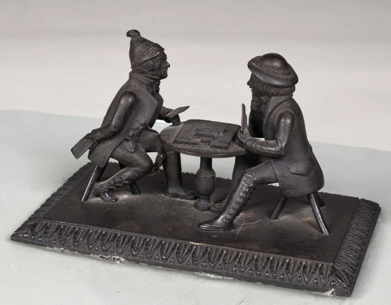 Przycisk na podstawce – figury dwóch mężczyzn grających przy stoliku w karty.