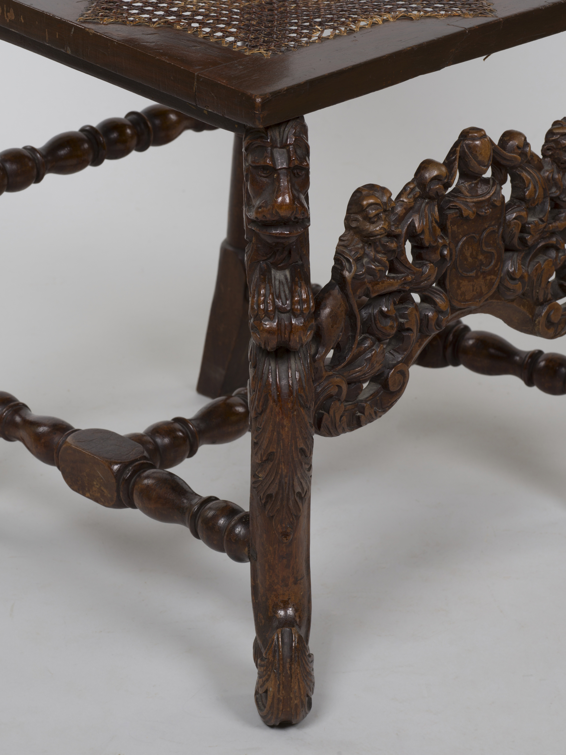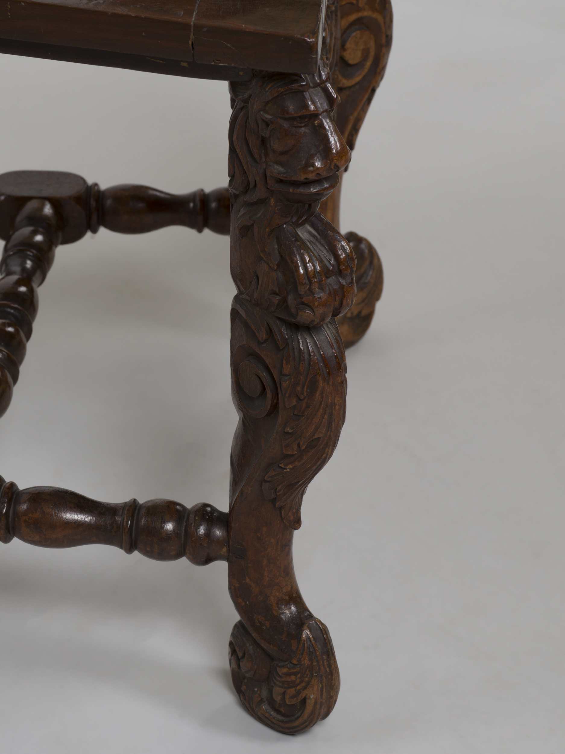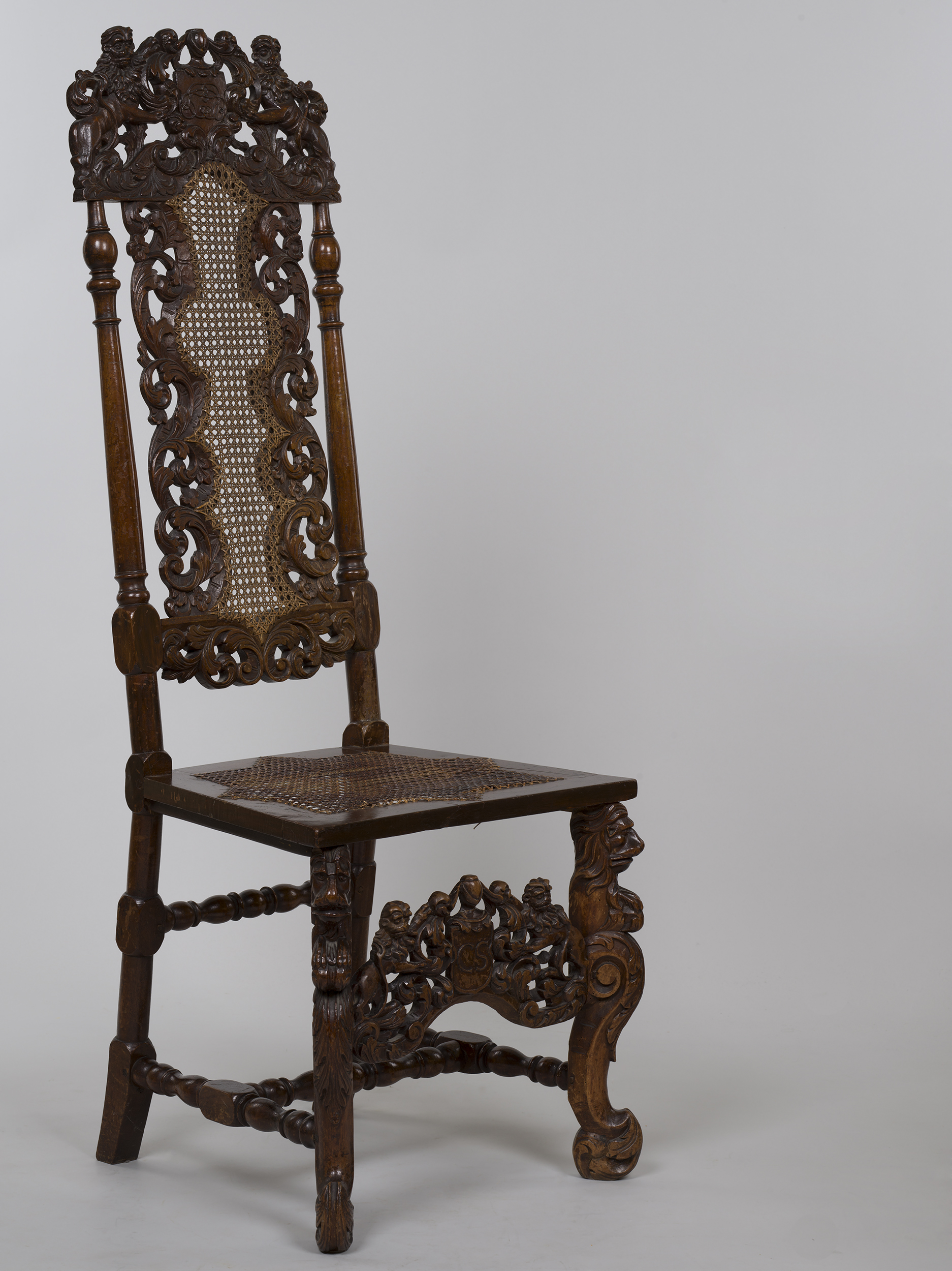 Mebel w stylu niderlandzkiego baroku o bogato rzeźbionych częściach konstrukcyjnych zdobionych motywem liści akantu, kolumienek w oparciu pleców i stylizowanych lwich głów u nasady przednich nóg. Ażurowe oparcie pleców i siedzisko wypełnione zostało plecionką trzcinową. W zwieńczeniu oparcia tarcza herbowa, z nie zidentyfikowanym wiązanym monogramem podtrzymywana przez dwa lwy. Podobna dekoracja znajduje się na ażurowym wiązaniu przednich nóg; na tarczy herbowej podtrzymywanej przez dwa lwy znajduje się monogram C S. Pierwotnie krzesło wchodziło w skład wyposażenia Biblioteki Wilanowskiej co zostało uwiecznione na obrazie Wilibalda Richtera Willanów, Biblioteka Augustostwa Potockich dawna Sala Uczt Jana III. W 1867 r. rejestrowano je w Galerii Obrazów Muzeum zwanej, w okresie przed II wojną światową pełniło funkcje użytkowe prywatnych pomieszczeń rodziny Branickich, w jadalni prawego skrzydła. Obecnie eksponowane jest w apartamentach królewskich pałacu wilanowskiego.