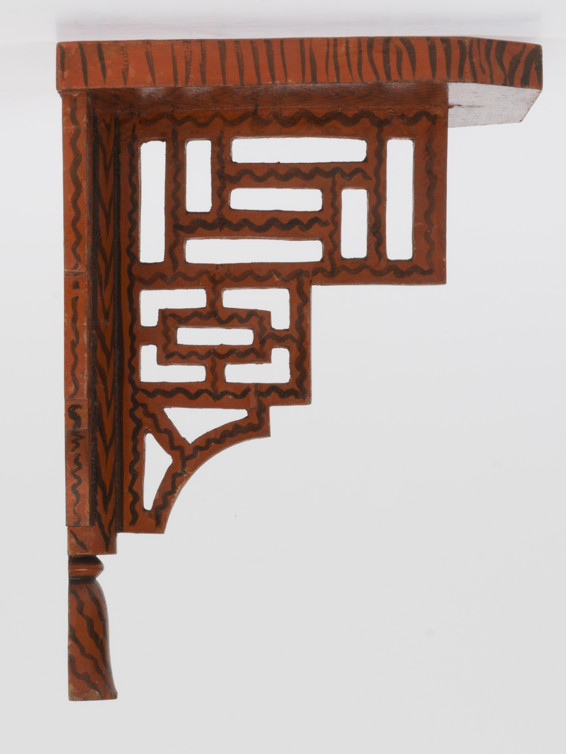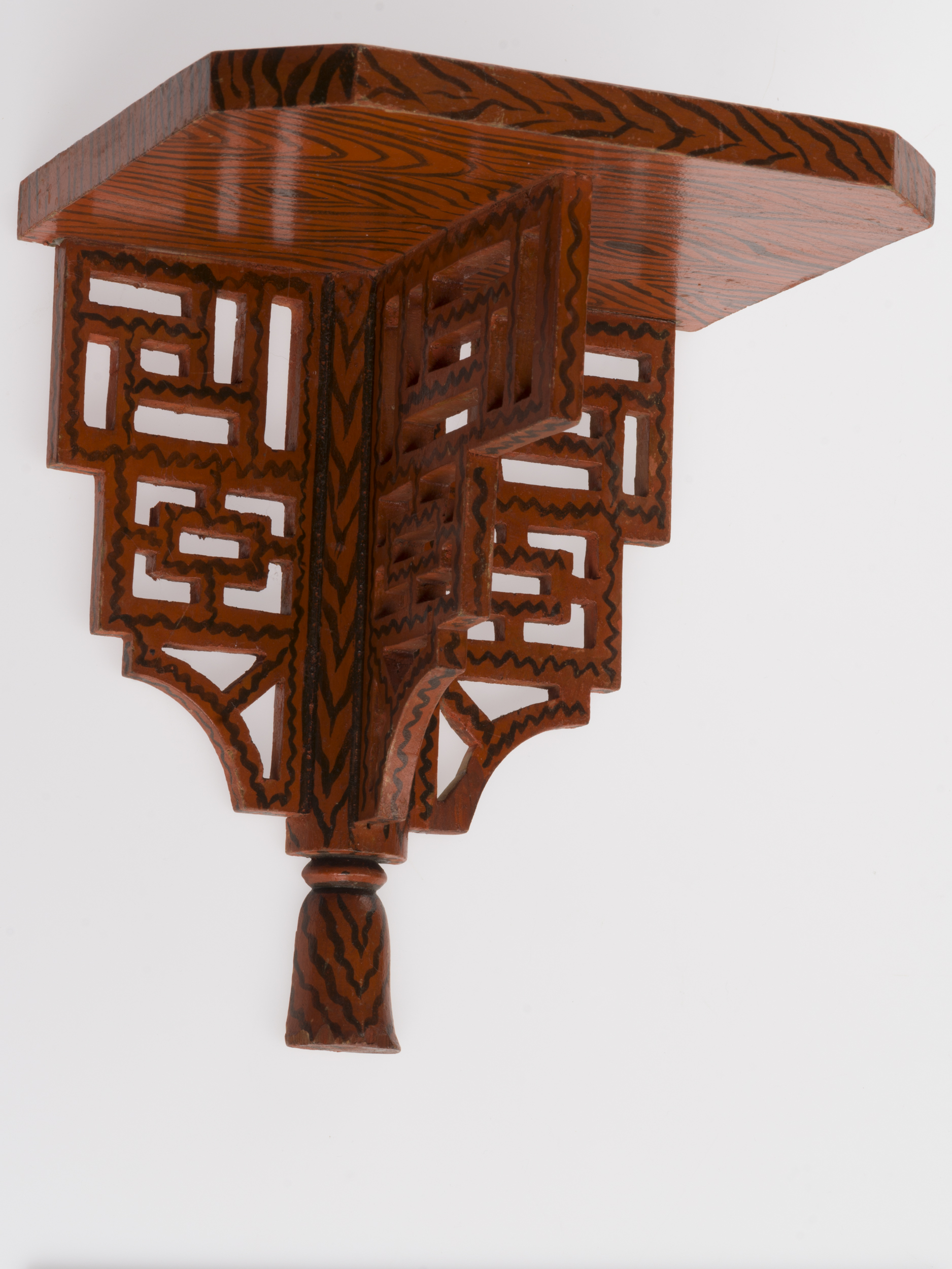 Niewielka konsolka ścienna, pokryta czerwono-czarną dekoracją malarską imitującą rysunek słojów drewna. Na konstrukcję składa się zbliżony do kwadratu blacik wsparty na dwóch prostopadłych do siebie ażurowych płaszczyznach o geometrycznej dekoracji, schodkowo zwężających się ku dołowi i zamkniętych u podstawy toczonym elementem w kształcie dzwonka. Od tyłu znajduje się wycięty w drewnie, prostokątny w przekroju rowek, wykończony u góry prostokątem z blachy, służący do zawieszania konsolki na ścianie.