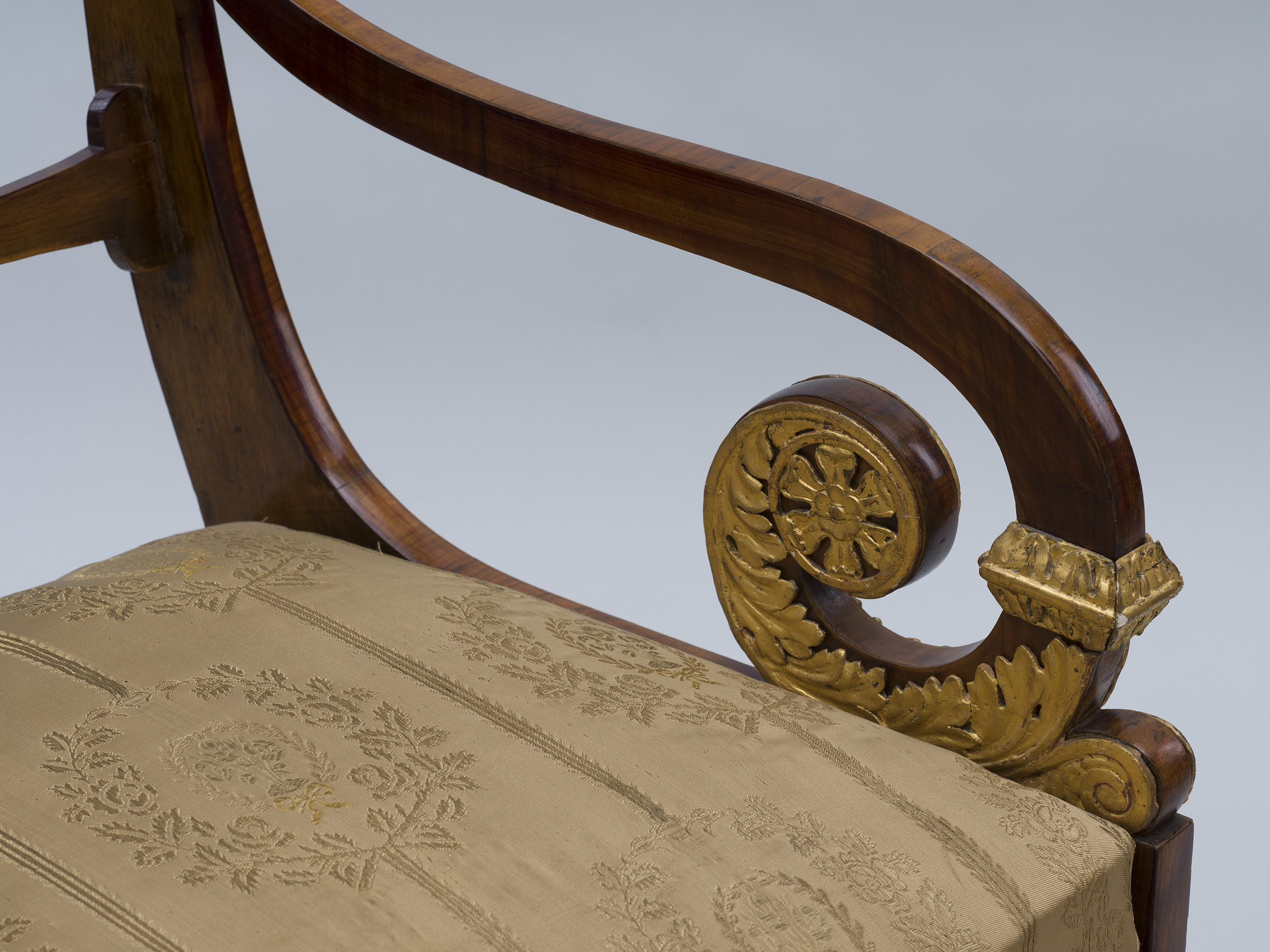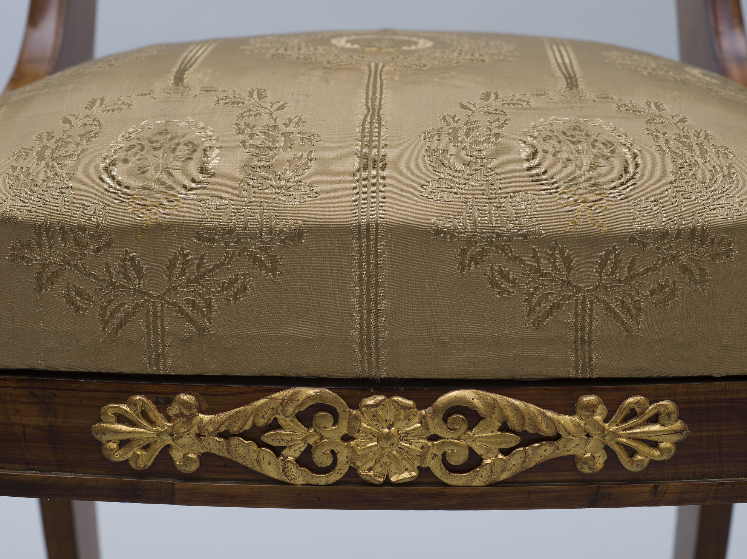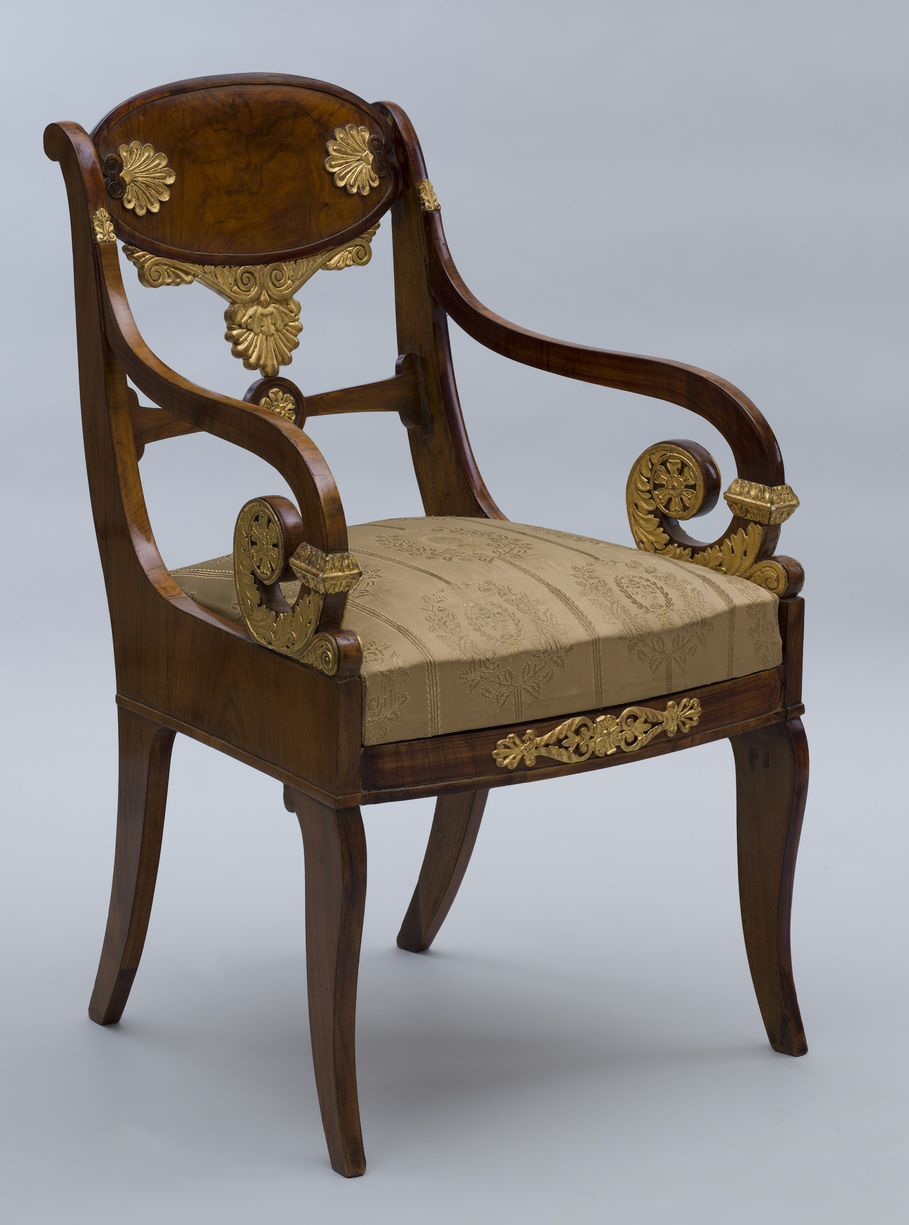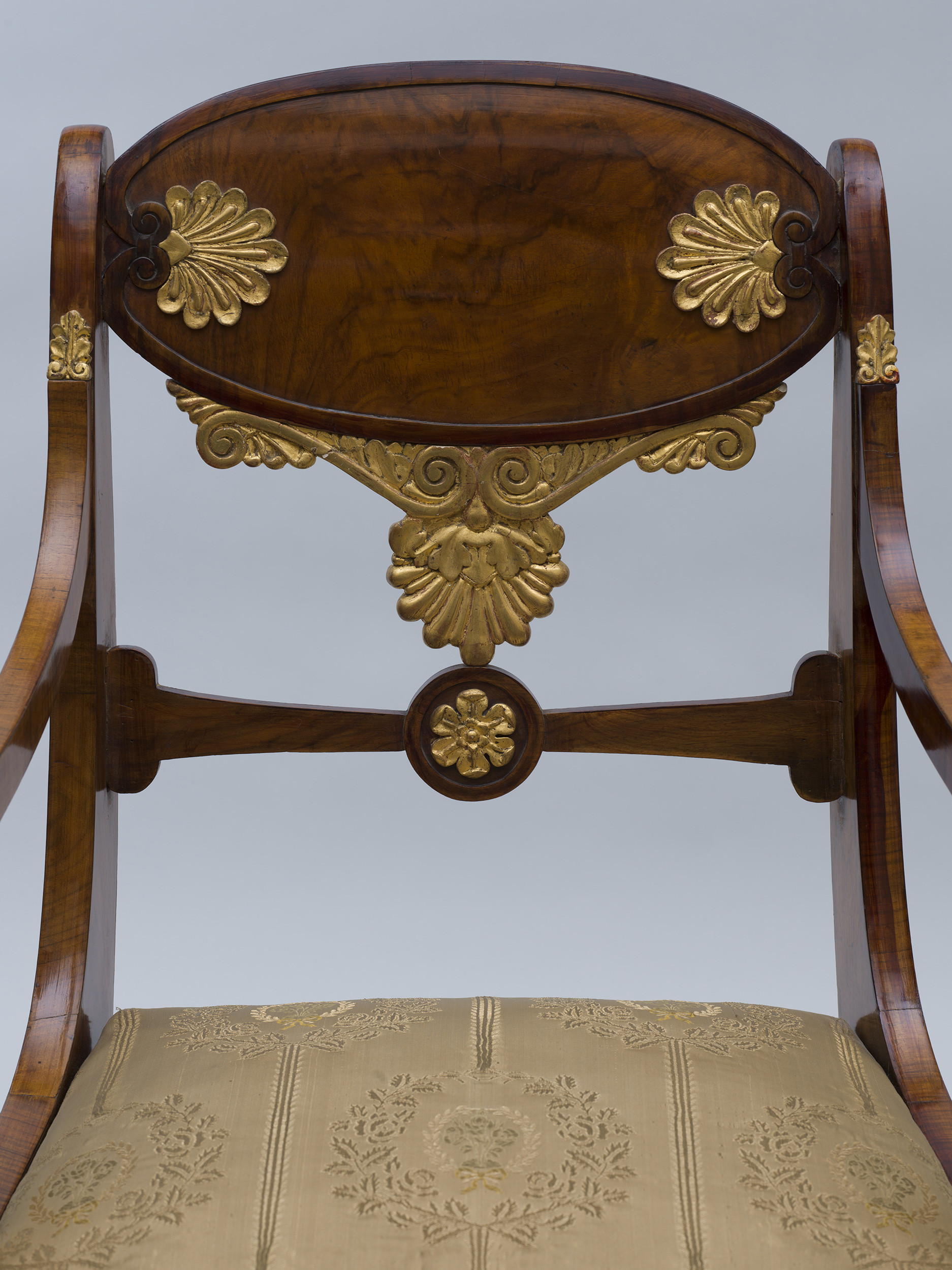 Fotel o trapezoidalnym siedzisku, na czterech wąskich szablastych nogach o przekroju prostokątnym, lekko zbieżnych, przednich wygiętych do przodu, a tylnych nieco odgiętych ku tyłowi. Oparcie lekko odchylone do tyłu, płynnie przechodzące w ramiaki boczne siedziska, dwukrotnie szersze od ramiaków przedniego i tylnego. U góry oparcia znajduje się pozioma, owalna płycina ujęta w wąską ramkę, po bokach wolutowo zwiniętą do środka od góry i od dołu. Z połączenia wolutek wyrastają ku środkowi dwie złocone palmetki. Do dolnej krawędzi płyciny przymocowana została płaskorzeźbiona złocona palmeta oparta na dwóch połączonych ze sobą pośrodku symetrycznych wolutach. Poniżej niej wąska, pozioma przewiązka, na której pośrodku umieszczona została niewielka okrągła płycina wypełniona złoconą rozetką. Poręcze w formie dużych, luźno zwiniętych wolut płynnie spływają od górnej części oparcia i opierają się na bocznych ramiakach cargi, w dolnej partii ich powierzchnie zdobią płaskorzeźbione złocone detale z motywem kimationu, liście akantu oraz rozety. Na przednim ramiaku pod siedziskiem umieszczono płaskorzeźbiony motyw złoconej rozety liściastej ujętej po obu stronach przez zwinięte na kształt liry liście akantu. Siedzisko tapicerowane, obite złocistym adamaszkiem w wąskie paski na których rozłożone są naprzemiennie duże różane wieńce.