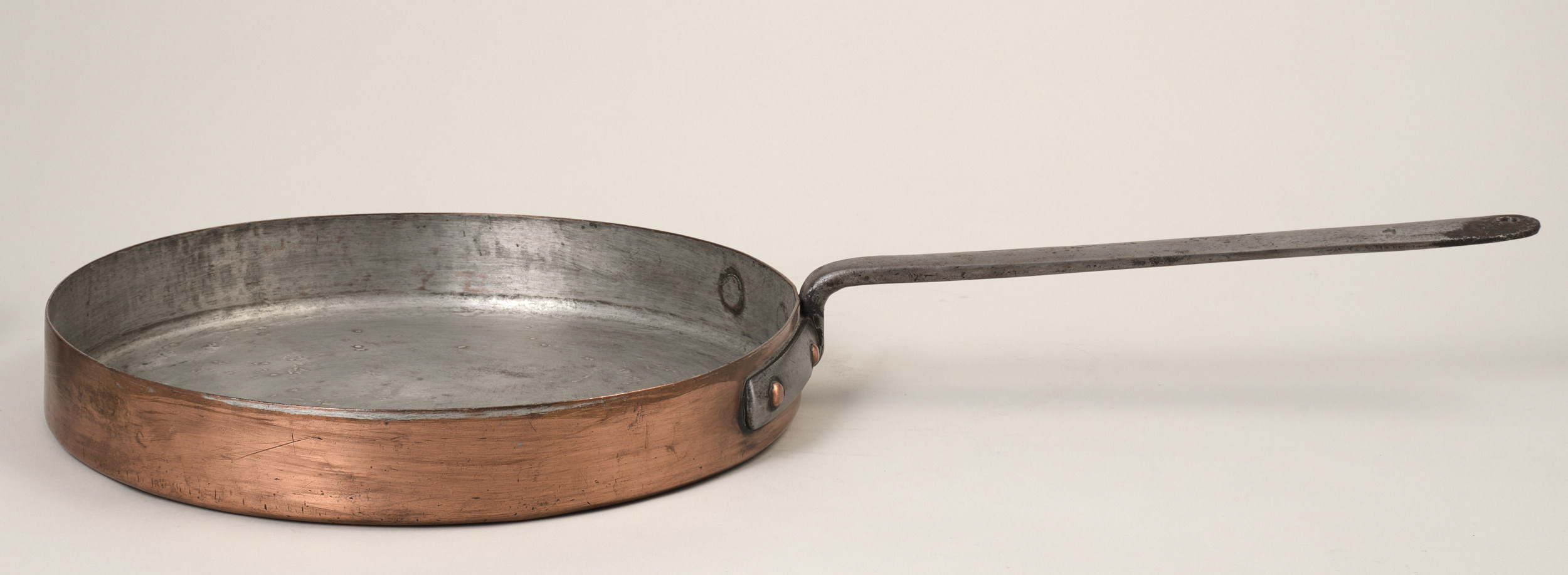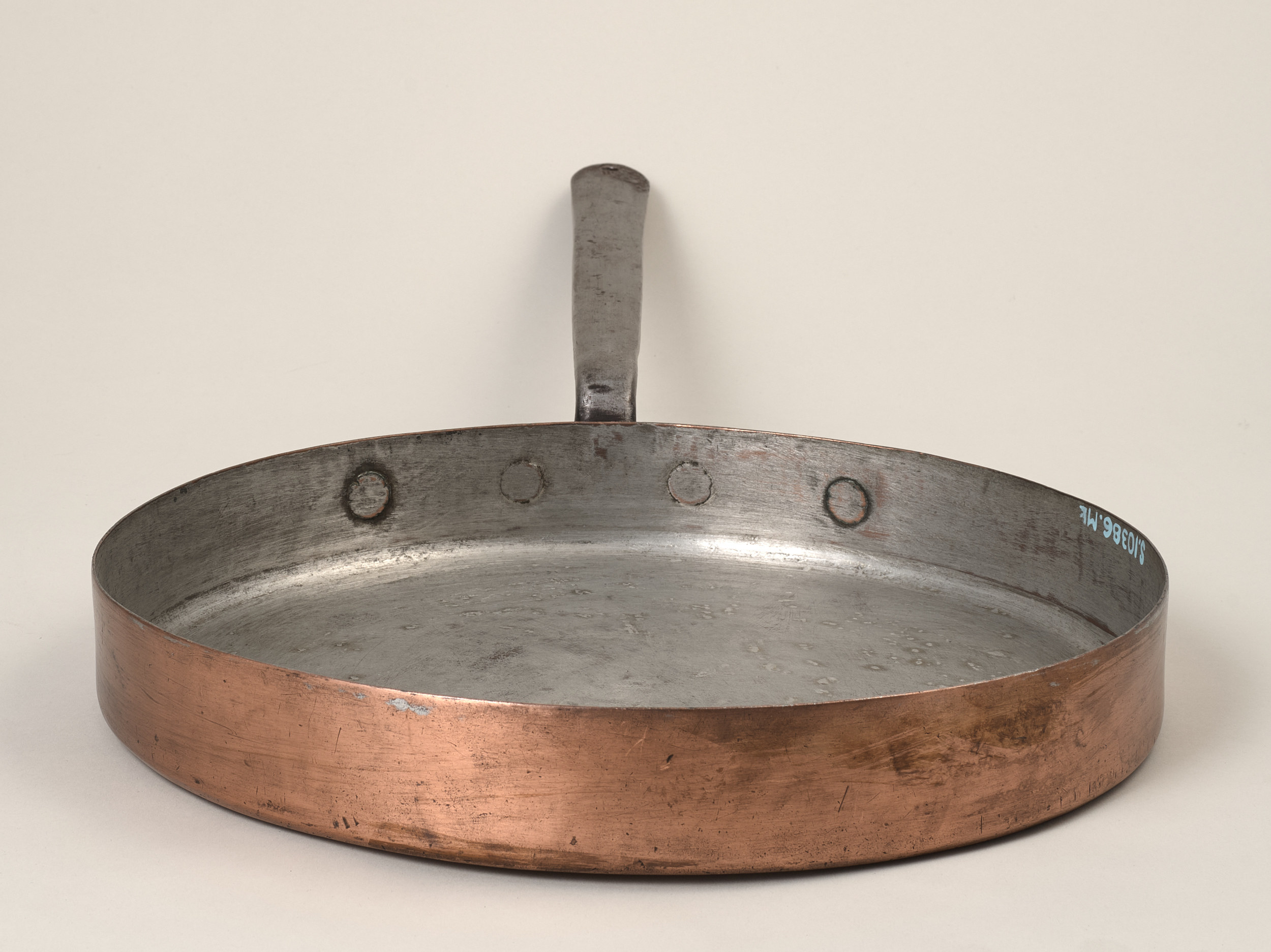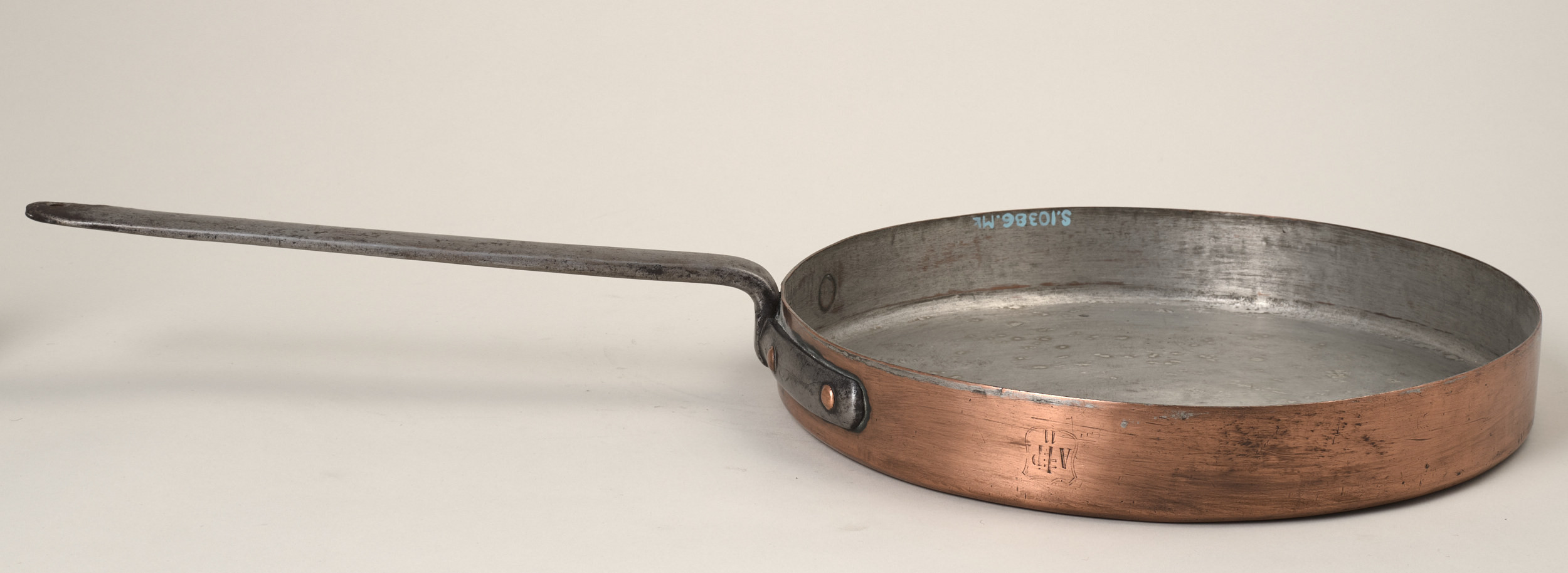 Patelnia z kolekcji Potockich, wykonana z miedzi, pochodzi, z XIX wieku. Patelnia duża, płaska, w kształcie niskiego walca, ze stalowym uchwytem. Do boku patelni przynitowana za pomocą ozdobnych nitów (czterech) ćwierćobręcz, z której poprowadzono stalowy uchwyt, plaski, prosty, lekko rozszerzający się, zakończony otworem do zawieszania patelni. Na płaszczu patelni, obok uchwytu, wybita tarcza herbowa z herbem Pilawa i literami „A” „P” po bokach. Pod herbem liczba „11”. Wewnątrz patelnia cynowana Omawiana patelnia eksponowana jest na Korytarzu Wschodnim II piętra, gdzie zgromadzone są wyroby (naczynia) z miedzi, będące w znacznej części pozostałościami po niezachowanych kuchniach zamkowych.