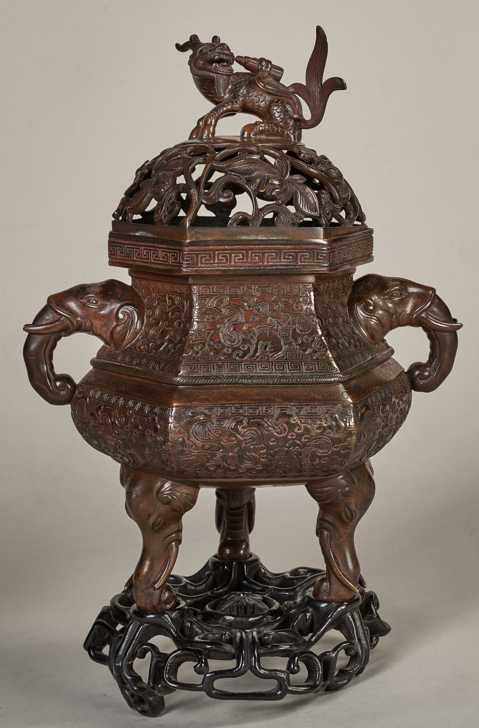 Kadzielnica na trzech nóżkach w kształcie głów słoni, na brzuścu dekoracja w niskim reliefie, maski t’ao – t’ieh na tle zwierząt lei – wen, motyw naśladujący archaiczne brązy z okresu Shang, ok 1500 – 1028 przed naszą erą. Dwa uchwyty po bokach w kształcie głów słoni. Przykrywka wypukła, wycinana w kwiaty na tle ażurowym, zwieńczona figurą mitycznego, jednorogiego zwierzęcia ch’i – lin. Pod spodem wyryte cztery znaki stylizowanym pismem pieczętnym, niezidentyfikowane. Kadzielnica umieszczona na podstawie drewnianej, ażurowej z dekoracją geometryczną. Na wierzchu okrągłe wgłębienia na nogi kadzielnicy. Brąz, odlew cyzelowany, miejscami sztuczna patyna. Chiny. Kadzielnicę datuje się na koniec 19 wieku. W Chinach istnieje legenda o smoku Chi-lin zwany także Qi-Lin lub Qilin. Jest on mitycznym chińskim stworzeniem z głową smoka, tułowiem konia, pokrytym rybią łuską. Zwany również Smokiem - Koniem lub Chińskim Jednorożcem, według legendy ukazywał się nieskorumpowanym urzędnikom, którym przynosił siłę, energię, dobre zdrowie i bogactwo, jest utożsamiany z lojalnością i ochroną przed złymi duchami. Za czasu panowania dynastii Ming (1368-1644) Qilin był przedstawiany jako stworzenie z głową smoka i parą rogów. Tāotiè (w Chinach),– nazwa mitologicznego potwora i motywu ornamentacyjnego, charakterystycznego chińskich naczyń z brązu z epok Shang i Zhou. Ozdobne ornamenty (zwane maskami) naczyń ceremonialnych (ofiarnych) najczęściej przedstawiają pysk tego potwora, którego wizerunek miał odstraszać złodziei i tych, którzy zakłócają rytuały. Oba znaki składające się na nazwę tāotiè zawierają w sobie element oznaczający „jeść”, ale samo słowo pochodzi od nazwy potwora Taotie z mitologii chińskiej. Do kadzideł domowego użytku sprzedawane były małe, wklęsłe brykiety z węgla drzewnego. Zapalało się róg brykietu, a następnie umieszczało go w kadzielnicy i gasił płomień. Po tym, jak świecące iskry przemierzyły cały brykiet, gotowy do umieszczenia na nim kadzidła. Dorota Rajchert
