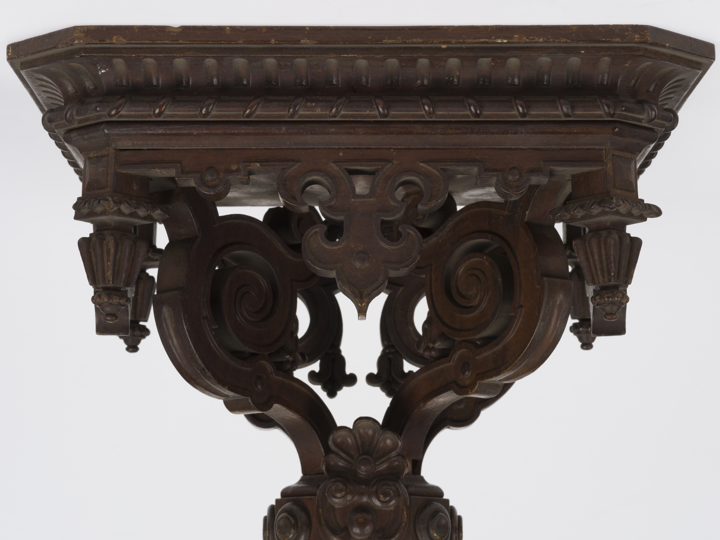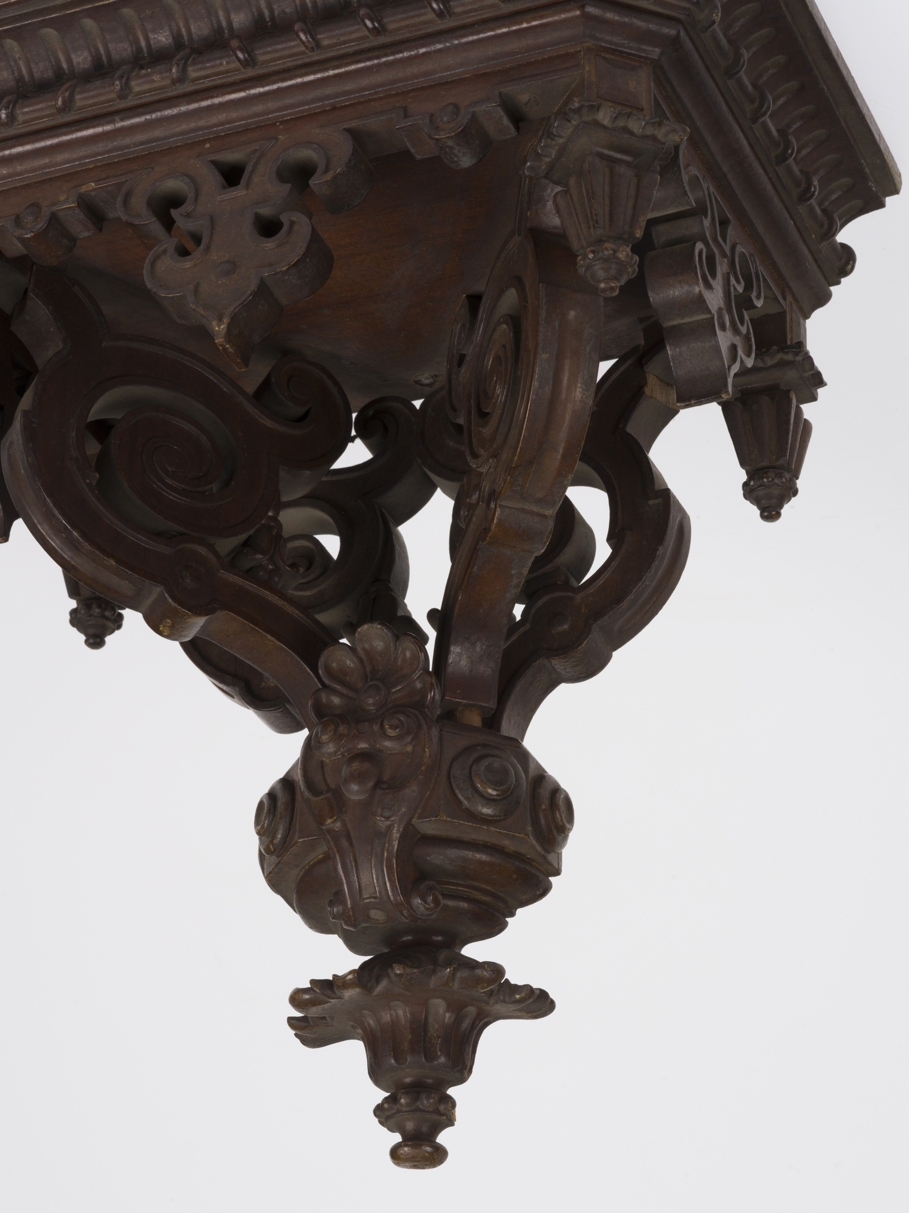 Półka konsoli prostokątna o ściętych narożnikach. Blat konsoli jest wysoki, bardzo silnie profilowany i ozdobiony wzdłuż krawędzi płaskorzeźbionym motywem ząbków oraz ukośnie zwiniętej wstęgi. Blat wsparty został na trójkątnej, ażurowej przyściennej płycinie oraz na dwóch płaskich, ażurowych wspornikach podtrzymujących go na linii ukośnej biegnącej z osi pleców w kierunku przednich narożników. Płycina i wsporniki mają formę zwiniętych wolut zdobionych kampanulami. Całość zakończona została u dołu profilowaną opaską z kartuszem i palmetą pośrodku oraz podwieszonym rzeźbionym zwisem. Pod blatem wzdłuż krawędzi podwieszony został ażurowy lambrekin o formach nawiązujących do ornamentu okuciowego. W narożnikach lambrekinu sterczą w dół cztery pełnoplastyczne, rzeźbione zwisy o graniastym zarysie.
