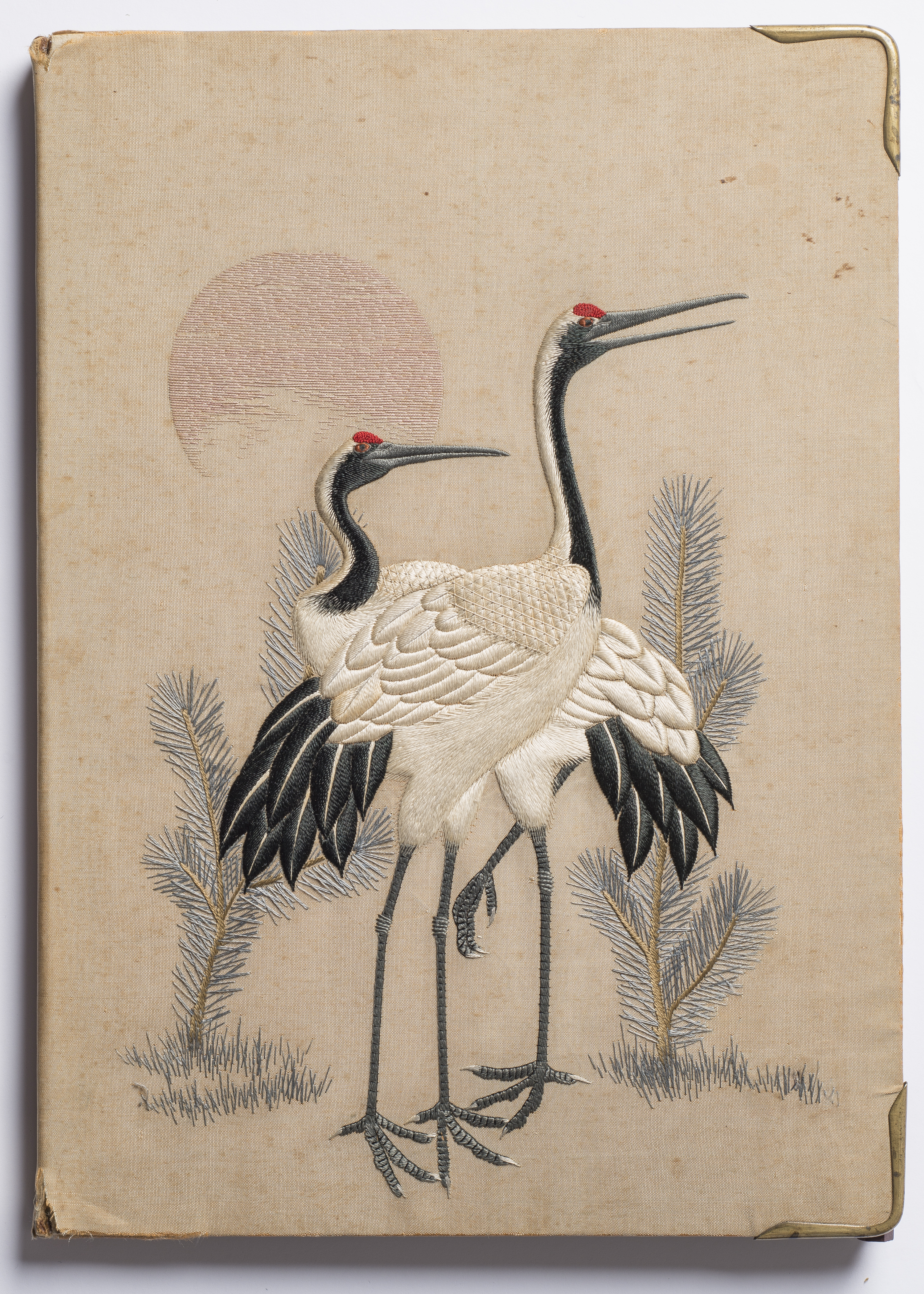 Oprawa obszyta jest na zewnątrz szarym, a wewnątrz zielonym jedwabiem. Na pierwszej stronie okładki wyhaftowano ściegiem wypukłym dwa białe żurawie i dwie małe sosny z różowym księżycem w tle. Żurawie, które są symbolem długowieczności, potraktowane zostały przez wykonawcę jak relief. Ich pióra zostały oddane półplastycznie i bardzo drobiazgowo. Z kolei mniejsze sosny i trawa u ich podstawy wyhaftowane zostały bardziej płasko, co wprowadza perspektywę do przedstawienia. Z kolei duża tarcza księżyca płaska i niecałkowicie wyhaftowana sugeruje porę dnia – zmierzch lub świt spowity mgłą.