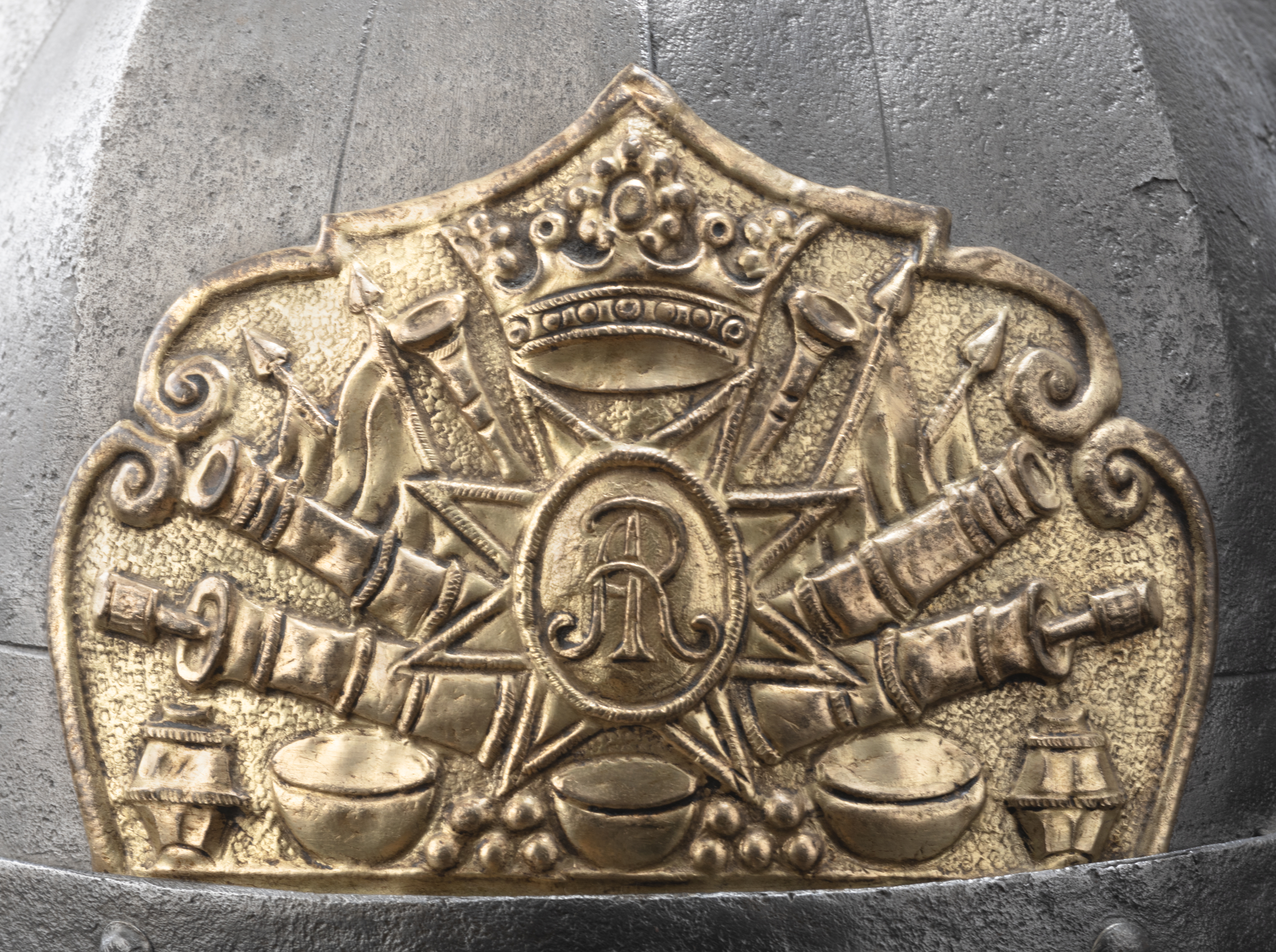 Szyszak husarski. Dzwon kopulasty, kanelowany, wykuty z dwóch kęsów blachy znitowanych ze sobą, zwieńczony dekoracyjną kopułką o pofalowanej krawędzi, wykonaną z mosiężnej, złoconej blachy i zdobioną motywami floralnymi. Na jej szczycie znajduje się wysoki, stalowy guz. Z tyłu dzwonu doczepiony pięciofolgowy nakarczek o trzech rzędach nitów. Środkowe, mniejsze, z główkami w formie kwiatów o pięciu płatkach, boczne większe i ze stalowymi główkami oraz złoconymi rozetami. Po bokach dzwonu, za pomocą dwóch par nitów o identycznych główkach jak poprzednie, doczepione są dwa półokrągłe policzki. Ozdobione są one na krawędzi szeregiem nitów o „kwiatowych” główkach, a w centralnej części złoconymi głowami maszkaronów. Pod nimi przybite dwa duże nity przytrzymujące od wewnątrz paski skóry, przez które pierwotnie przewleczone były sznurki umożliwiające zawiązanie hełmu pod brodą. W czołowej partii dzwonu zamocowana jest mosiężna, złocona ogniowo plakieta z reliefem w postaci cyfry AR w owalnym kartuszu na tle ośmioramiennej gwiazdy zwieńczonej otwartą koroną. W tle panoplium złożone z symetrycznie rozłożonych kotłów, sztandarów, trąbek, baryłek na proch, kul armatnich oraz luf dział z wyciorami. Poniżej plakiety znajduje się, przynitowany za pomocą nitów o okrągłych główkach, dziobkowaty daszek pozbawiony nosala.